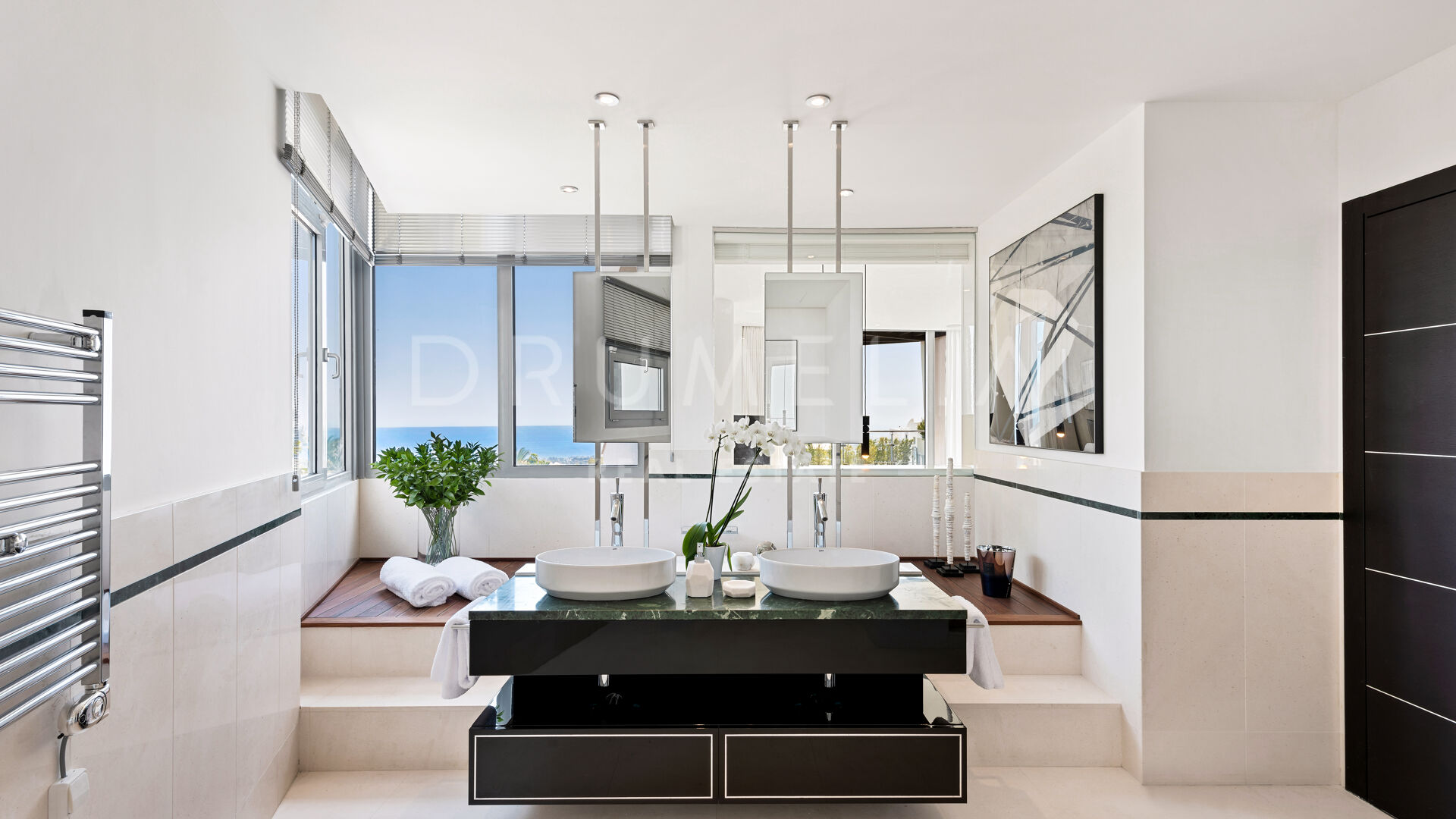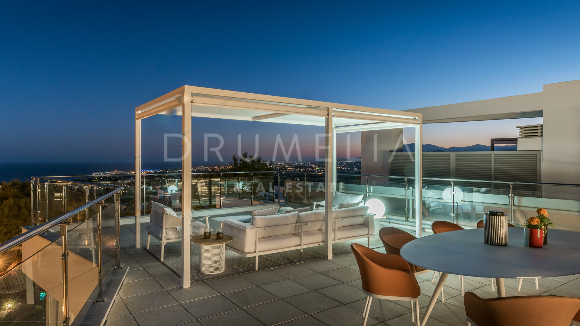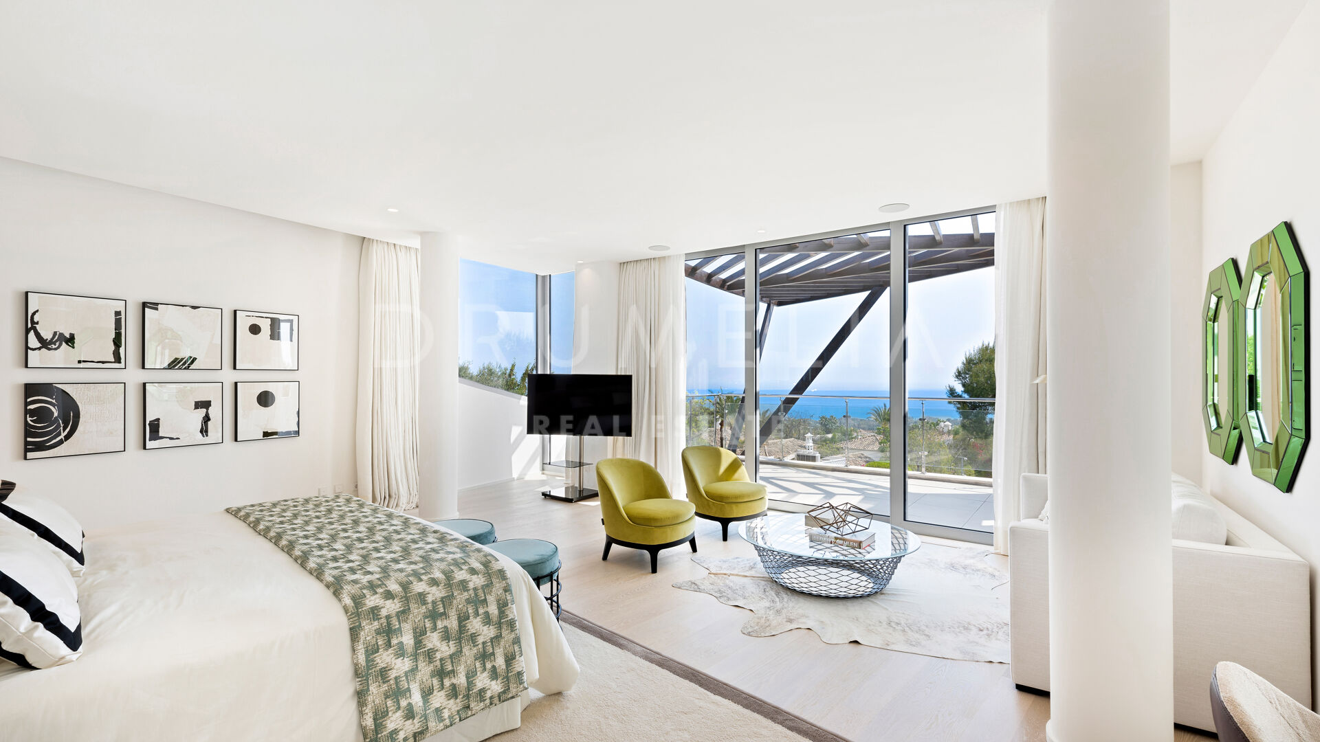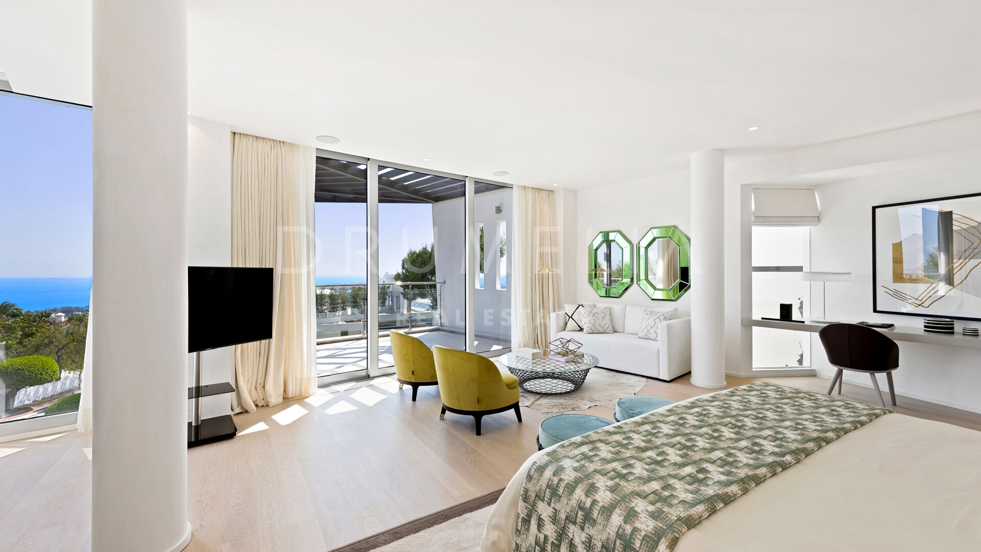 As soon as you step into this 735 m2 house, you will notice the elegance and refined materials, fully furnished with designer furniture from world-renowned Pedro Peña. It delivers generous living and dining areas, stunning 159 m2 terraces, an open plan kitchen with state-of-the-art appliances, 3 luxuriously appointed bedrooms, 3 elegant modern bathrooms, and a guest toilet. This house offers all the necessary modern comforts including a superb private swimming pool and remarkable rooftop solarium-terrace with Jacuzzi, BBQ, and seating areas where you will be delighted to enjoy the fantastic panoramic sea views. On the basement, there’s a signature TV room with high-end qualities-