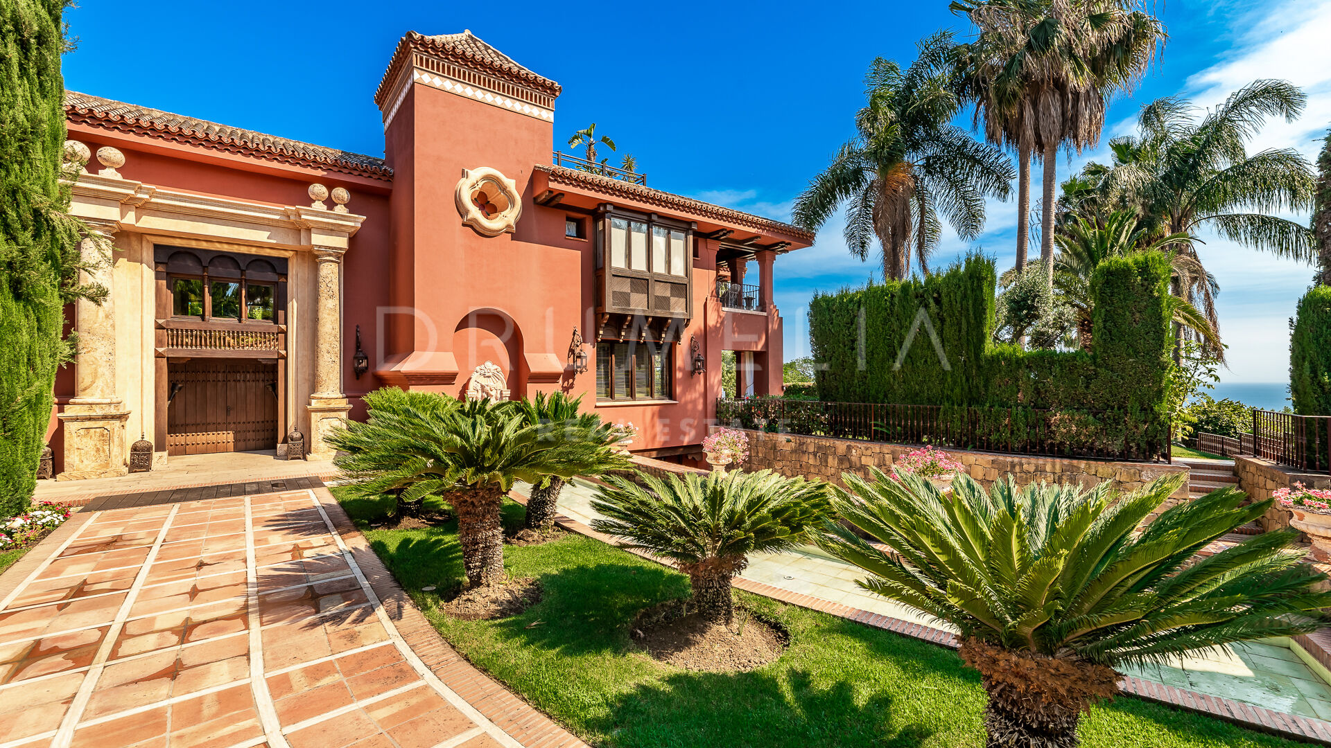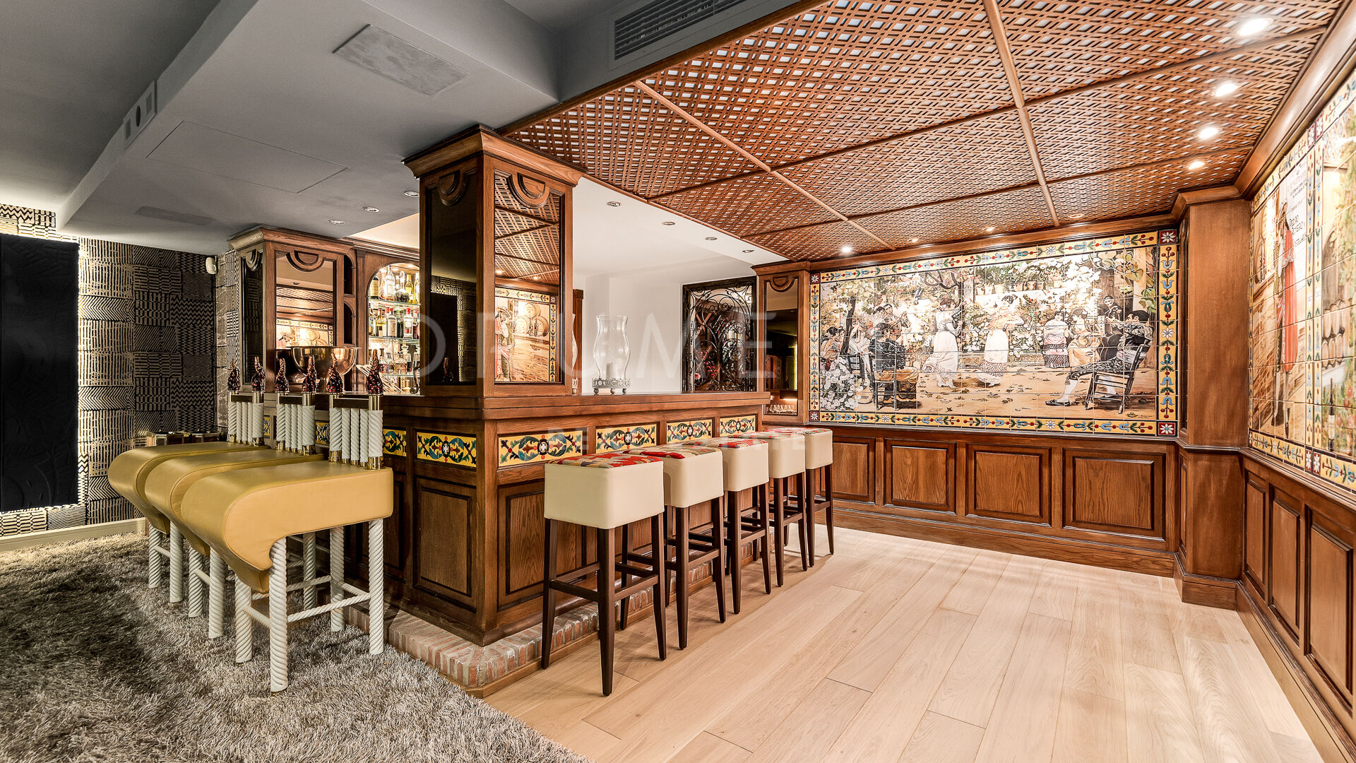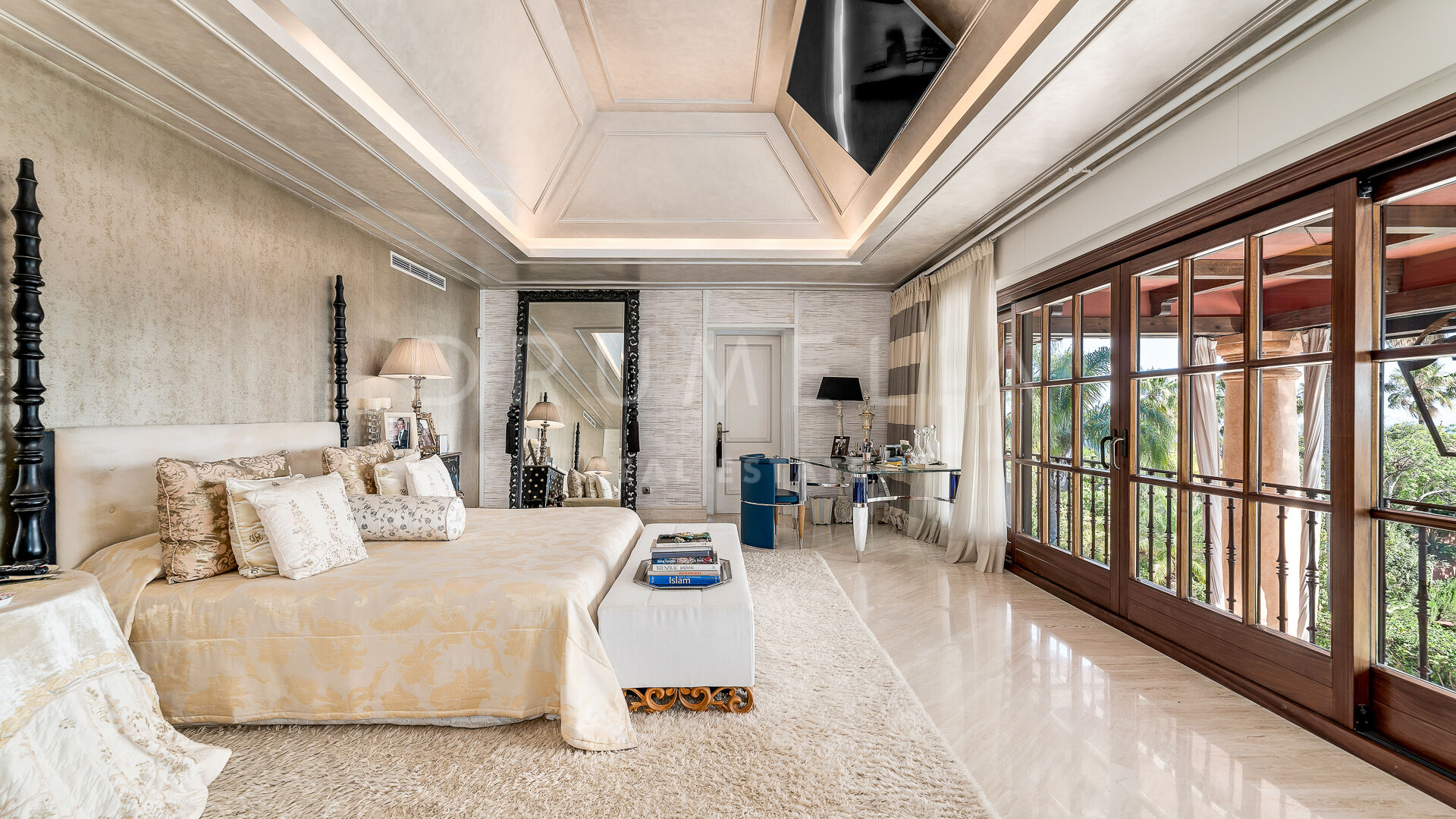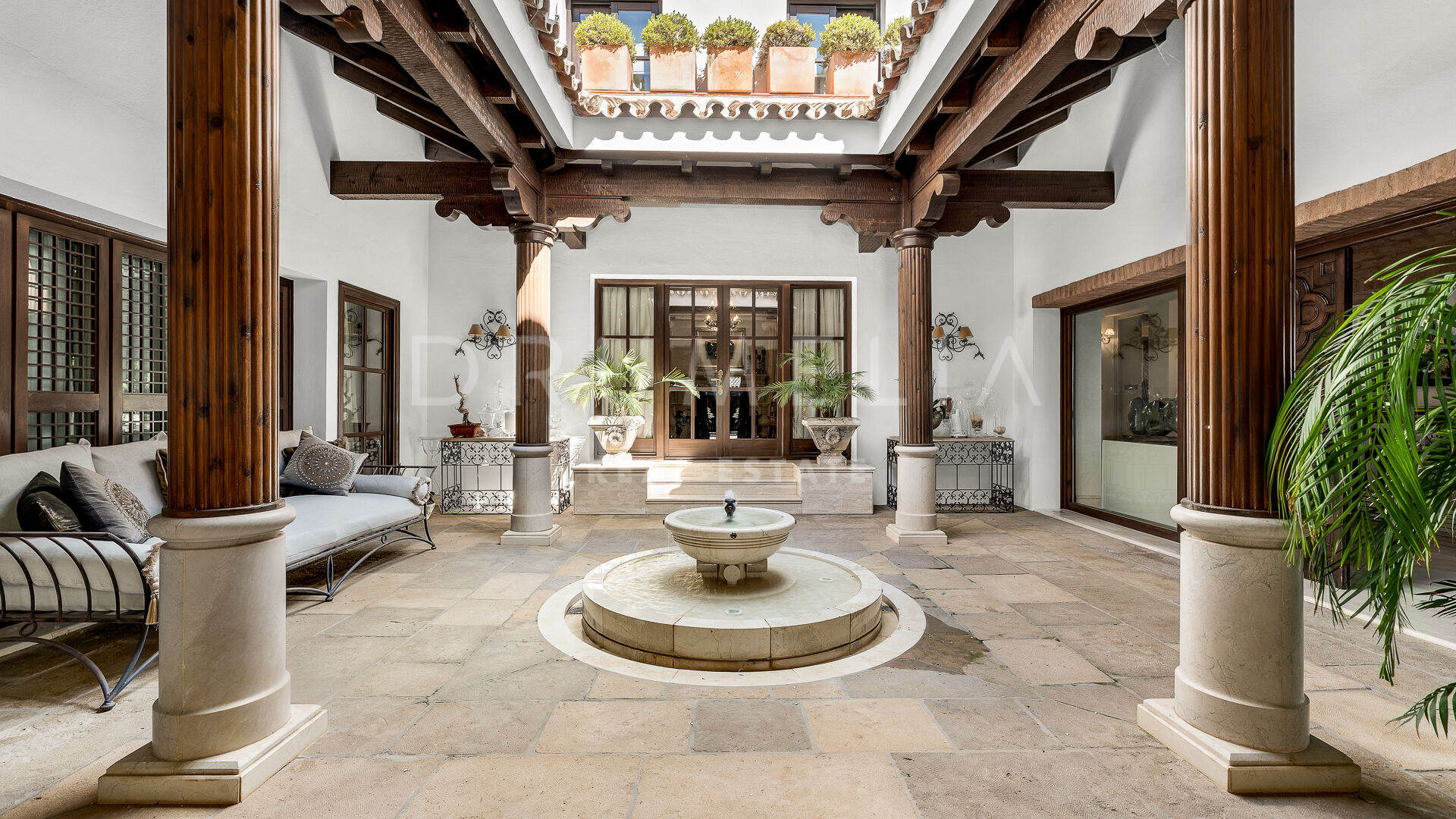 Surrounded with lush greenery and high-end properties of Sierra Blanca, the 6-bedroom villa of 1.395 m² sits on a large plot of 2055 m² that provides a lot of privacy. The mansion is a real work of art that combines elegance, style and comfort. Its classical architecture with the distinct Mediterranean elements has become a thing of beauty. You will enjoy the magnificent panoramic views of Marbella, Puerto Banus, the majestic mountains and Mediterranean Sea stretching all the way to Africa and Gibraltar. The fabulous property is distributed over 3 levels connected with an elevator. On the main floor, the Andalusian patio boasts the impressive columns, lovely exposed wooden beams and a fountain that keeps a refreshing temperature during the summer months. This fascinating patio connects 3 different areas, a guest bedroom, a fully fitted gourmet- kitchen and a spacious living area which leads to the lovely terrace, pool area and backyard.