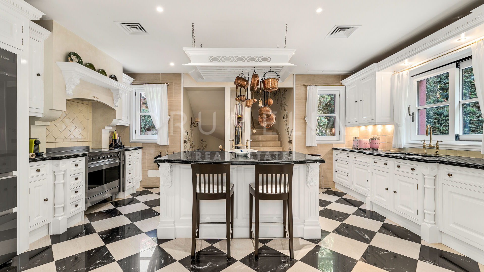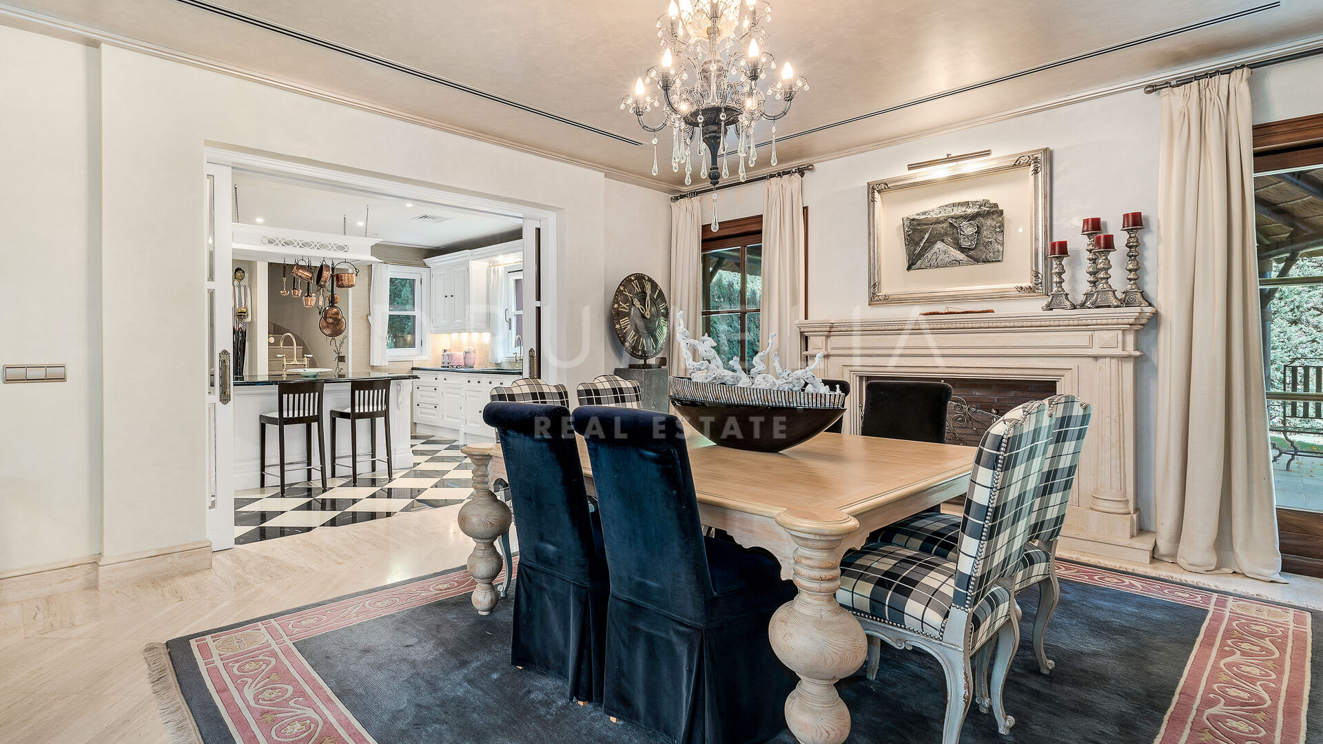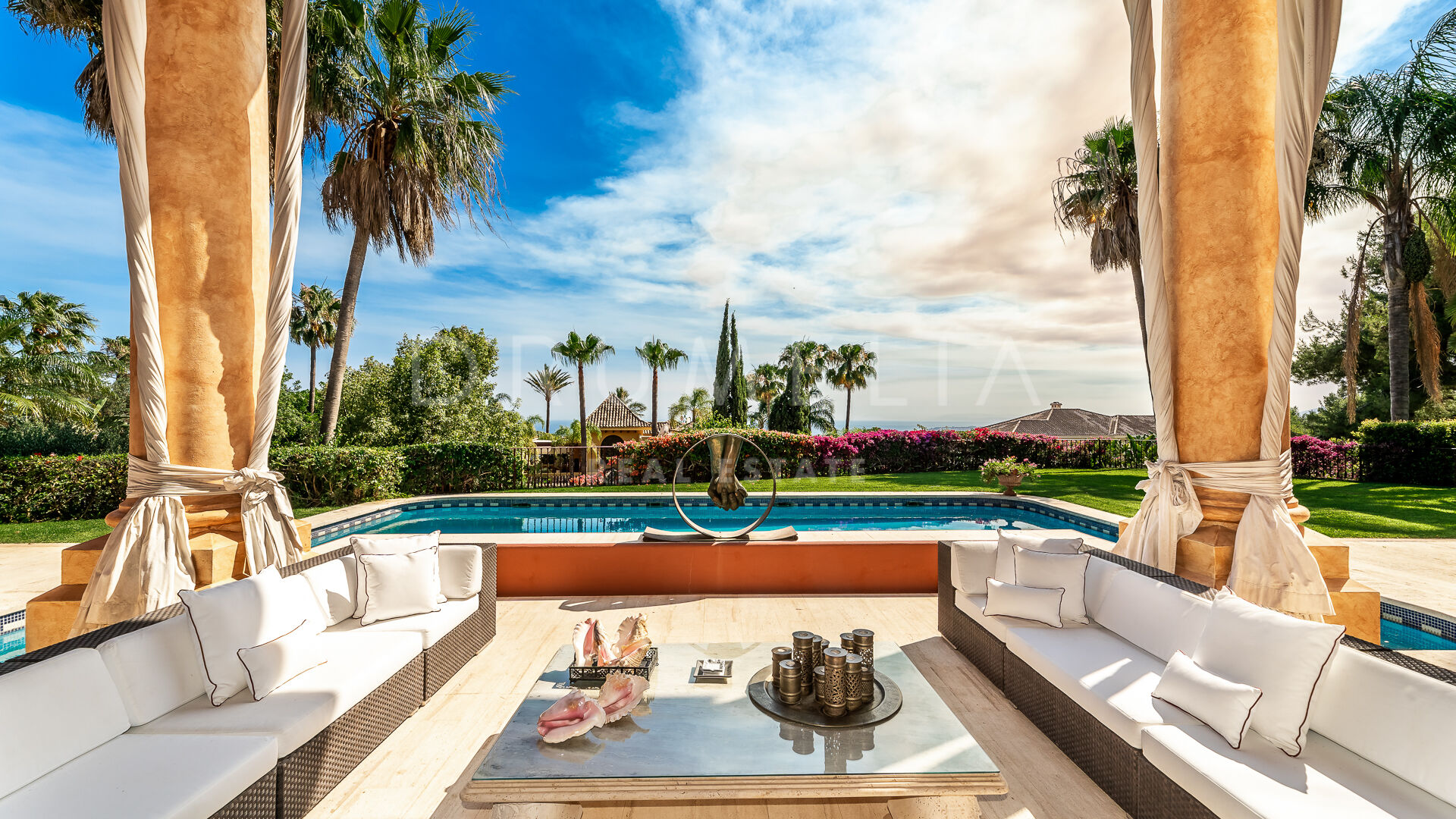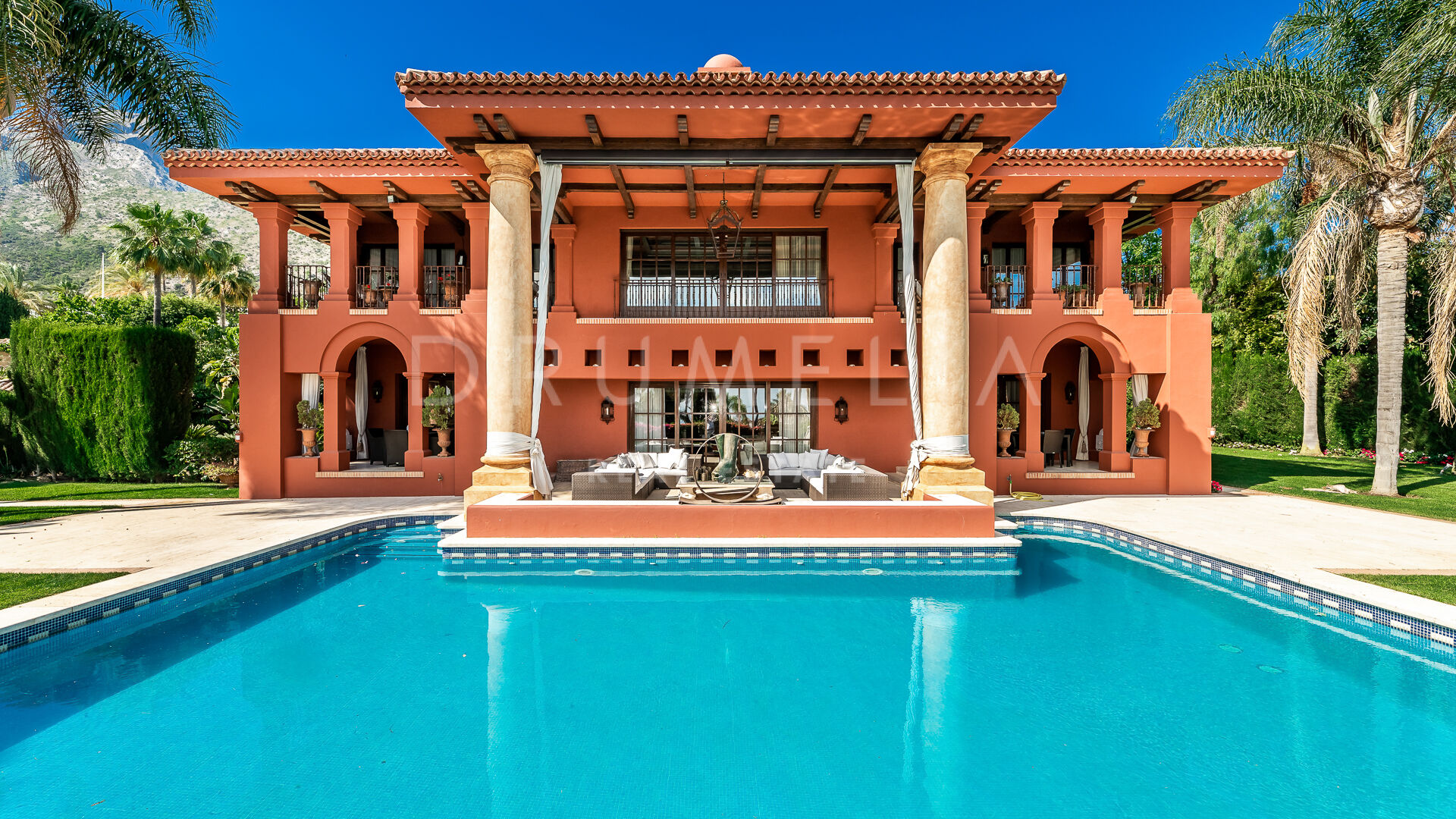 Surrounded with lush greenery and high-end properties of Sierra Blanca, the 6-bedroom villa of 1.395 m² sits on a large plot of 2055 m² that provides a lot of privacy. The mansion is a real work of art that combines elegance, style and comfort. Its classical architecture with the distinct Mediterranean elements has become a thing of beauty. You will enjoy the magnificent panoramic views of Marbella, Puerto Banus, the majestic mountains and Mediterranean Sea stretching all the way to Africa and Gibraltar. The fabulous property is distributed over 3 levels connected with an elevator. On the main floor, the Andalusian patio boasts the impressive columns, lovely exposed wooden beams and a fountain that keeps a refreshing temperature during the summer months. This fascinating patio connects 3 different areas, a guest bedroom, a fully fitted gourmet- kitchen and a spacious living area which leads to the lovely terrace, pool area and backyard.