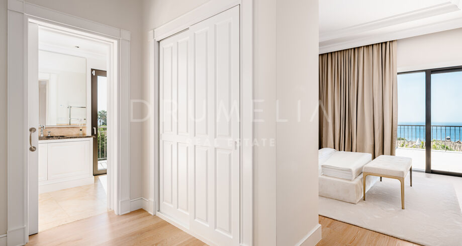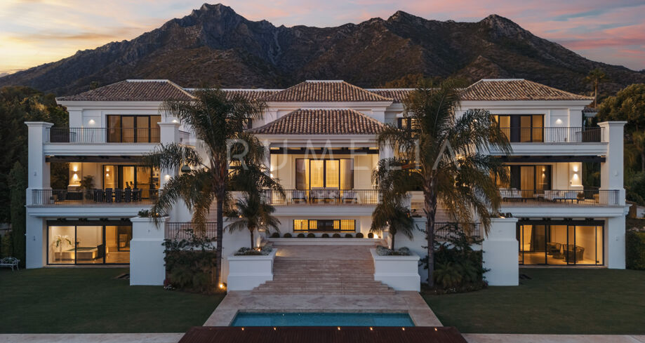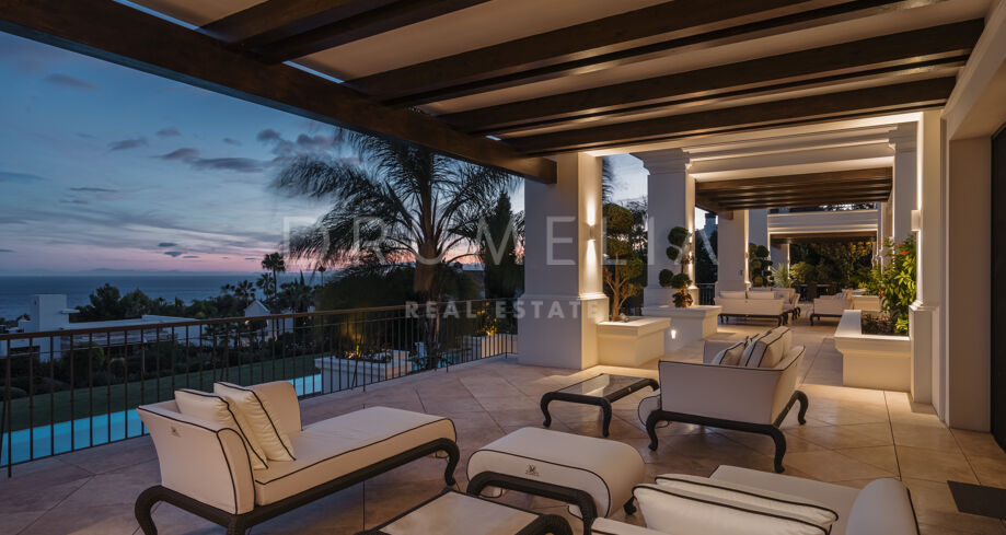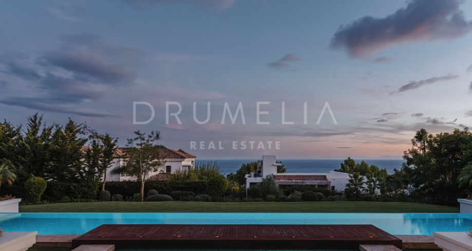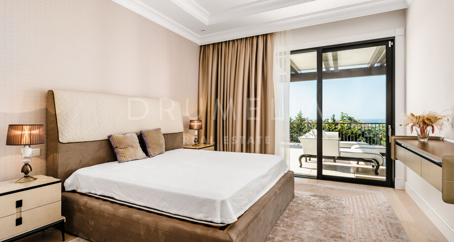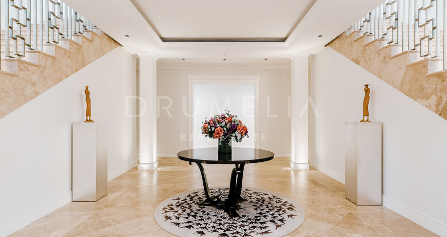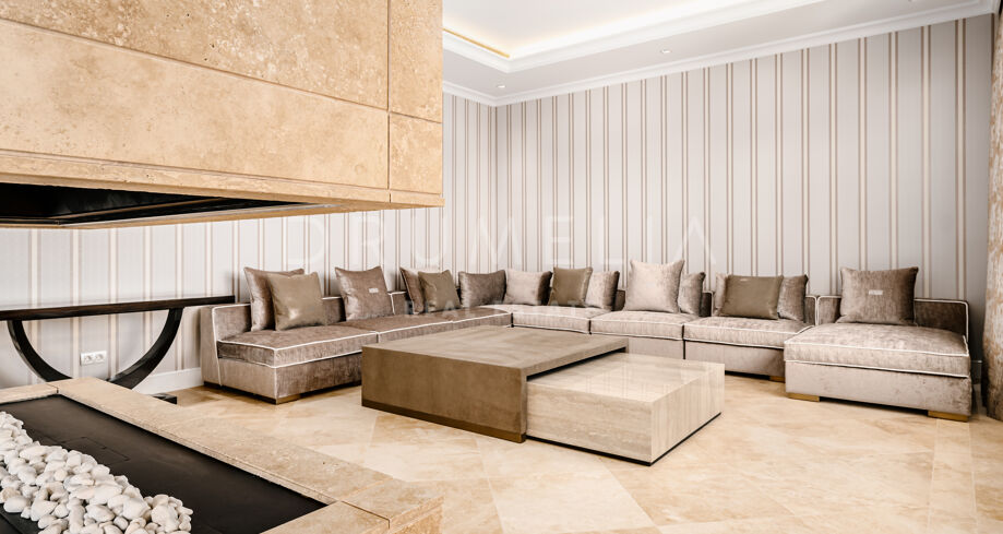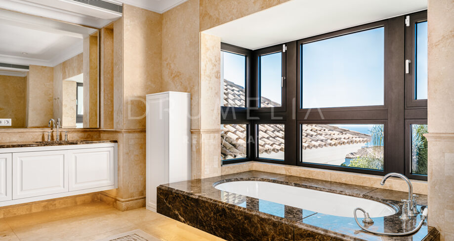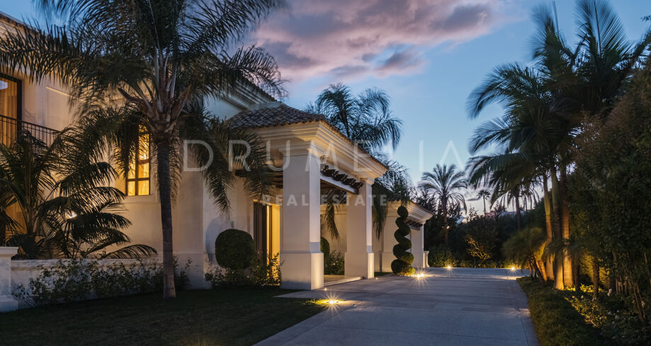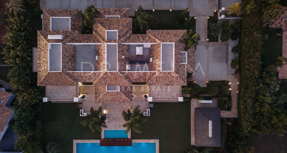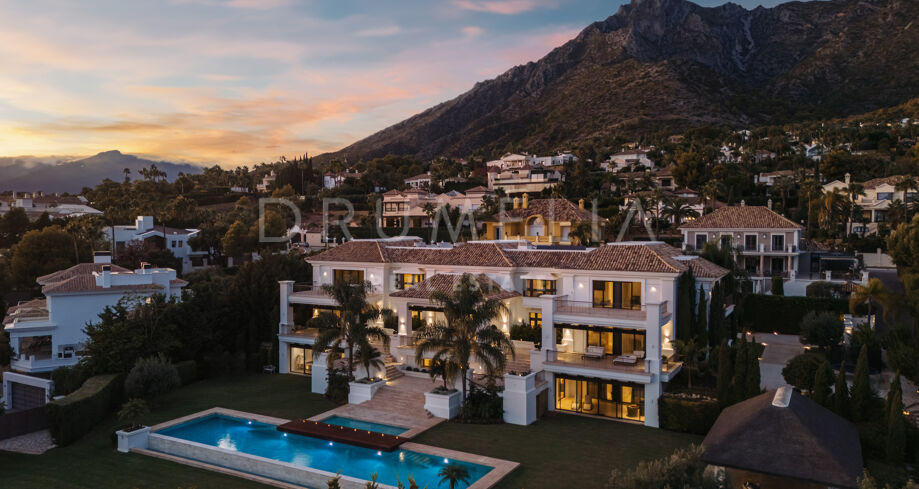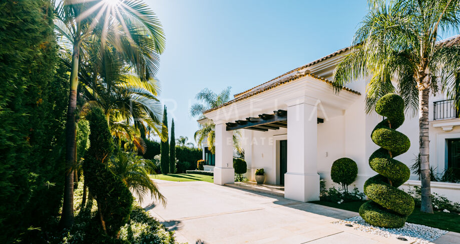 Surrounded by pine trees and greenery of the prestigious Sierra Blanca, Marbella’s Golden Mile, this magnificent, newly built private estate with a generous double plot (5106 m²!) and stunning panoramic views is a Dream House for those who prefer elegant Mediterranean style, classic chic and modern comfort.