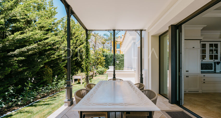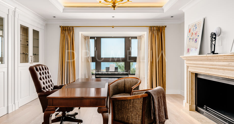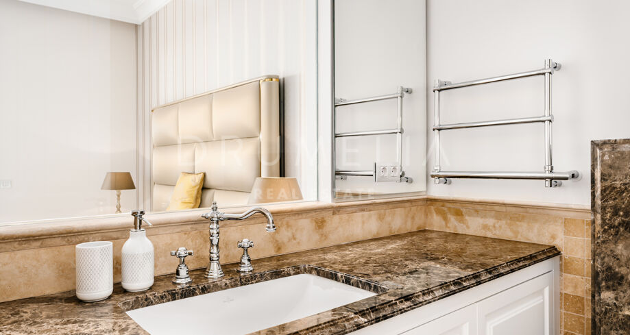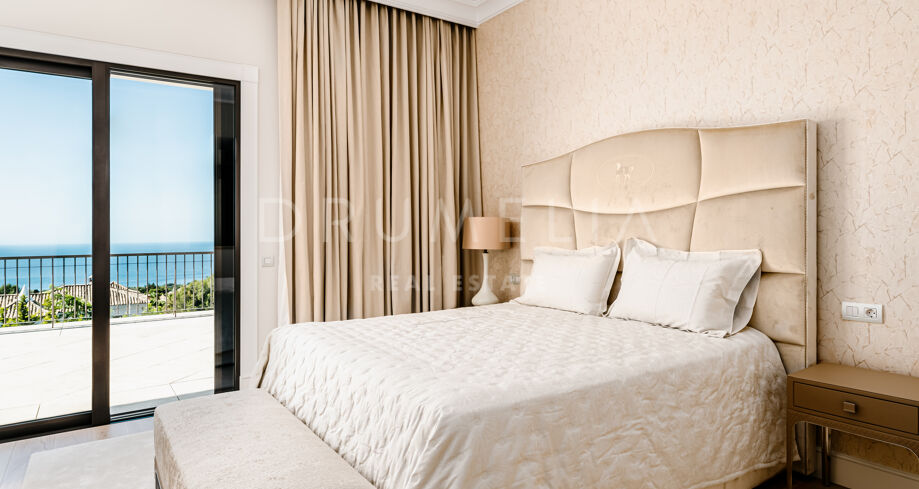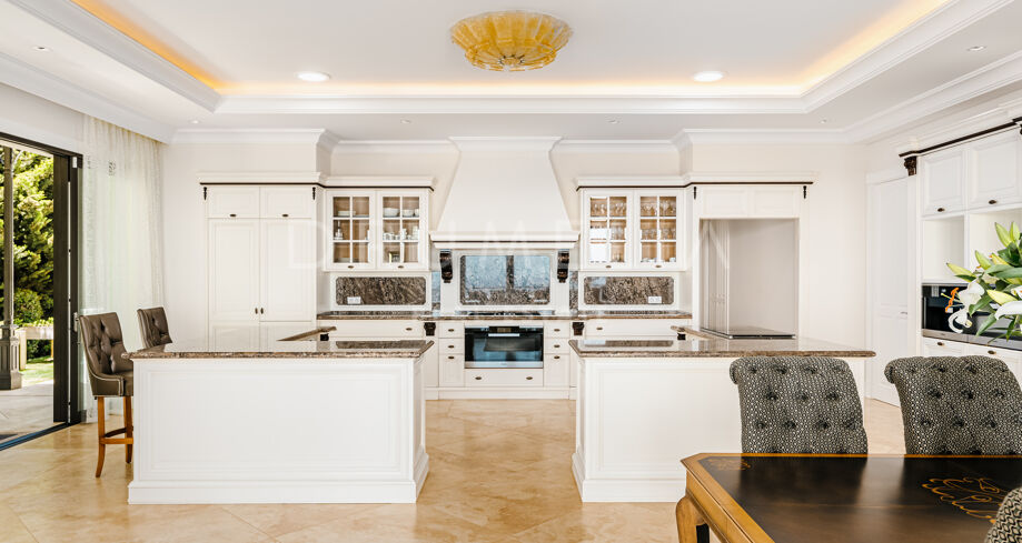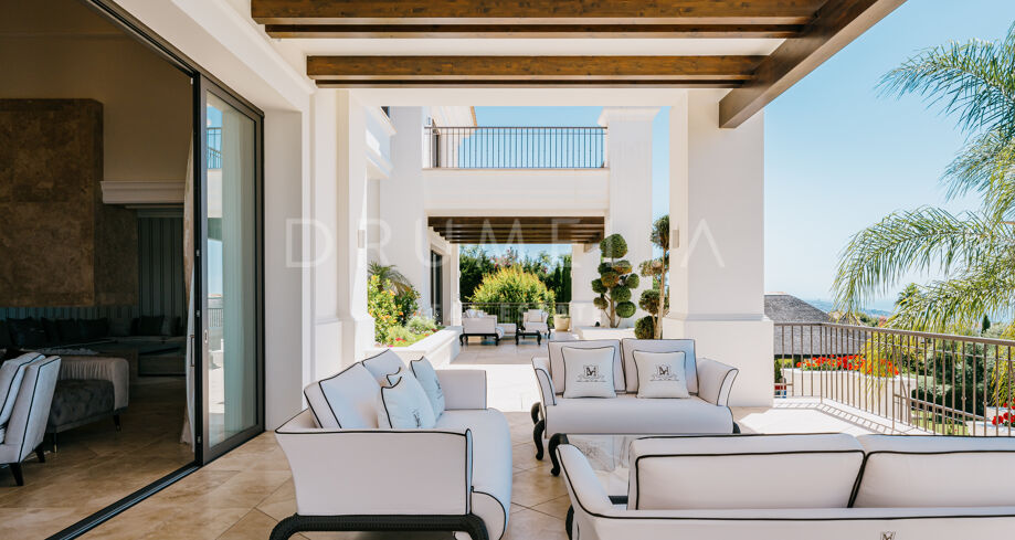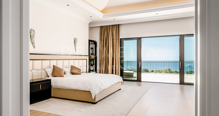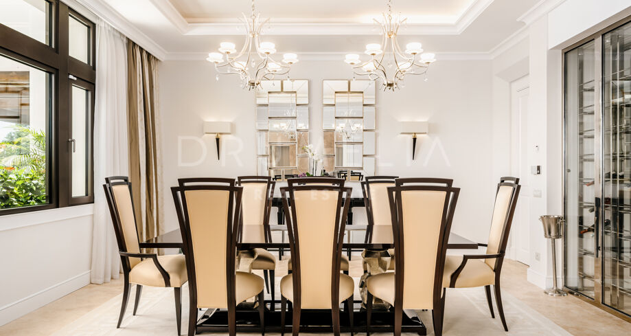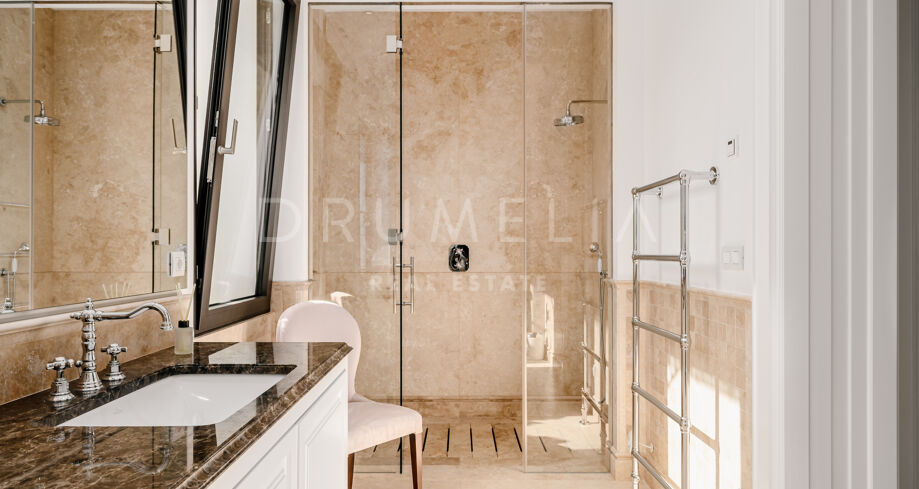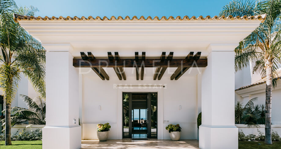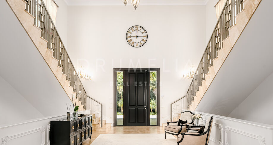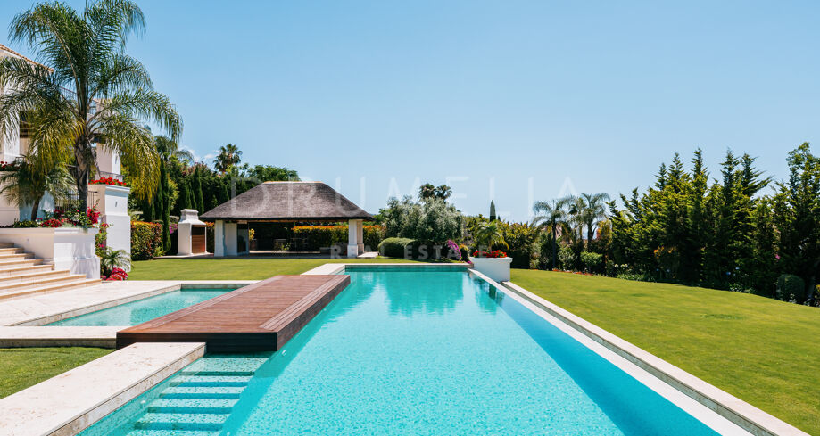 Surrounded by pine trees and greenery of the prestigious Sierra Blanca, Marbella’s Golden Mile, this magnificent, newly built private estate with a generous double plot (5106 m²!) and stunning panoramic views is a Dream House for those who prefer elegant Mediterranean style, classic chic and modern comfort.