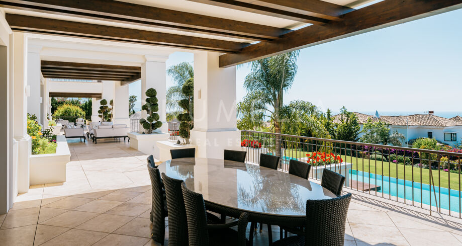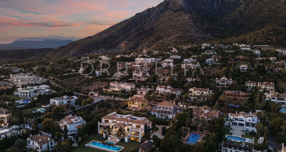This remarkable villa has an exclusive address. It is set in the old-established classy residential area, gated, with 24-h security community of Sierra Blanca, one of the best and much sought-after neighbourhoods of Southern Europe, a few minutes away from the sandy beaches, golf courses, all amenities of Marbella Centre, the famous Golden Mile, the epitome of luxury, extravagance and opulence, and Puerto Banus, the glamorous playground of the rich & famous.