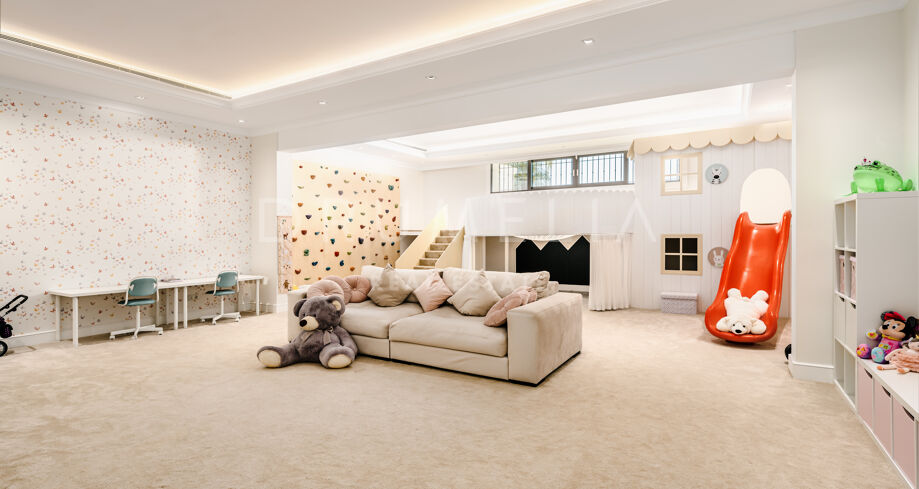 The outstanding mansion impresses the moment you enter its welcoming hall, an amazing classical double stairs foyer with double height ceiling. It leads to a spacious main living room with a modern fireplace and different seating areas, TV lounge and an exquisite formal dining room. A top-range fully-fitted open plan kitchen with breakfast area and coffee corner is united with another delightful dining area. Gorgeous!