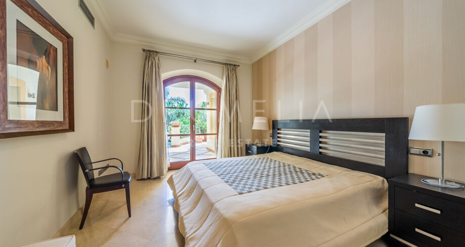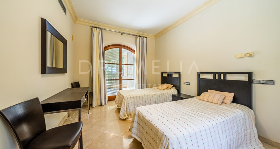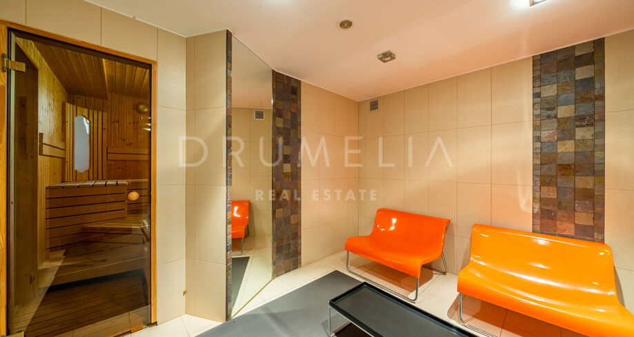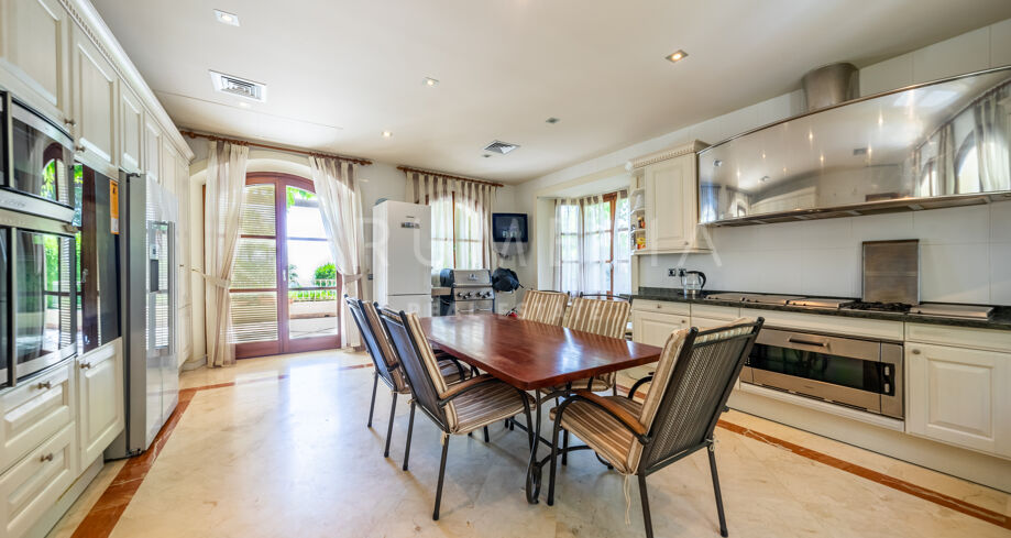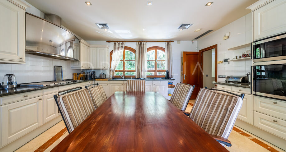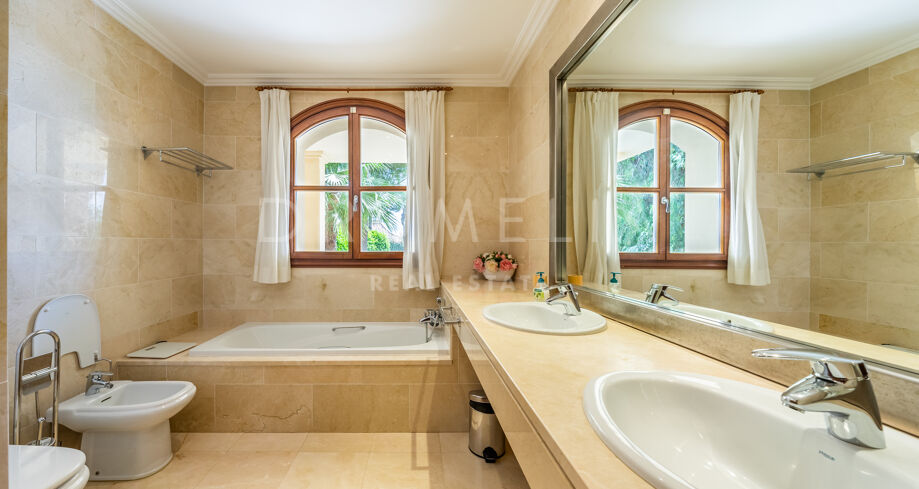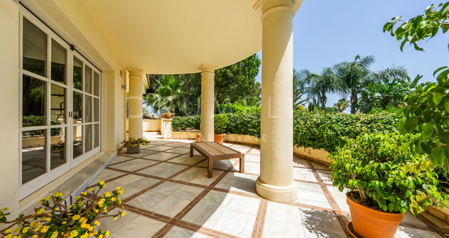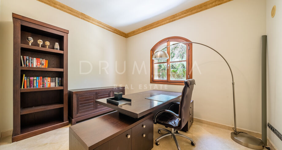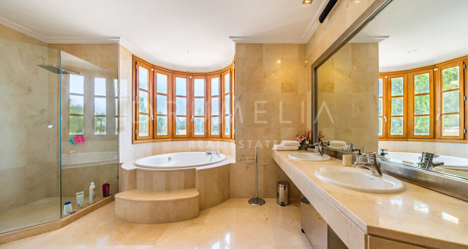 Built to the highest standards, this gorgeous villa for sale in Marbella offers a privileged location, utmost quality, generous proportions and refined interiors. It benefits from the top-quality materials, high-end furniture and luxurious features (air conditioning, ceiling heating system, electric blinds, fitted wardrobes, double glazing, etc.) Alarm system, video entrance, surveillance cameras and security entrance to the gated community with 24h security service will give you peace of mind. The most comfortable life is guaranteed in this elegant house surrounded with lush greenery, protected pine forests and similar luxury properties of the upper part of the Golden Mile!