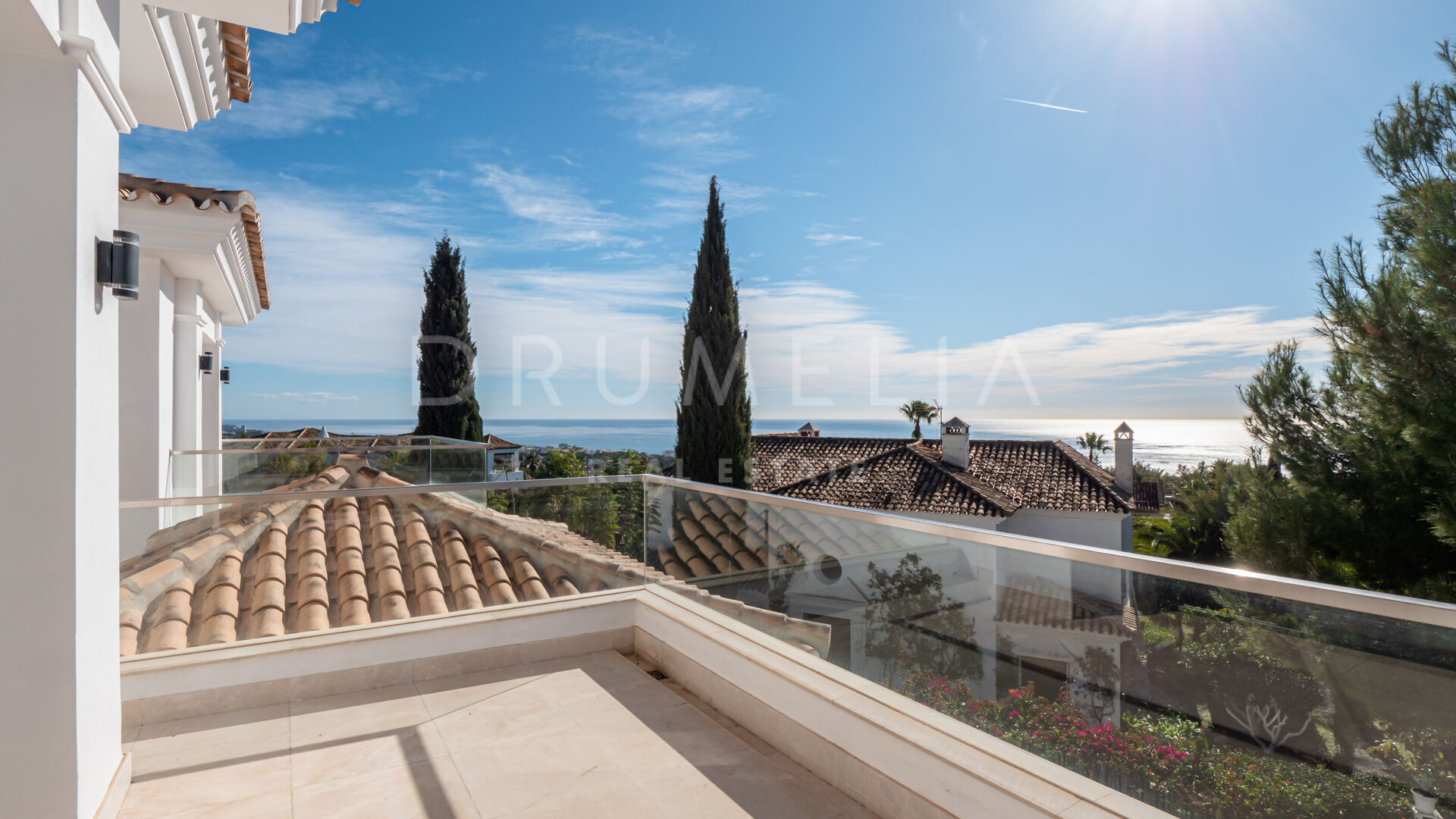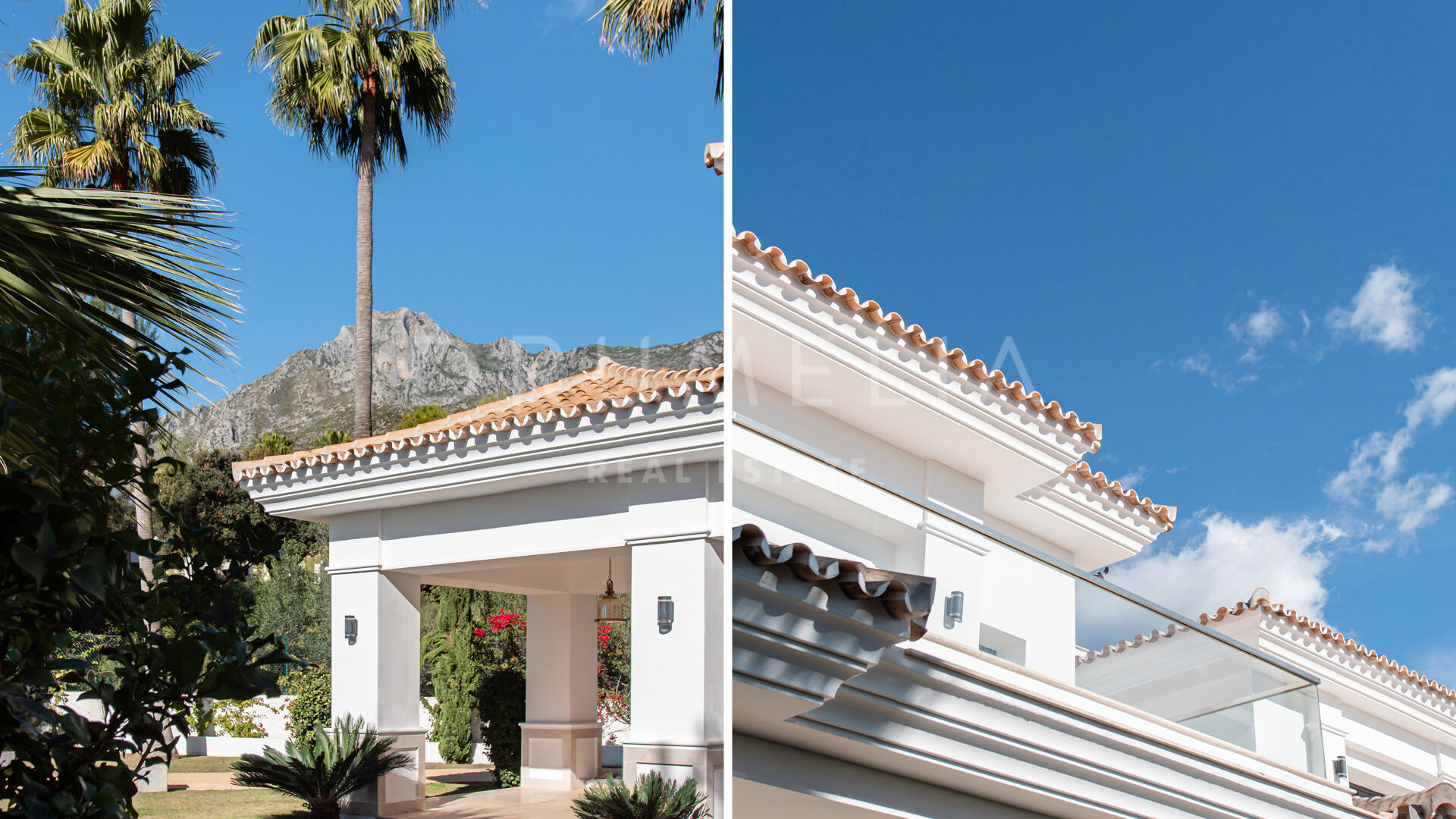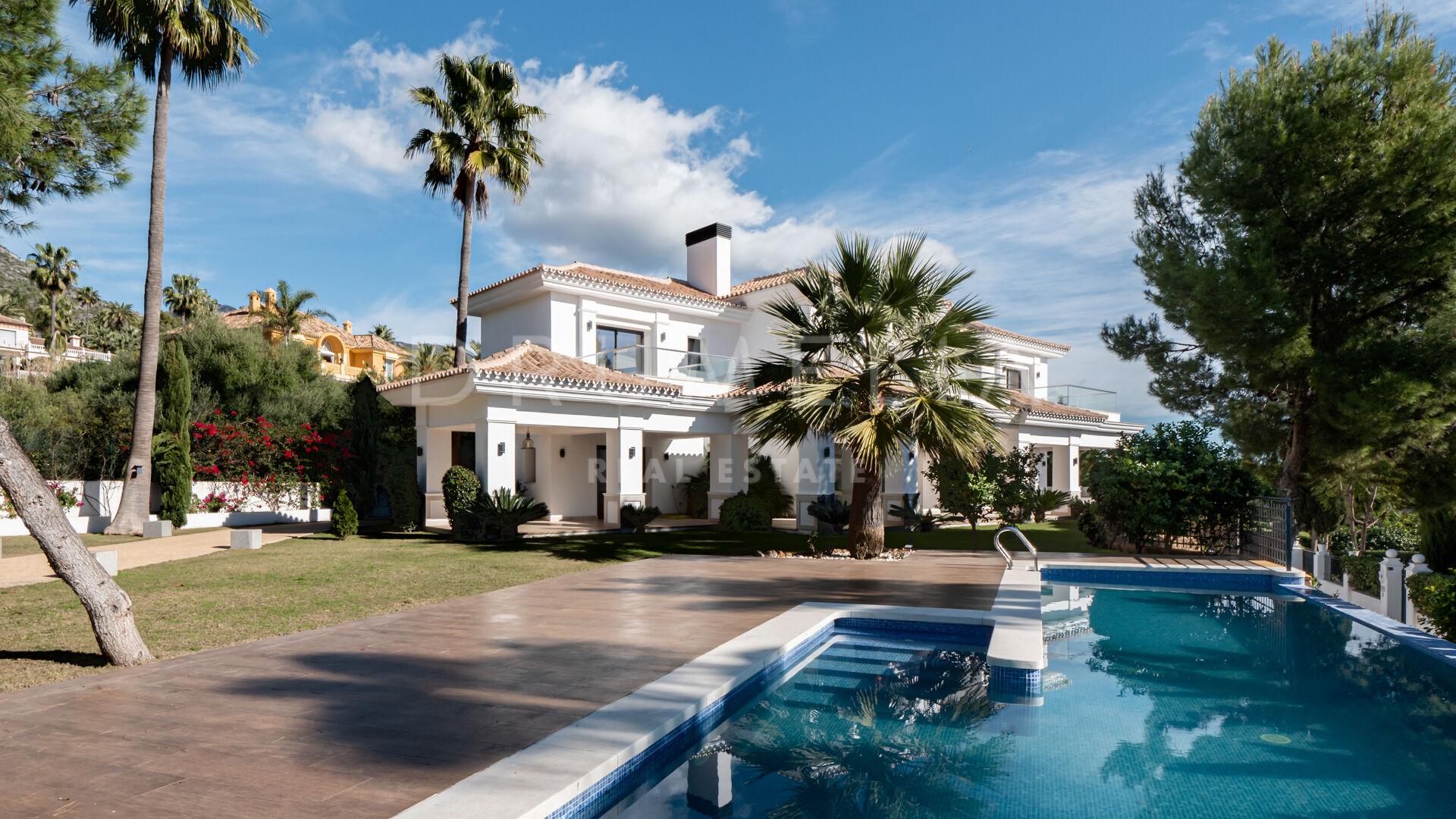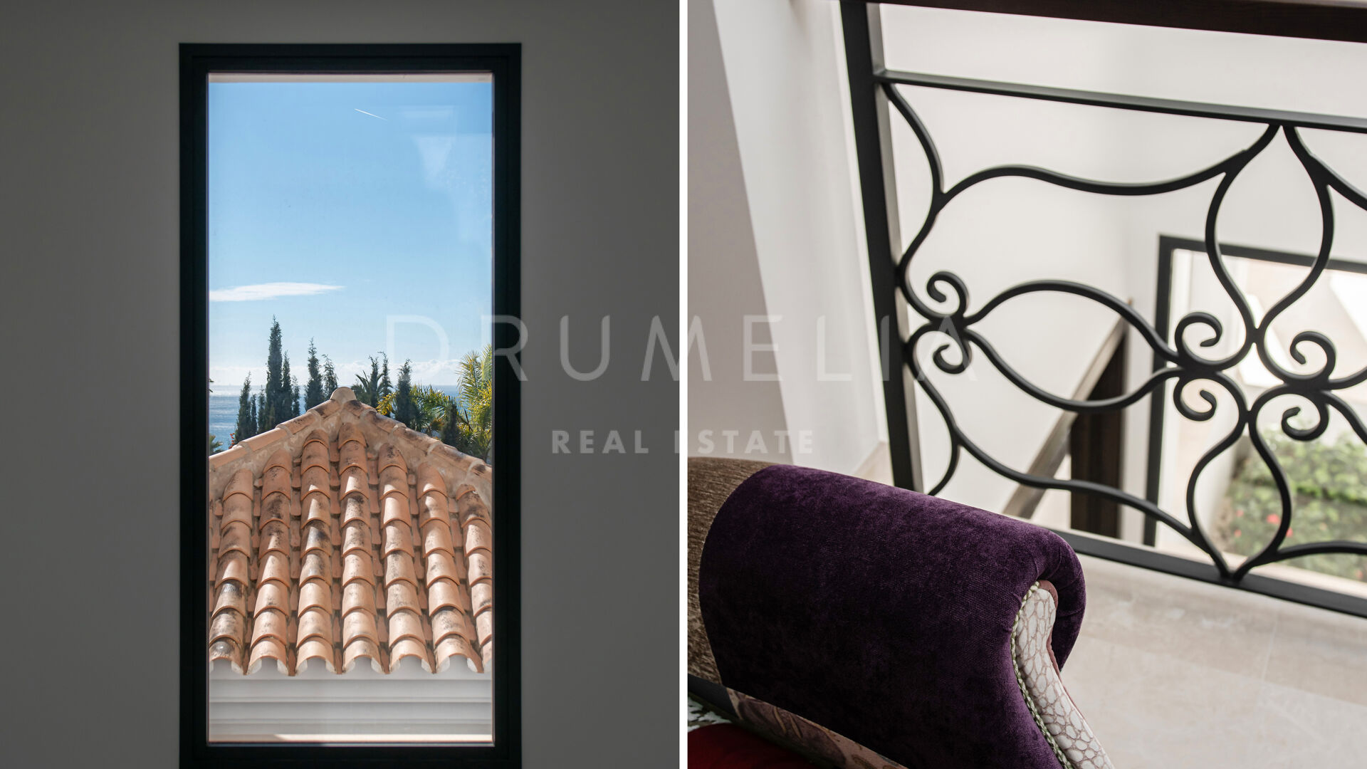Set on a plot of 1.600 m² the fabulous house is ideally designed to wrap around the magnificent views and savour the beauty of natural landscaping. Due to its splendid position on a hill, the mountains and sea views towards Mediterranean, Gibraltar and both European and African coasts are unobstructed and exhilarating. Subtropical well-designed landscaped gardens with groomed green lawns, flowerbeds, mature cypresses, palms and pine trees, swimming pool, solarium, covered al fresco dining and lounge terraces with lovely wood beam ceiling make the outside territory captivating and desirable.