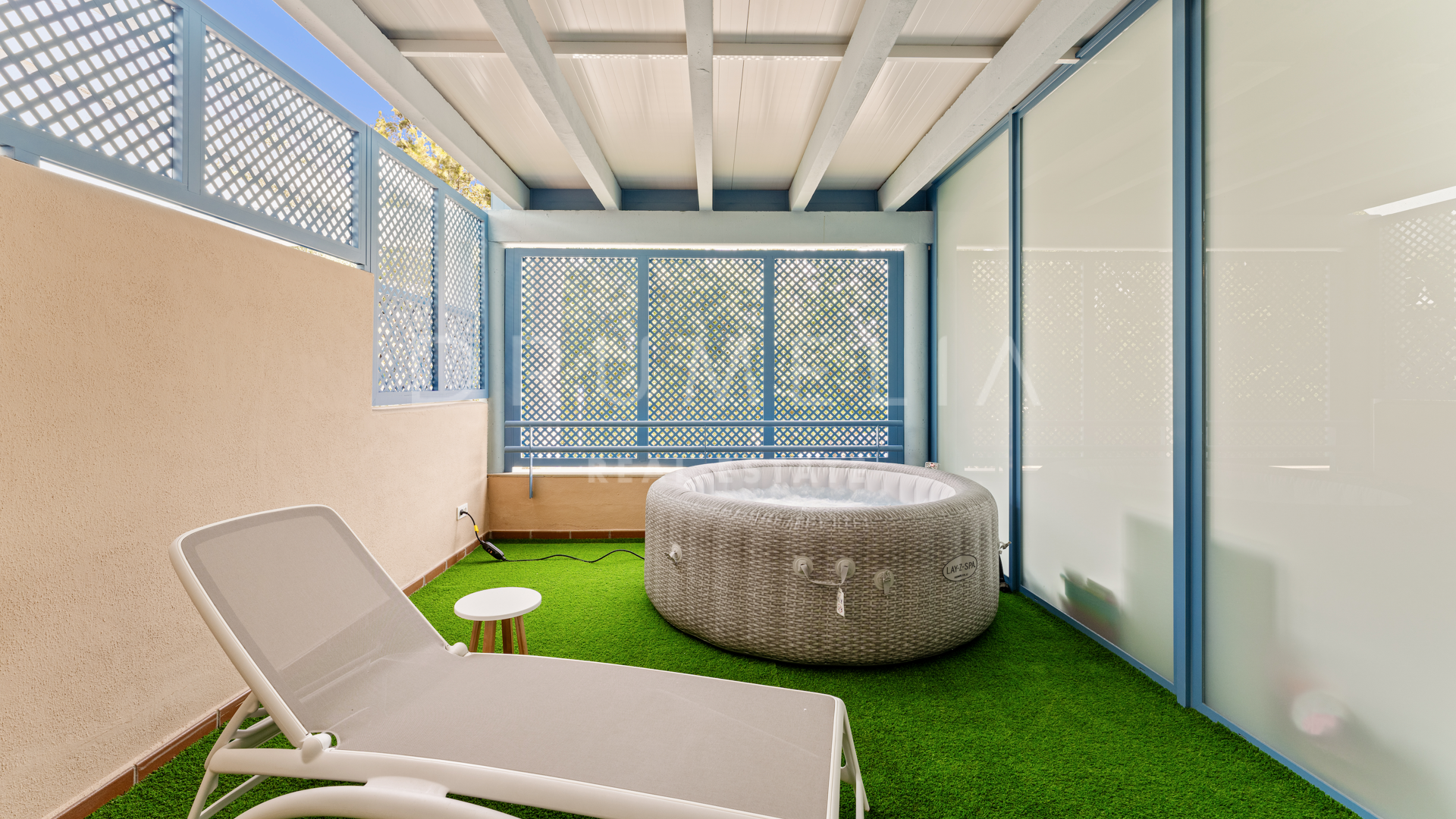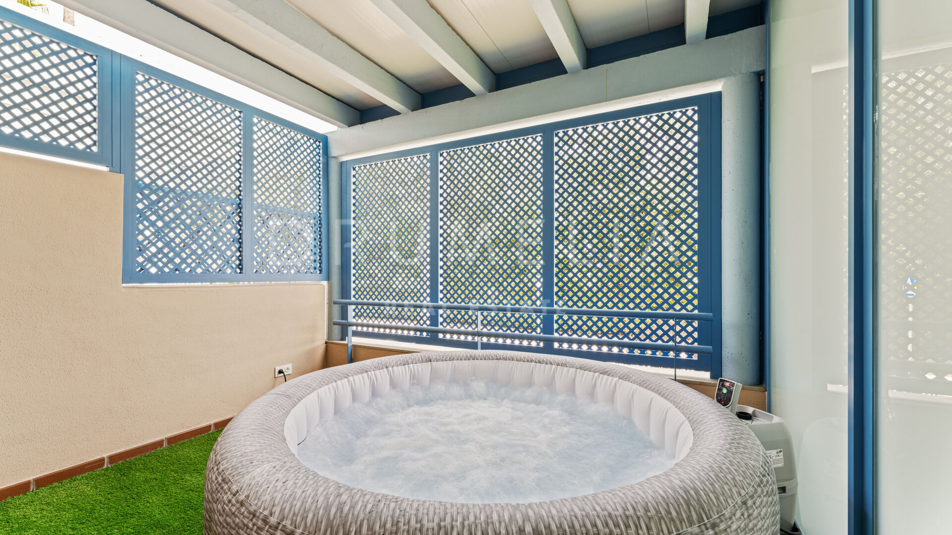 Inside, the fully fitted kitchen is well-appointed with granite countertops and quality appliances, creating a practical and pleasant space. The two bedrooms are generously sized, each with fitted wardrobes. The master suite offers an additional private enclosed terrace featuring artificial grass flooring and a jacuzzi, providing a peaceful and private space to unwind. Both bathrooms are finished in elegant marble, one featuring a walk-in shower and the other a full bathtub.