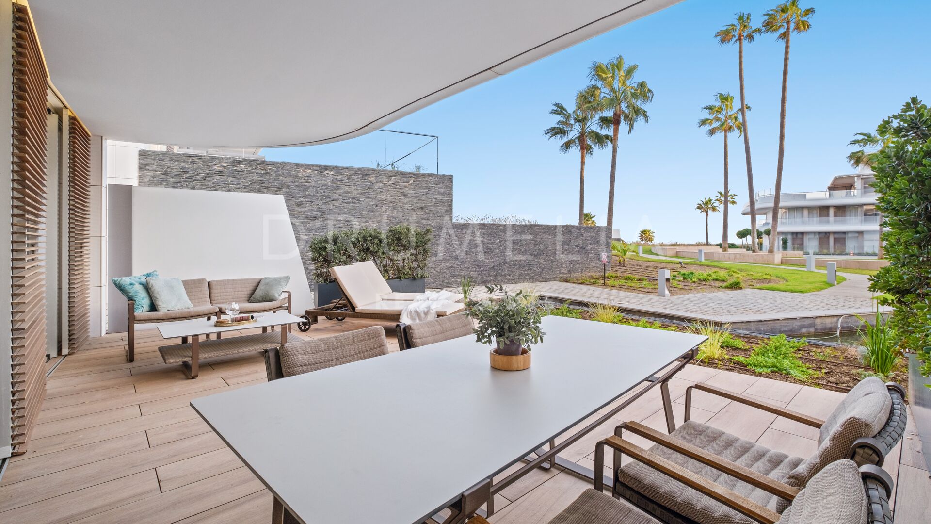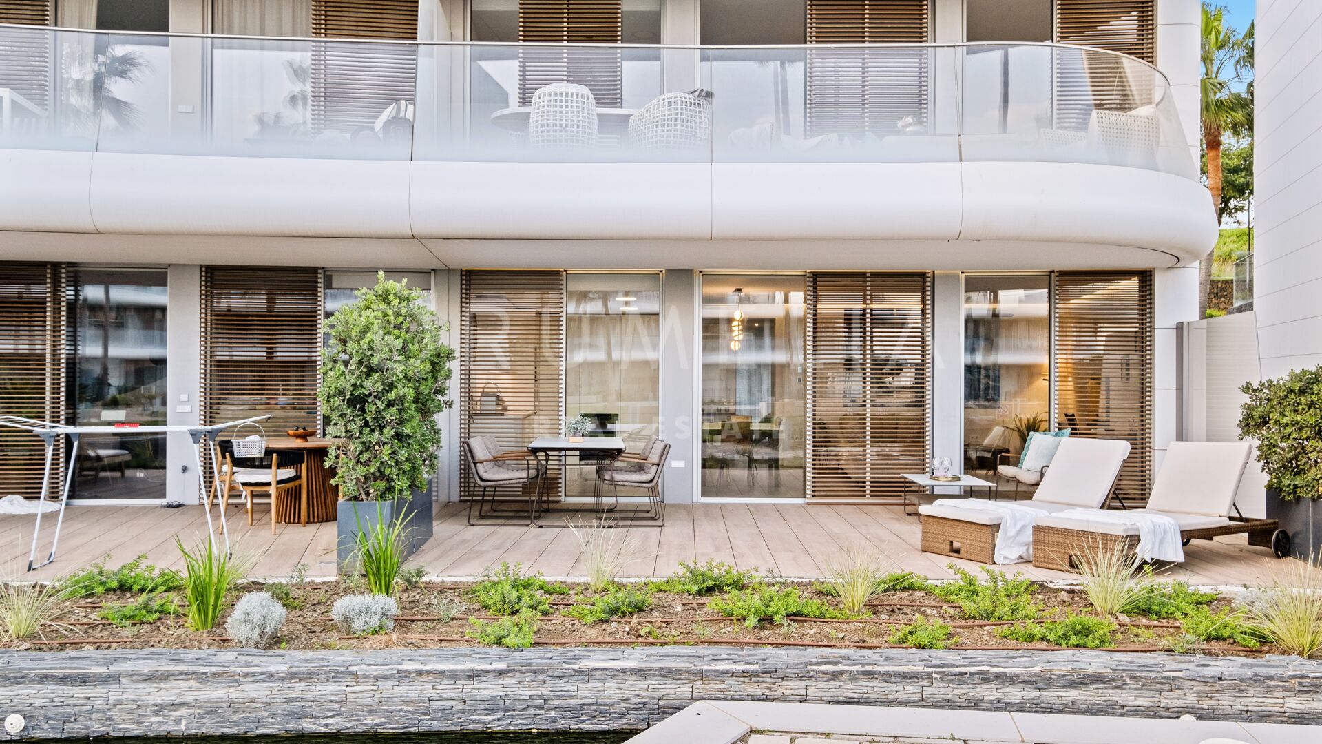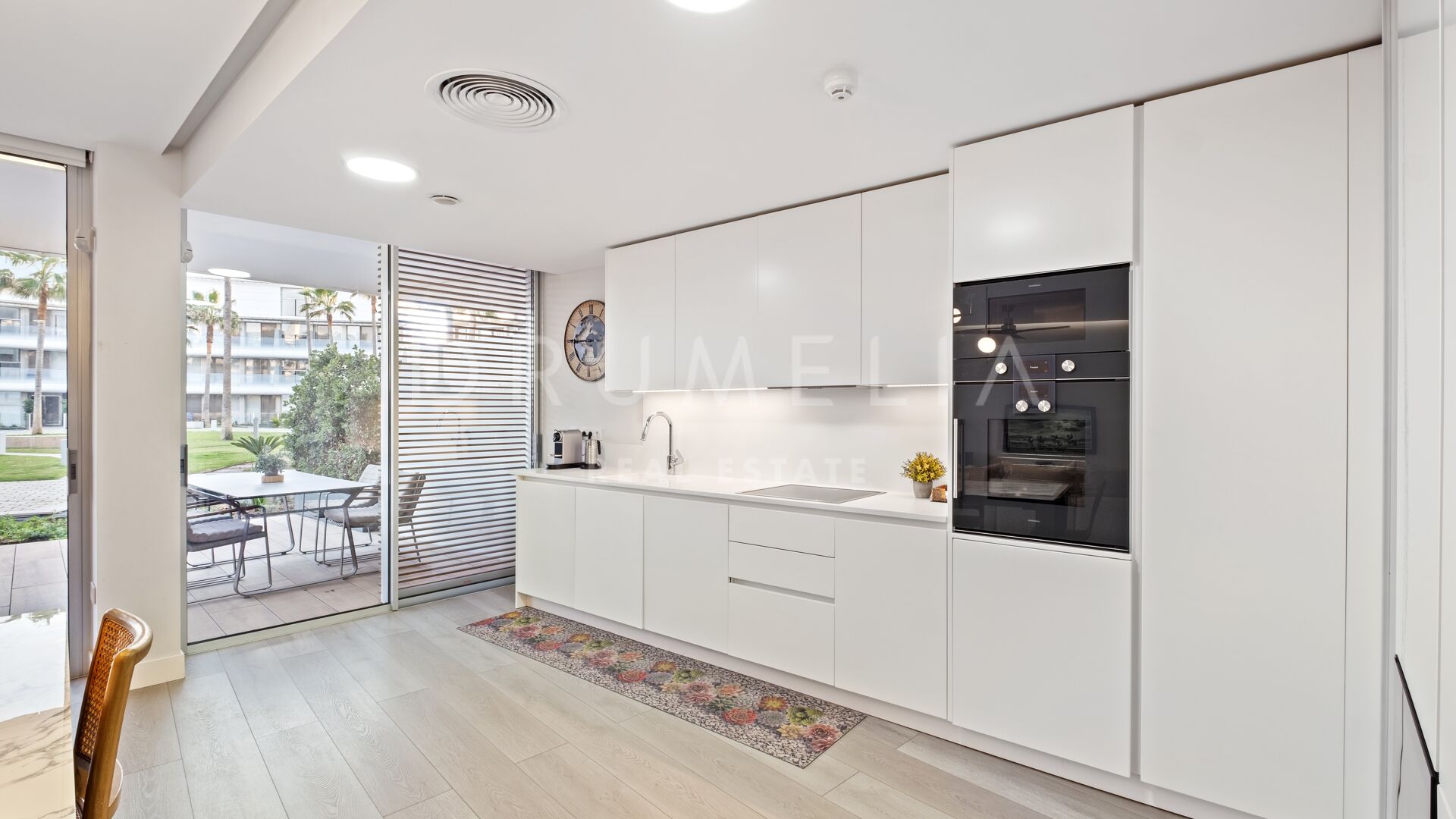 The apartment features two well-proportioned bedrooms and two modern bathrooms, including a primary bedroom with en-suite bathroom and direct access to the garden, creating a strong connection between indoor and outdoor living. The fully fitted kitchen is equipped with high-quality Gaggenau appliances and complemented by a separate utility area, combining modern design with everyday practicality. With 121 m² built and approximately 35 m² of terrace, the property offers a well-balanced layout suitable for both year-round living and holiday use.