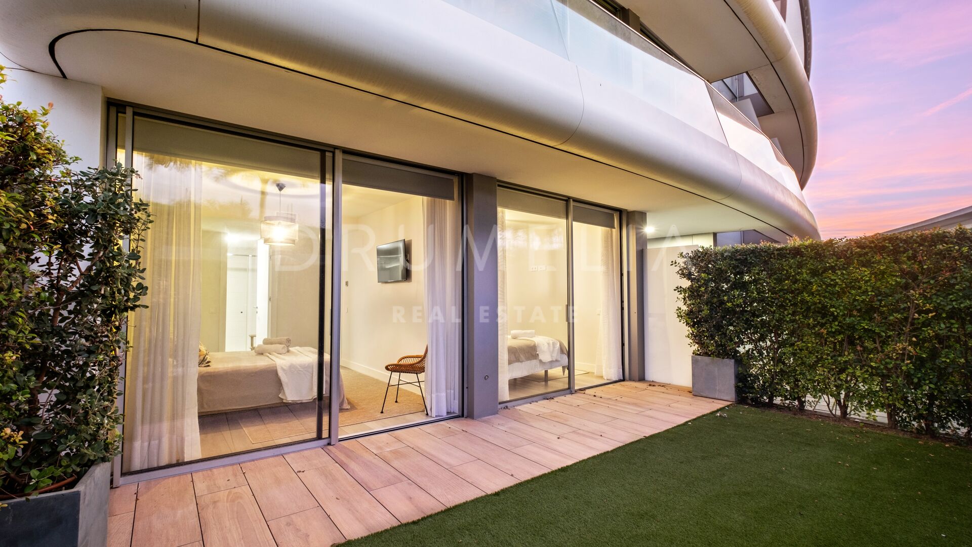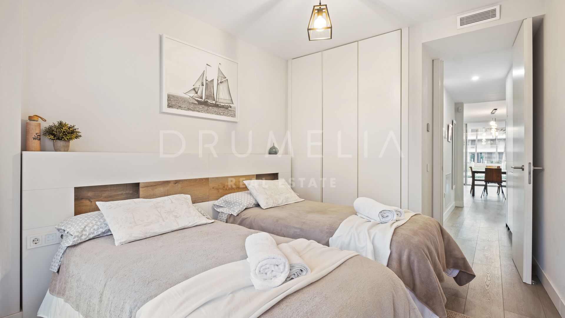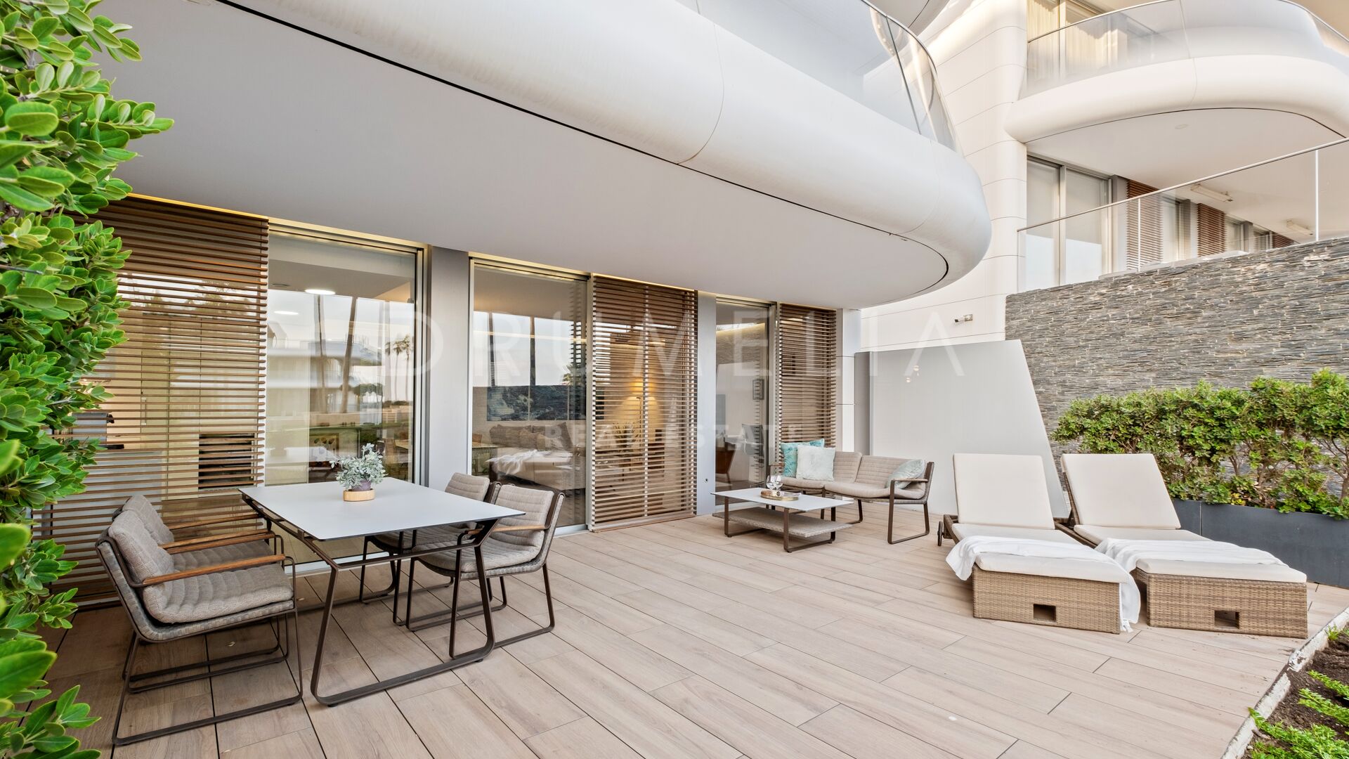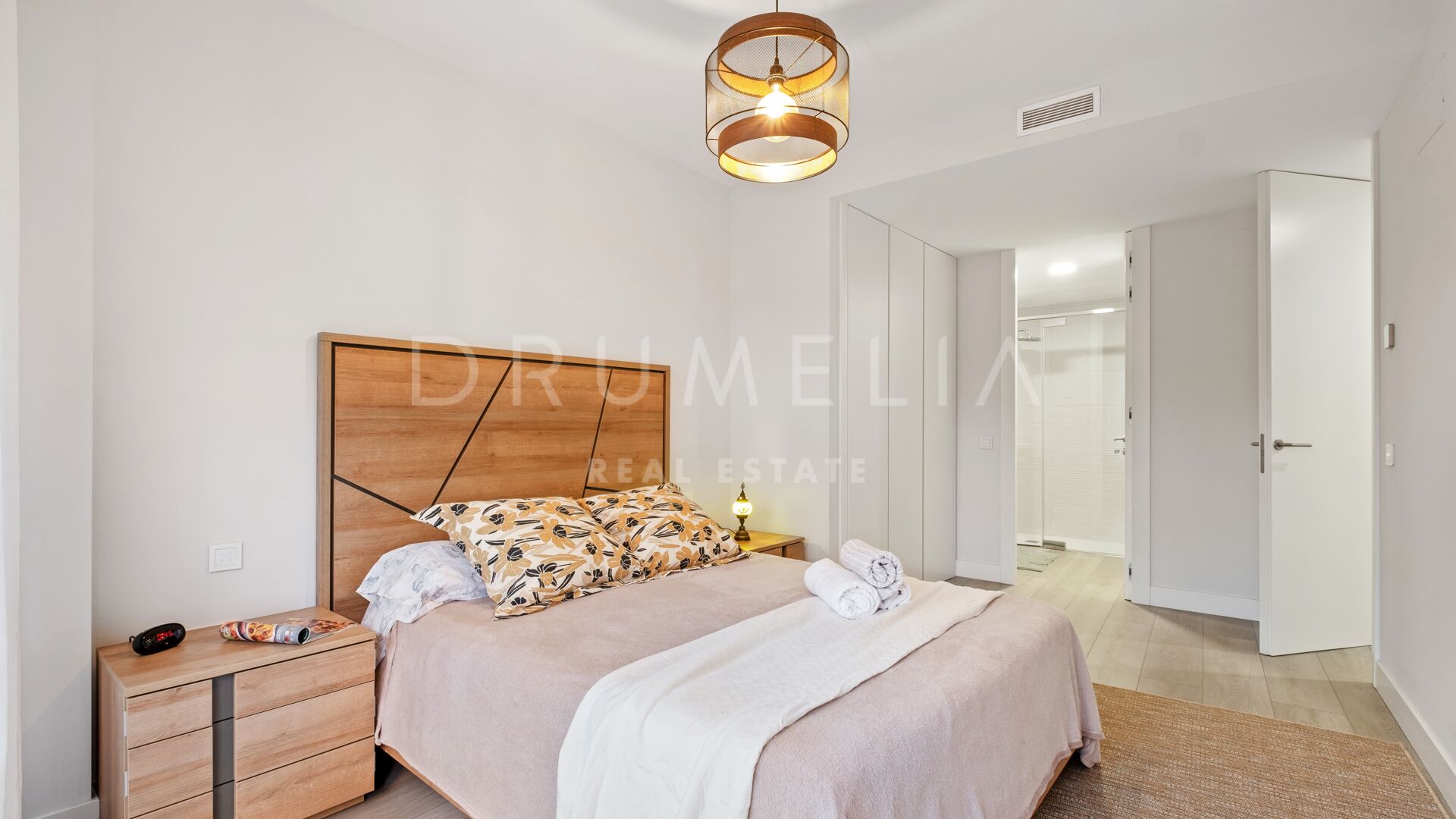 The apartment features two well-proportioned bedrooms and two modern bathrooms, including a primary bedroom with en-suite bathroom and direct access to the garden, creating a strong connection between indoor and outdoor living. The fully fitted kitchen is equipped with high-quality Gaggenau appliances and complemented by a separate utility area, combining modern design with everyday practicality. With 121 m² built and approximately 35 m² of terrace, the property offers a well-balanced layout suitable for both year-round living and holiday use.