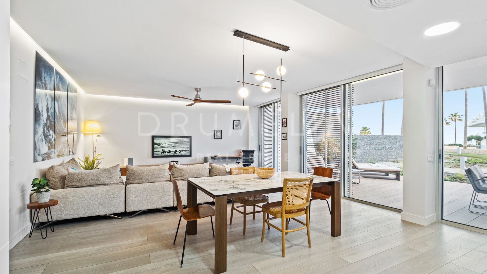This contemporary ground-floor apartment is located in Playa de Guadalobón, Estepona West, a peaceful and established coastal area known for its greenery, privacy, and proximity to the sea. Designed for comfortable Mediterranean living, the property offers a bright open-plan living and dining area that opens onto a spacious covered terrace and private garden, overlooking the beautifully maintained communal gardens with partial sea views. The outdoor space is ideal for dining, relaxing, and enjoying the mild climate throughout the year.