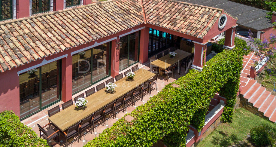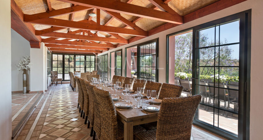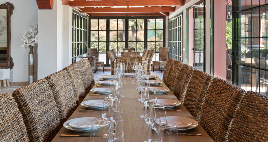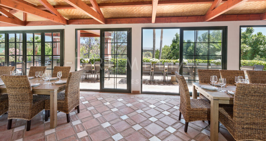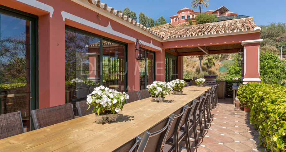 Designed for effortless indoor-outdoor living, the villa offers multiple dining terraces, a large swimming pool with sun deck, a poolside bar and gazebo, and a fully equipped Provençal-style kitchen ideal for hosting family and friends. Additional amenities include a private paddle tennis court, billiard room, wine cellar, and easy access to the Marbella Football Academy