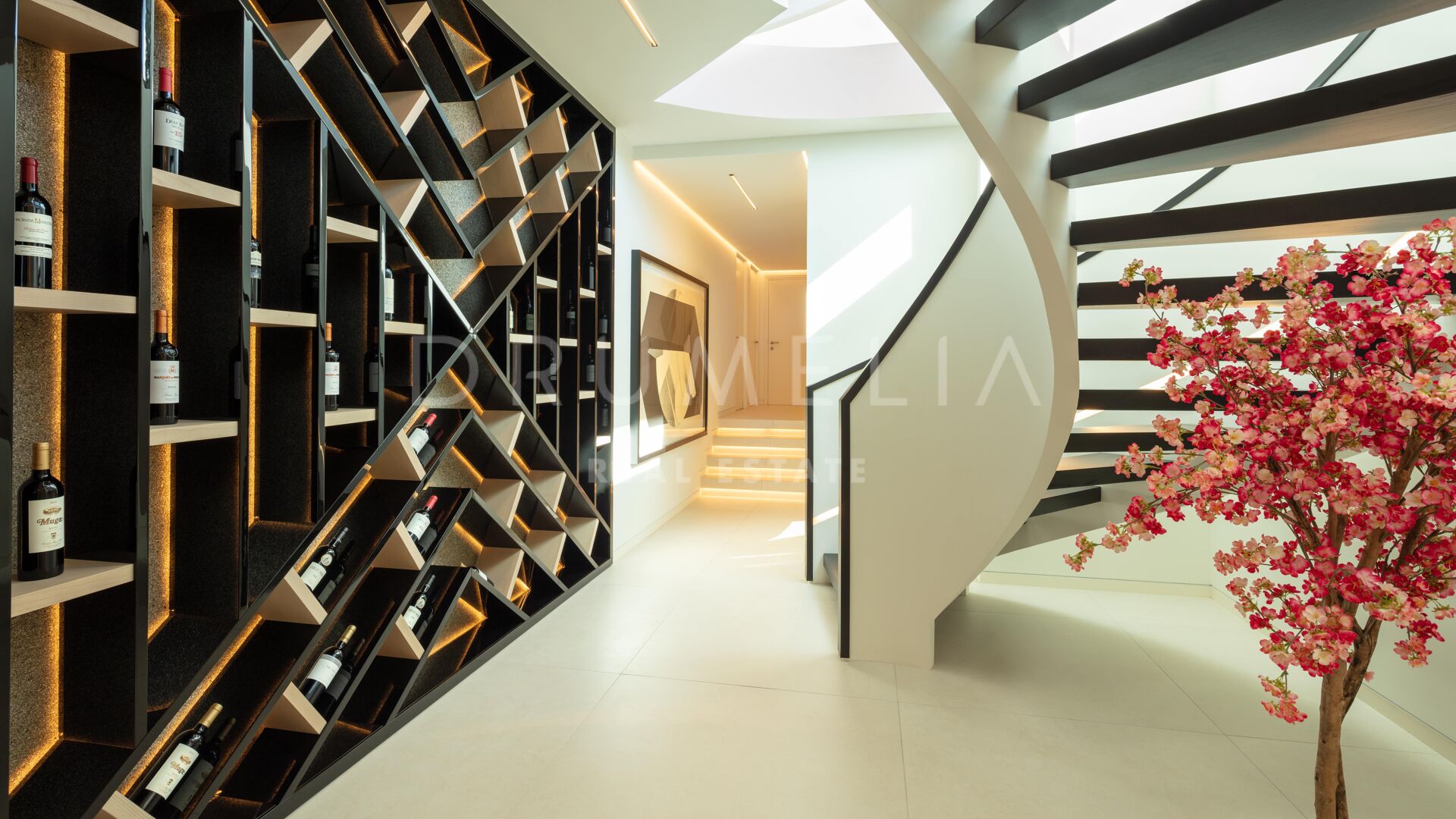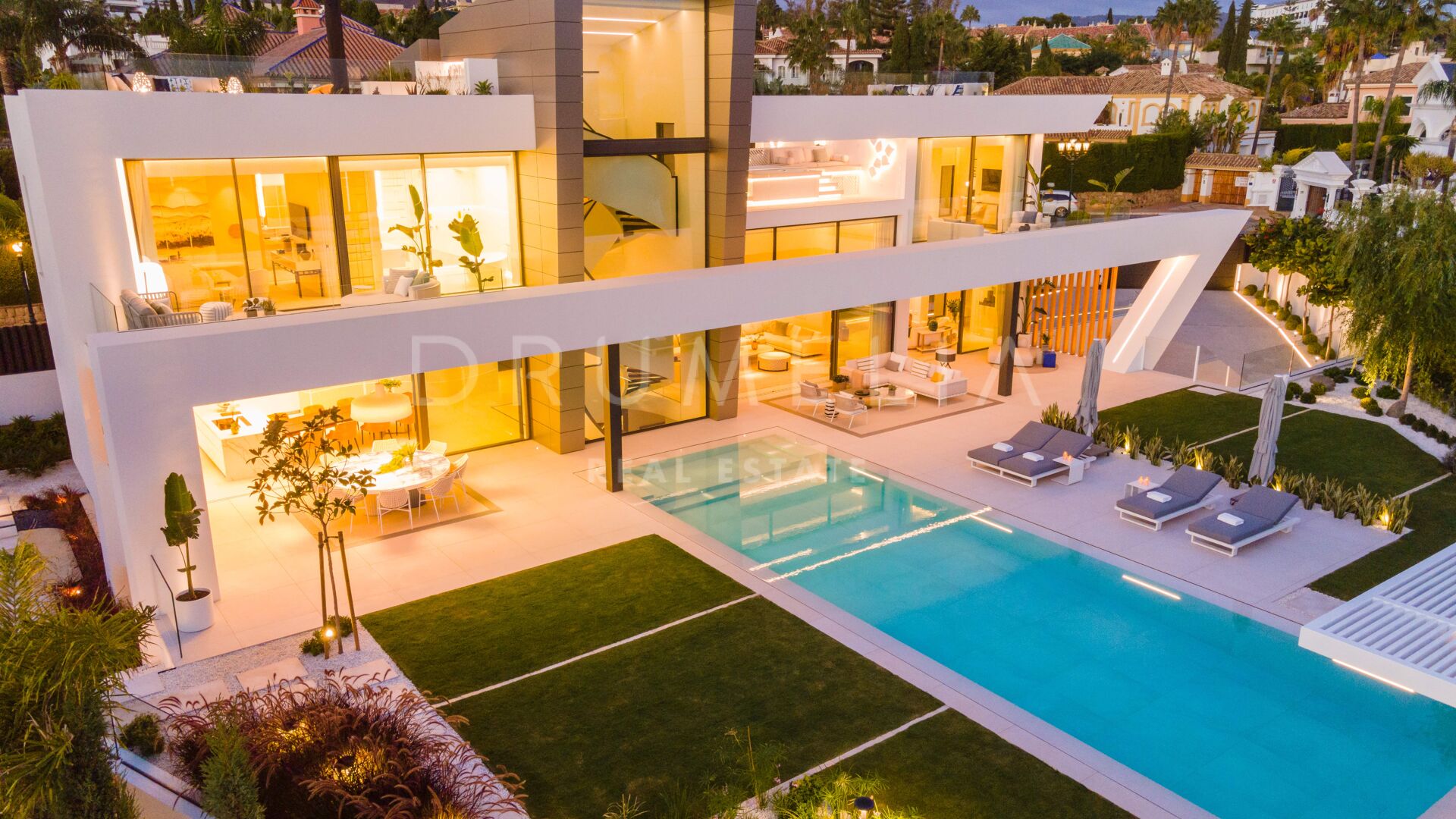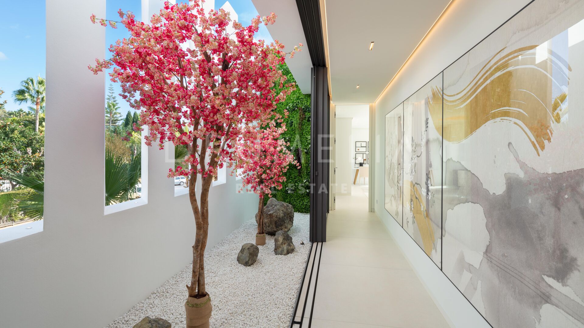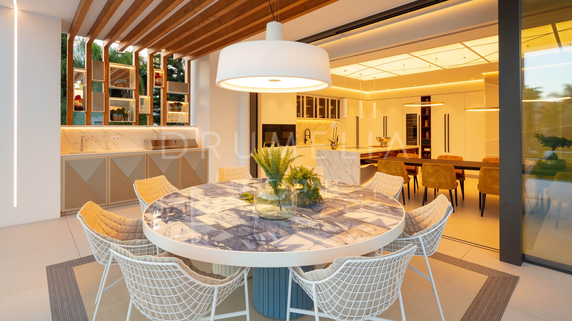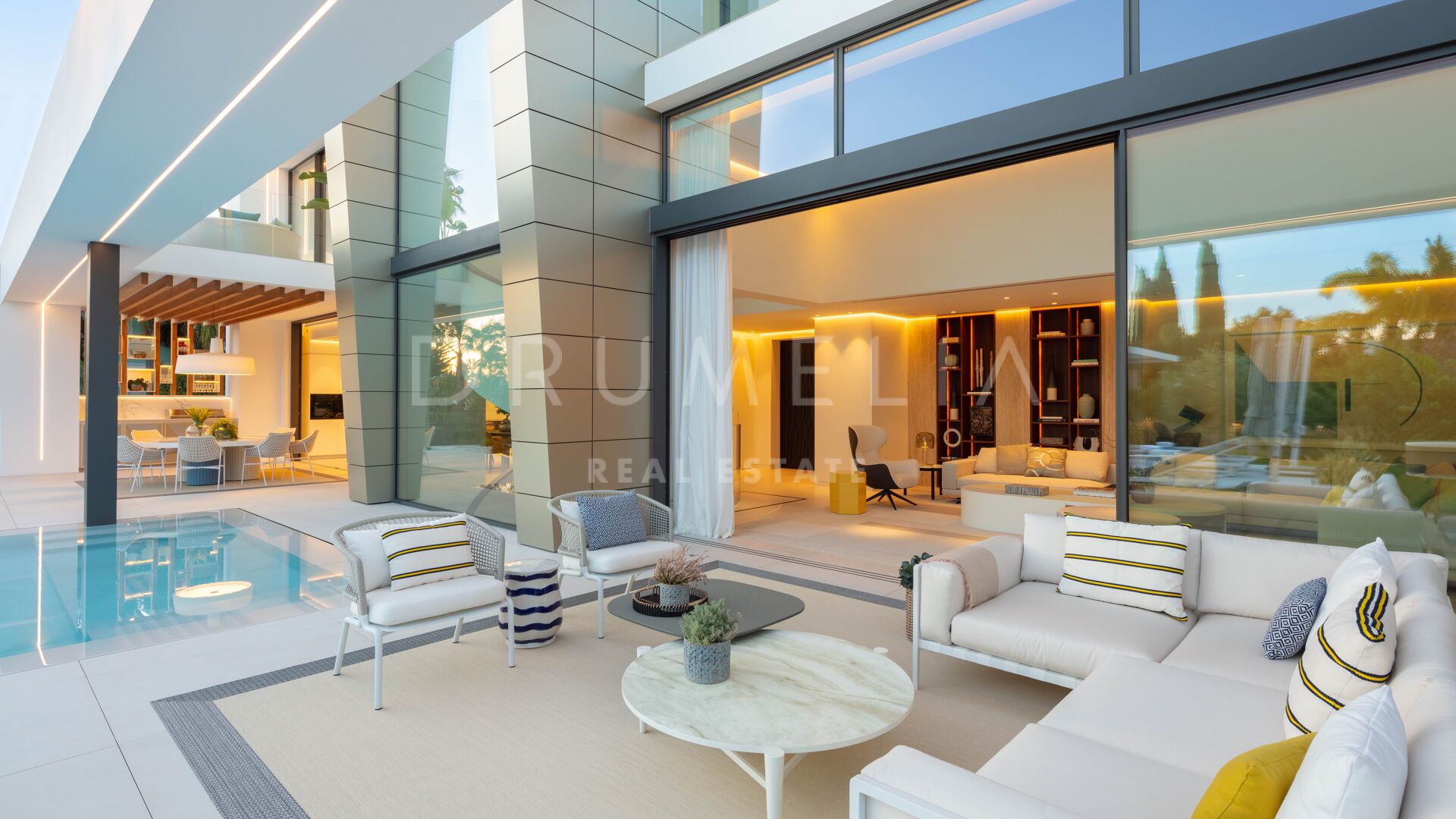 Enclavado en una pintoresca parcela de 1.322 m², el refugio ecológico de alta gama de 665 m² ha sido recientemente completado y terminado a la perfección para ofrecer la mejor vida de resort de estilo playero. Esta verdadera obra maestra de la arquitectura ofrece un diseño contemporáneo de vanguardia, calidades de lujo e interiores impresionantes del famoso diseñador Pedro Peña. También impresiona por sus espacios abiertos y elegantes, sus avances tecnológicos y sus deliciosas vistas a la exuberante vegetación, a un entorno perfecto y al mar Mediterráneo hasta la costa africana. Los espacios habitables son luminosos y gozan de mucha luz natural gracias a los amplios ventanales que van del suelo al techo, las puertas de cristal y la perfecta orientación al sur.