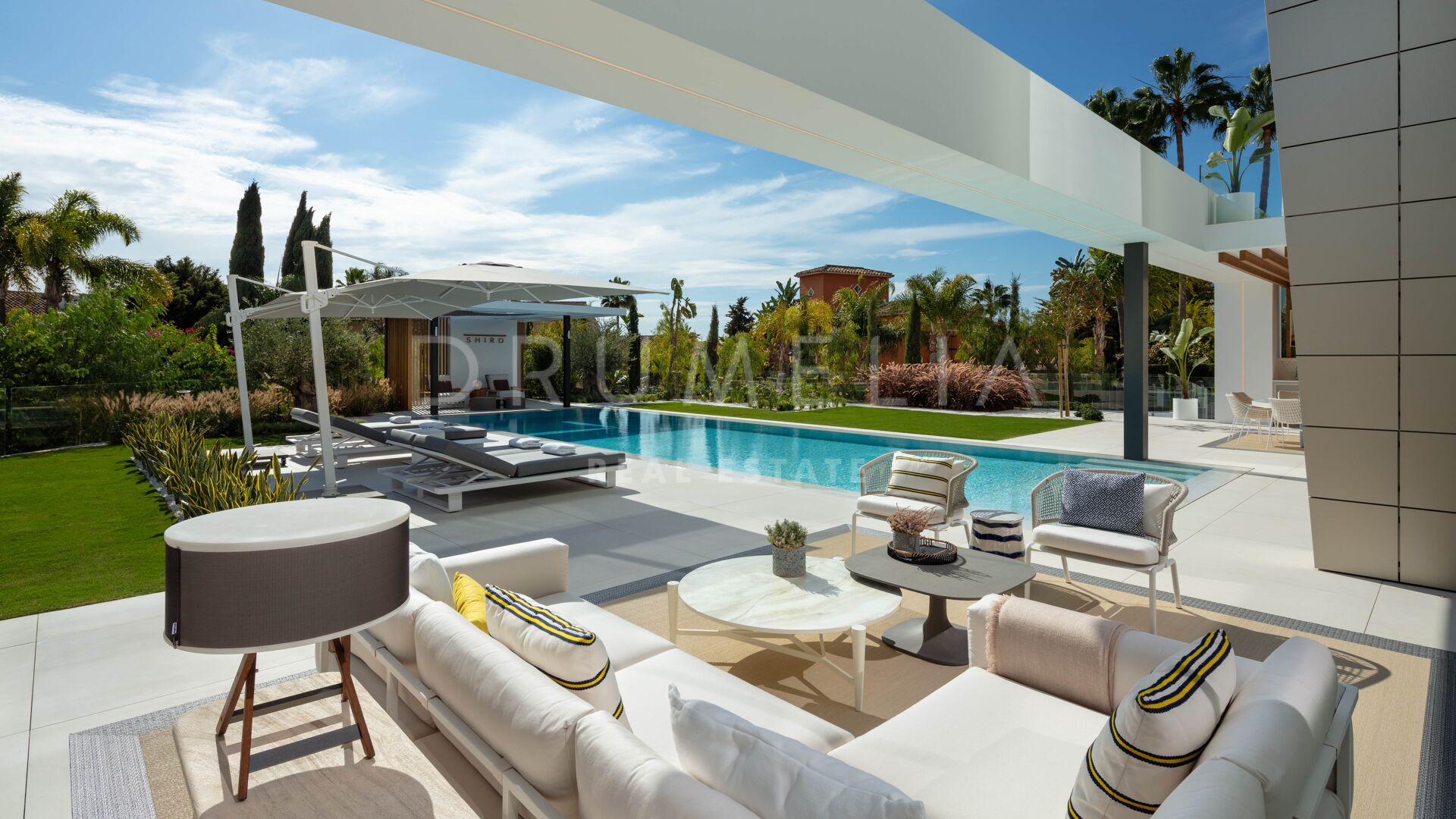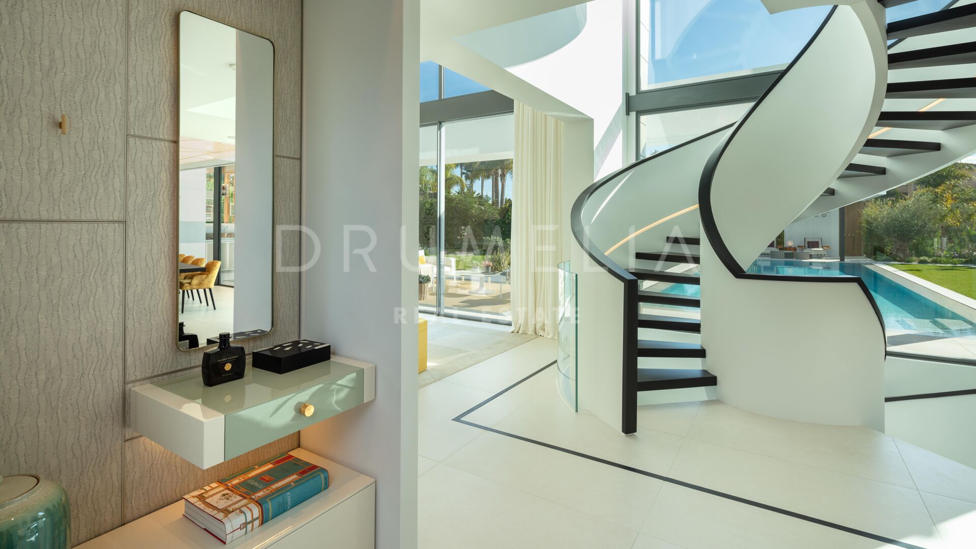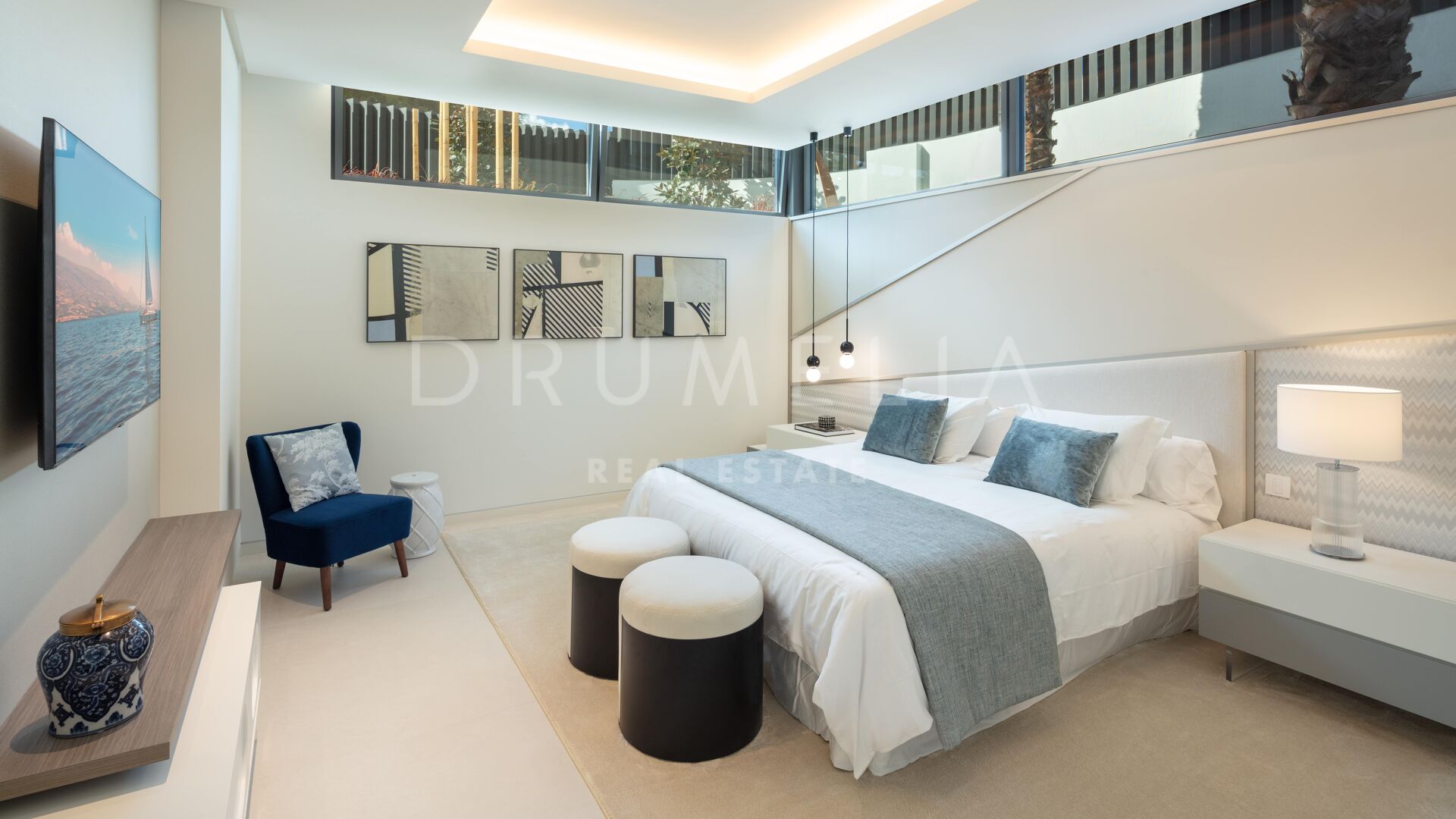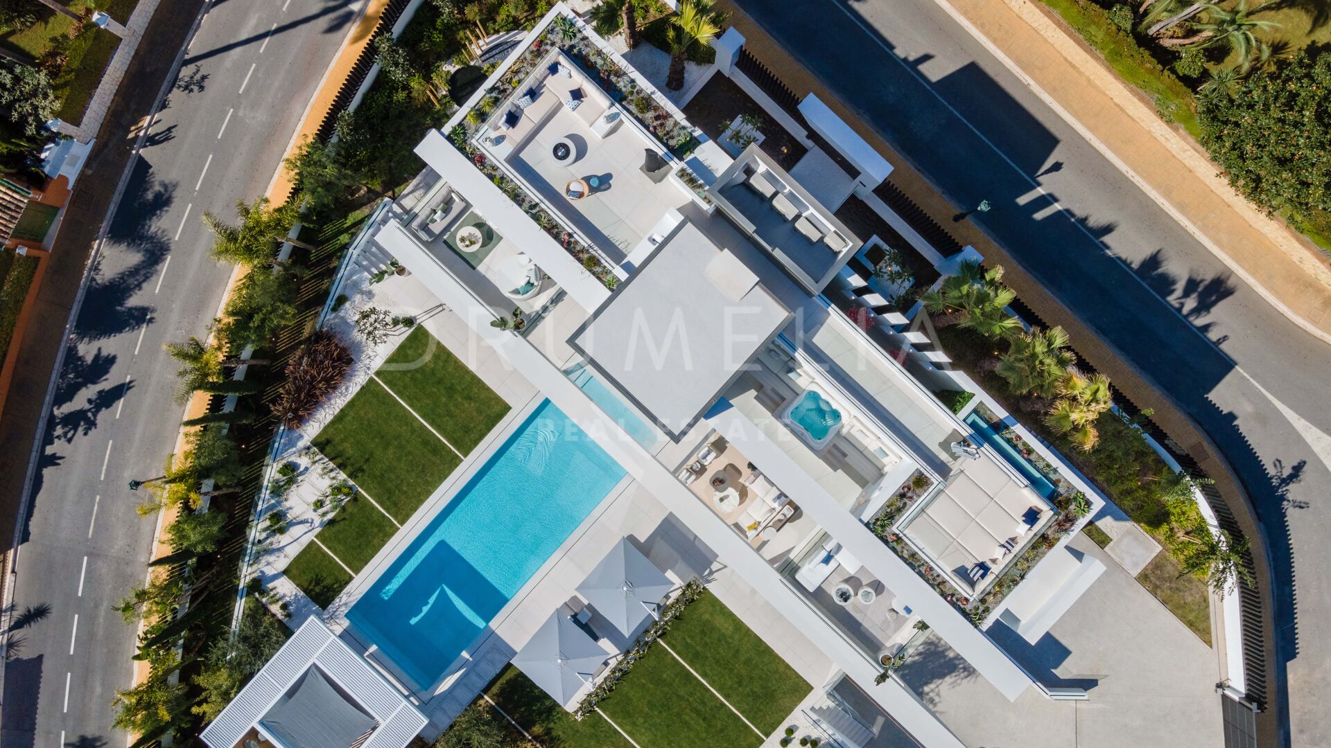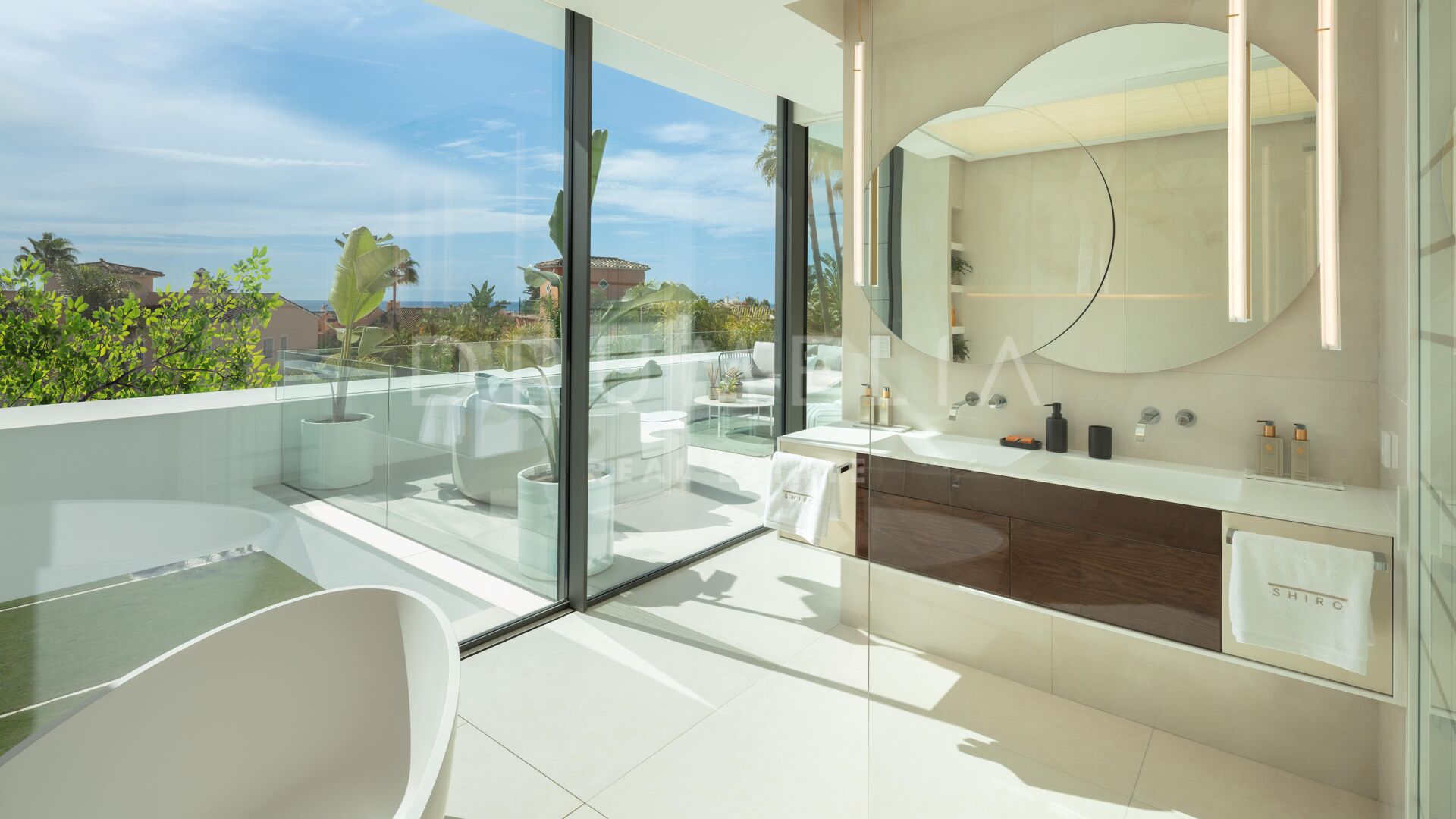 Enclavado en una pintoresca parcela de 1.322 m², el refugio ecológico de alta gama de 665 m² ha sido recientemente completado y terminado a la perfección para ofrecer la mejor vida de resort de estilo playero. Esta verdadera obra maestra de la arquitectura ofrece un diseño contemporáneo de vanguardia, calidades de lujo e interiores impresionantes del famoso diseñador Pedro Peña. También impresiona por sus espacios abiertos y elegantes, sus avances tecnológicos y sus deliciosas vistas a la exuberante vegetación, a un entorno perfecto y al mar Mediterráneo hasta la costa africana. Los espacios habitables son luminosos y gozan de mucha luz natural gracias a los amplios ventanales que van del suelo al techo, las puertas de cristal y la perfecta orientación al sur.