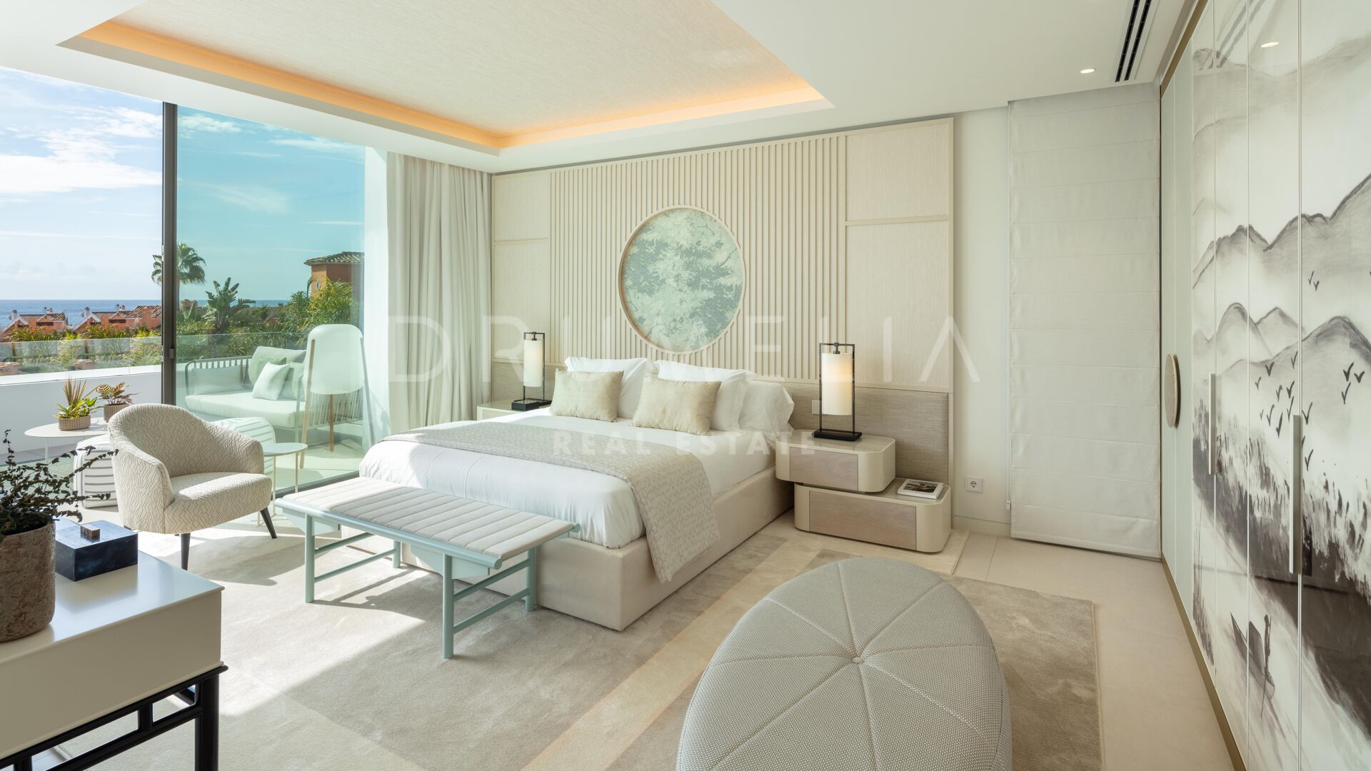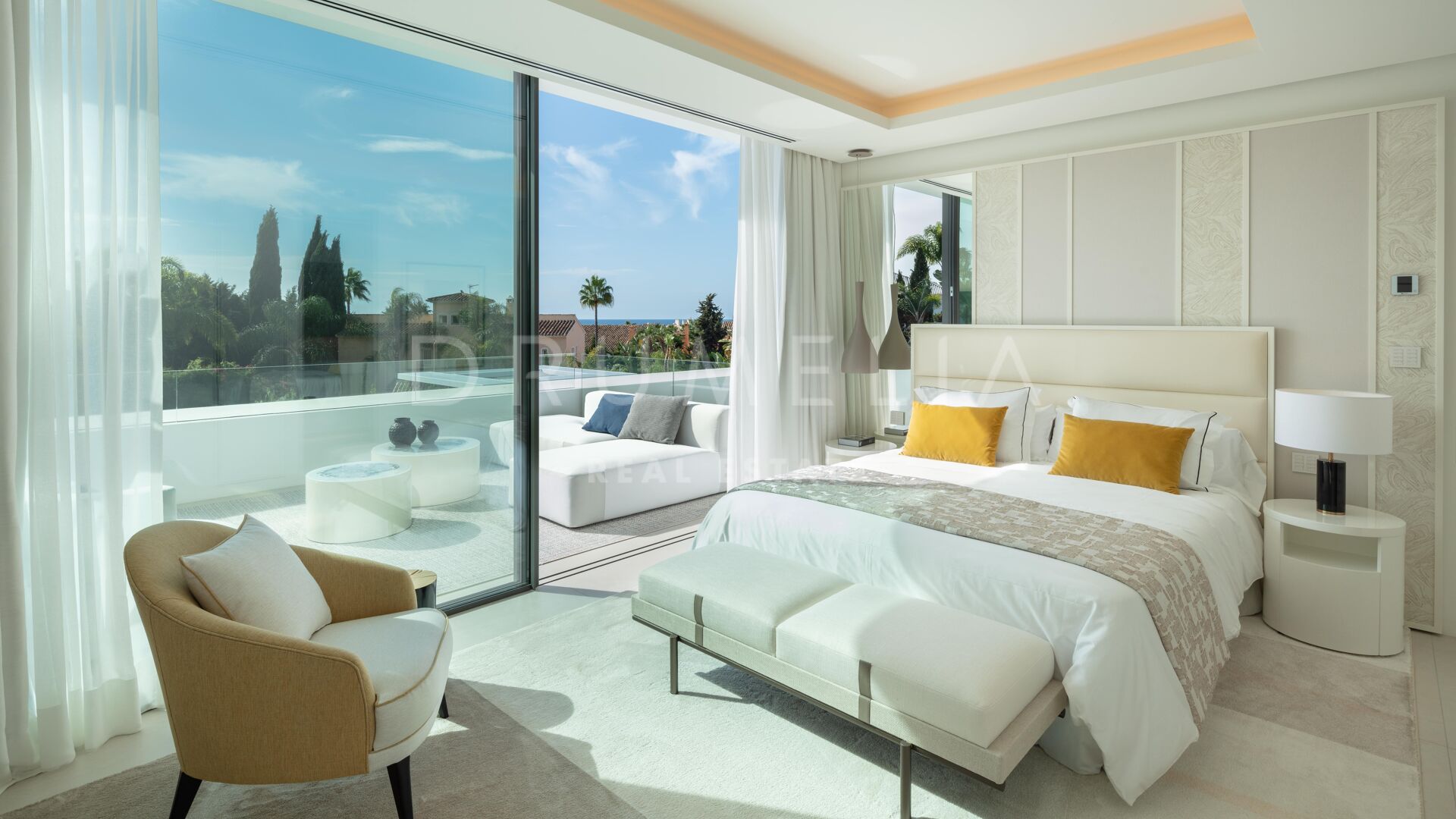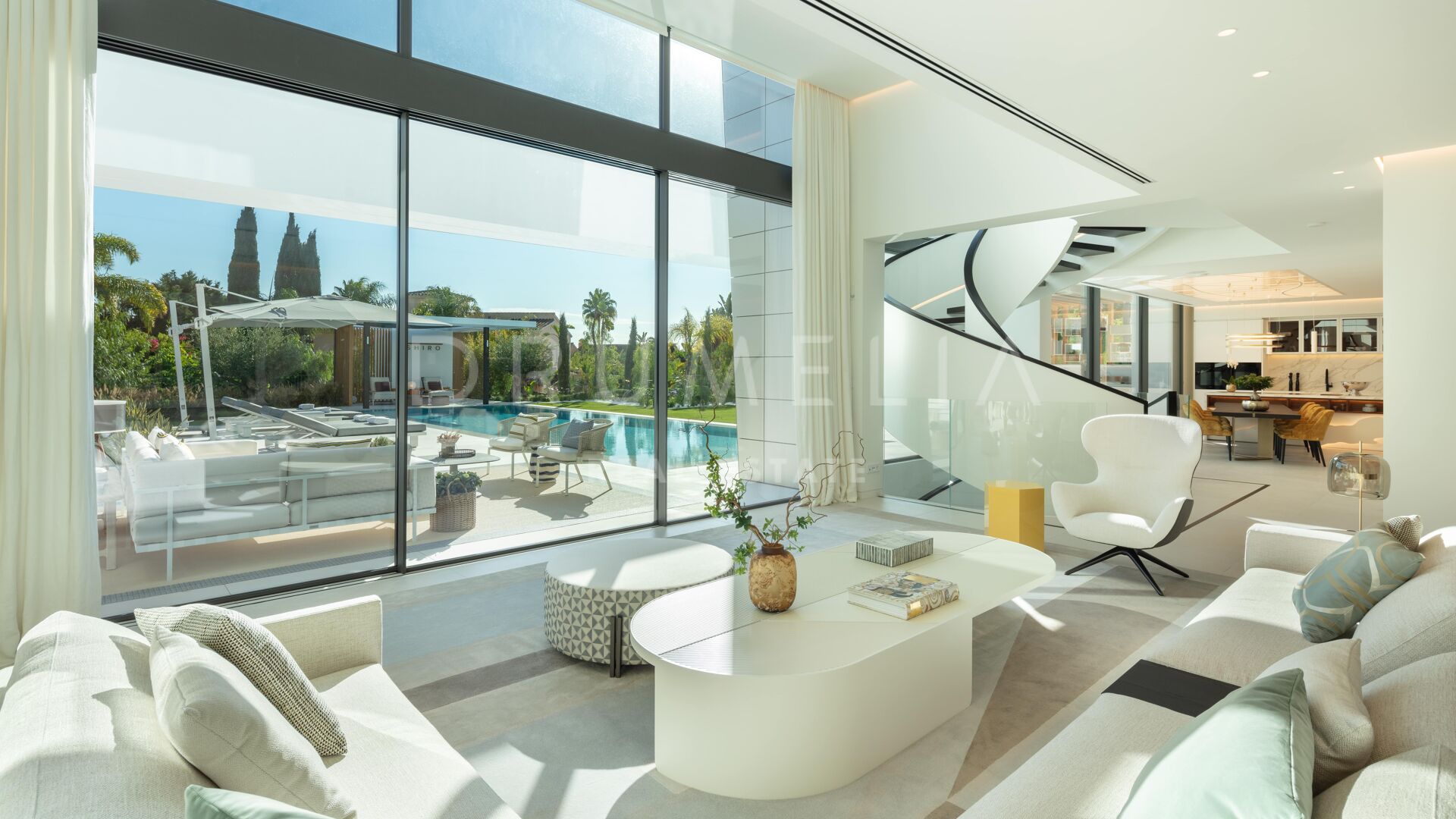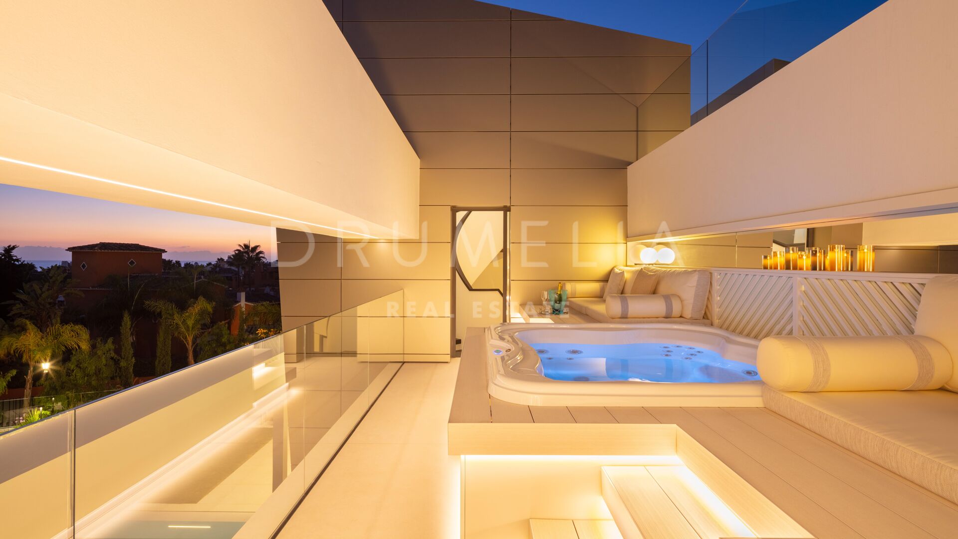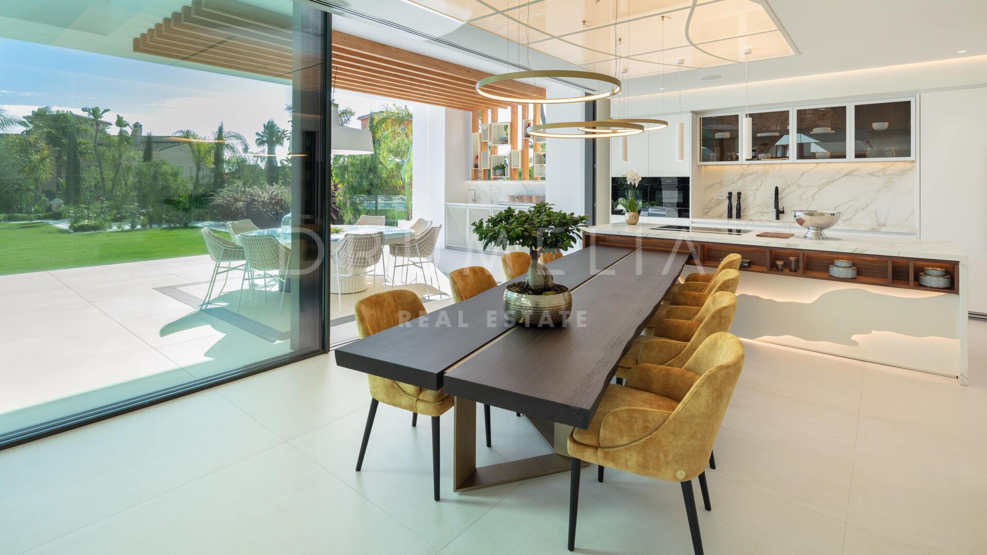 Enclavado en una pintoresca parcela de 1.322 m², el refugio ecológico de alta gama de 665 m² ha sido recientemente completado y terminado a la perfección para ofrecer la mejor vida de resort de estilo playero. Esta verdadera obra maestra de la arquitectura ofrece un diseño contemporáneo de vanguardia, calidades de lujo e interiores impresionantes del famoso diseñador Pedro Peña. También impresiona por sus espacios abiertos y elegantes, sus avances tecnológicos y sus deliciosas vistas a la exuberante vegetación, a un entorno perfecto y al mar Mediterráneo hasta la costa africana. Los espacios habitables son luminosos y gozan de mucha luz natural gracias a los amplios ventanales que van del suelo al techo, las puertas de cristal y la perfecta orientación al sur.