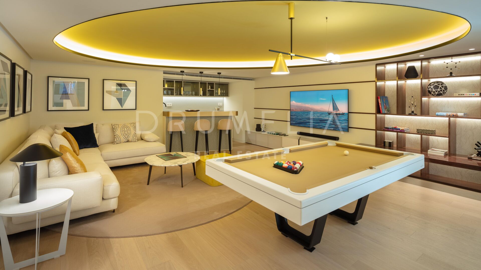 Con un diseño elegante y sofisticado, esta casa de ensueño ha sido amueblada y decorada en su totalidad por la prestigiosa firma de diseño Pedro Peña. Pedro Peña incorpora a sus colecciones innovaciones y espectaculares artesanías hechas a medida. La firma produce un selecto número de exquisitas piezas de diseño al año en su taller artesanal ubicado en Marbella. La excepcional casa se pone a la venta en perfecto estado y con muchísimas prestaciones que le aseguran una vida de lo más lujosa. El jardín paisajístico con sistema de riego automático y césped verde, las terrazas cubiertas y soleadas de 321 m², un pabellón, una gran piscina y zonas para tomar el sol garantizan una vida al aire libre de máxima calidad y un tiempo ideal con su familia e invitados durante todo el año.