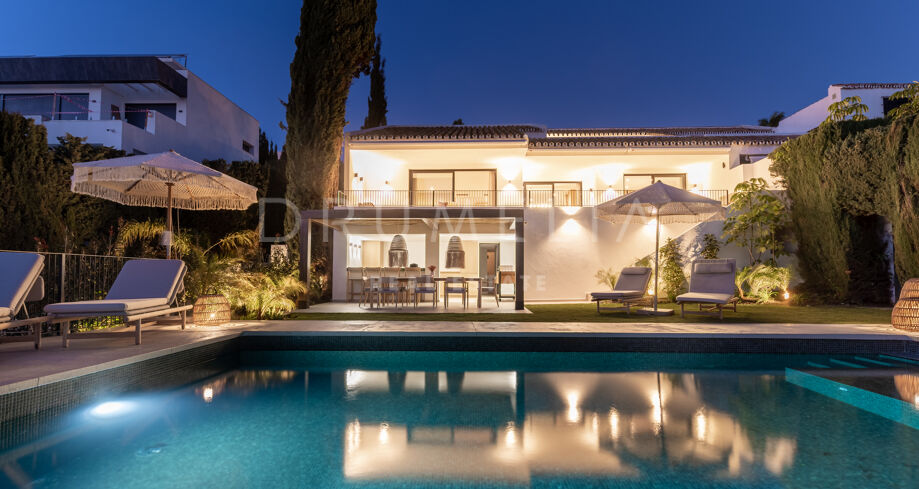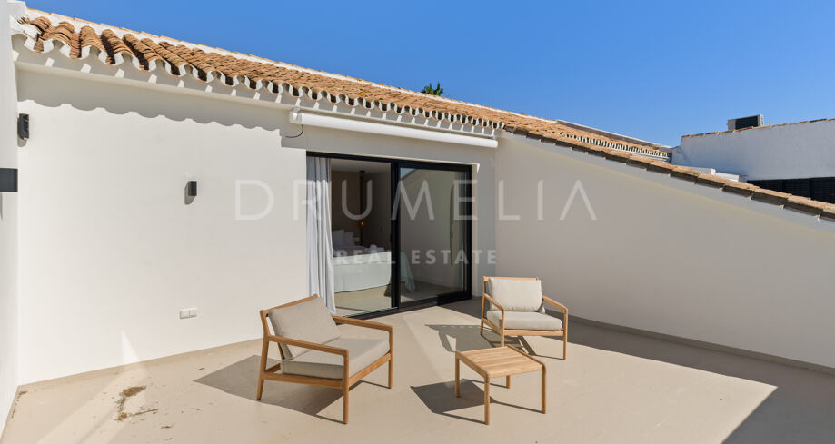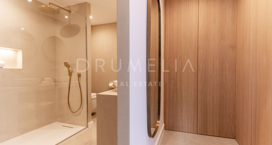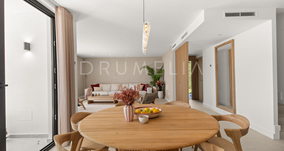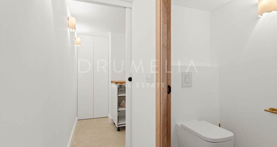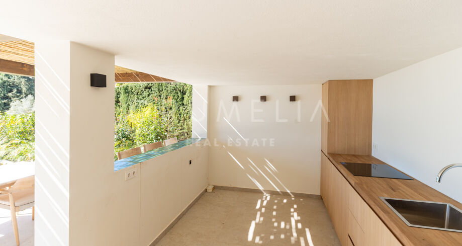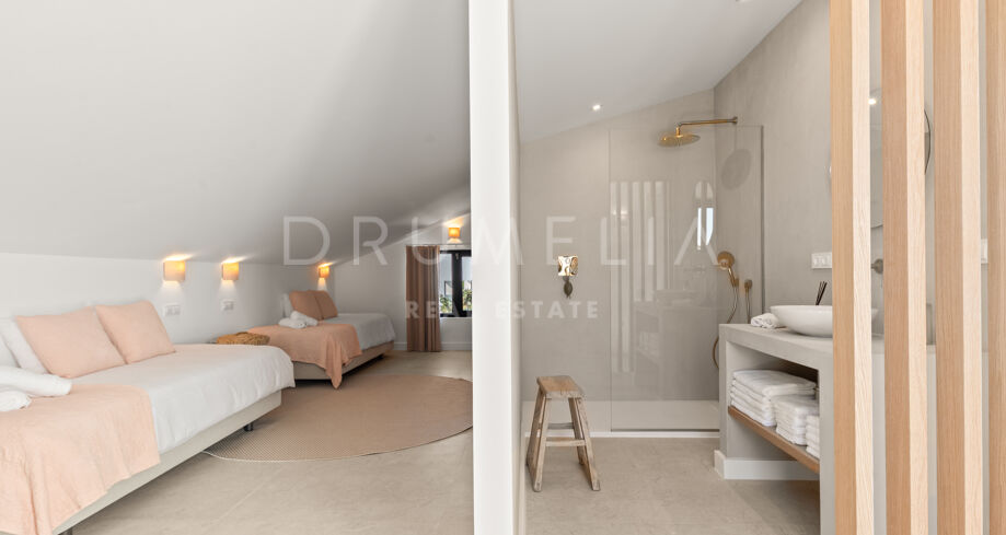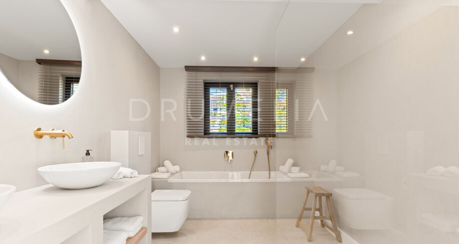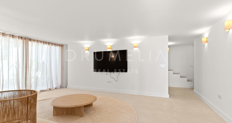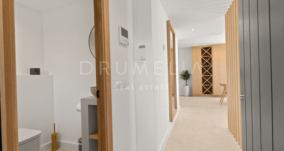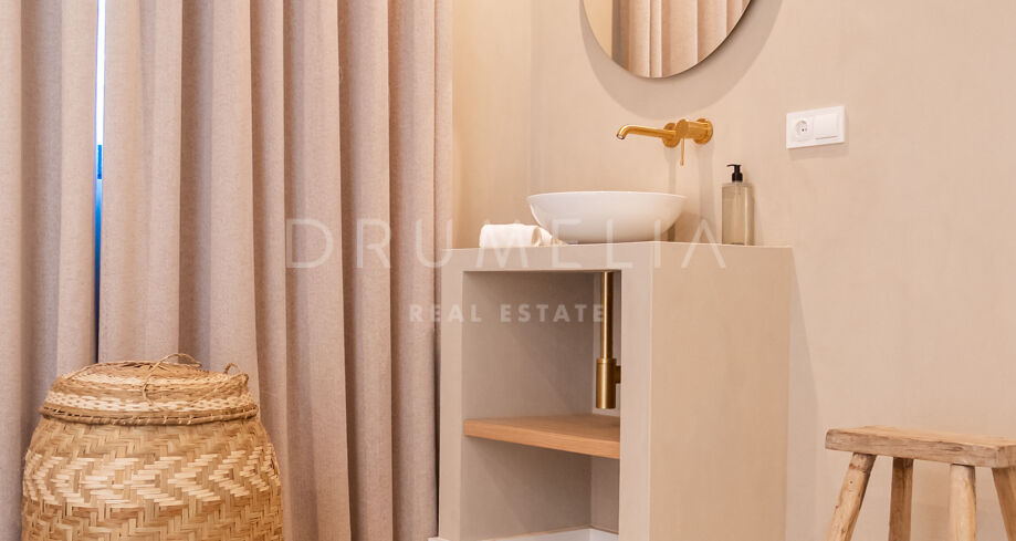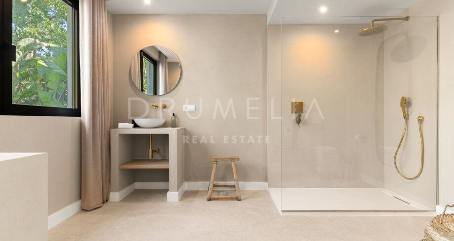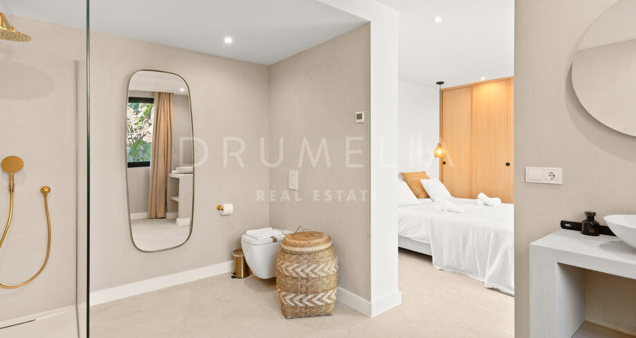 Situada en una parcela privada con acceso propio, la propiedad ha sido completamente rediseñada y reconstruida por Pro Reno Marbella. La reforma fue integral: se demolieron muros, se reorganizó la distribución, se renovó la fachada y los interiores se diseñaron desde cero. El resultado es una vivienda contemporánea refinada y atemporal.