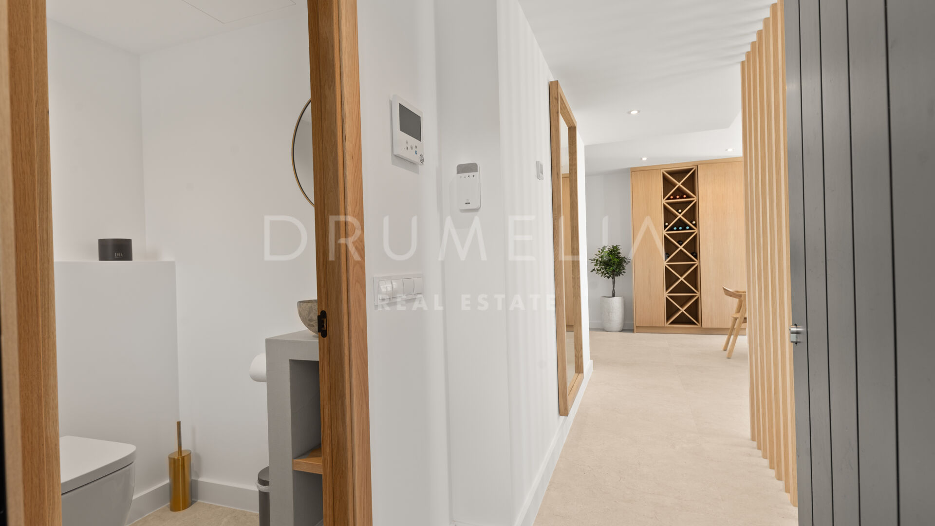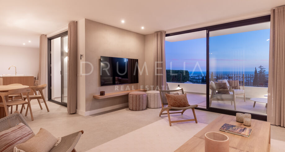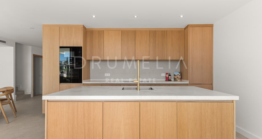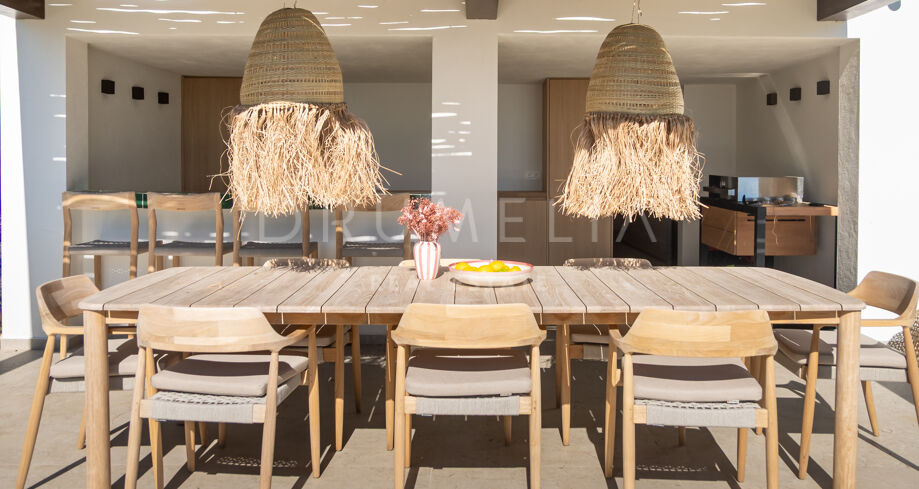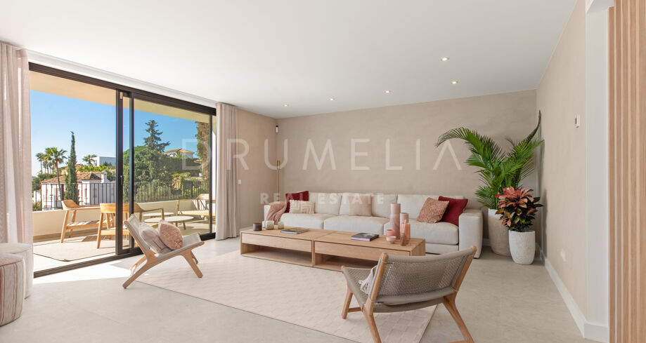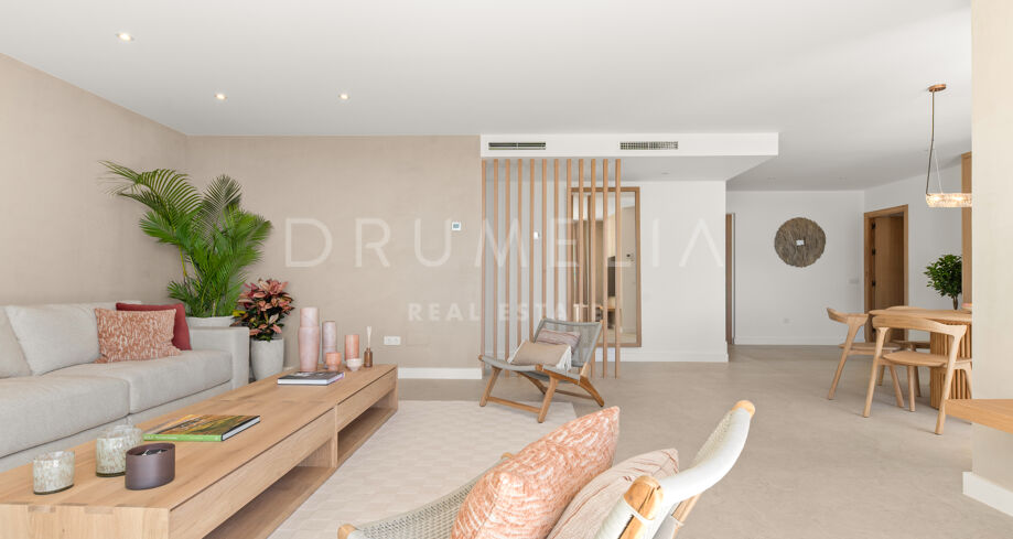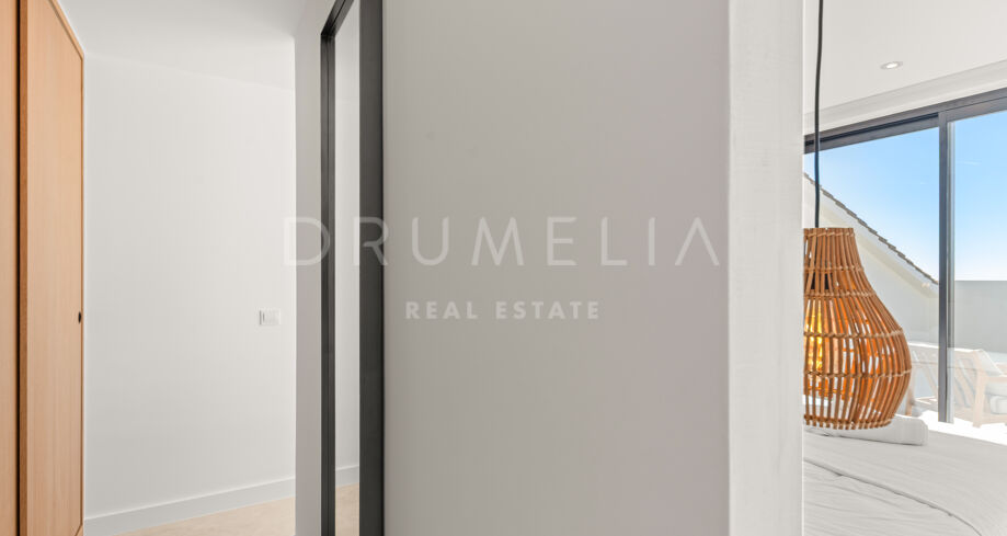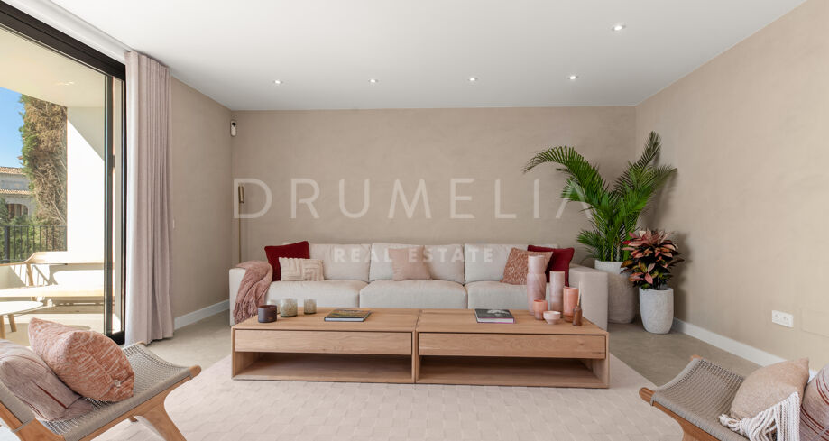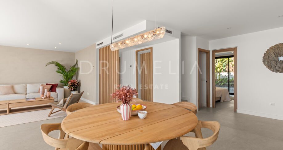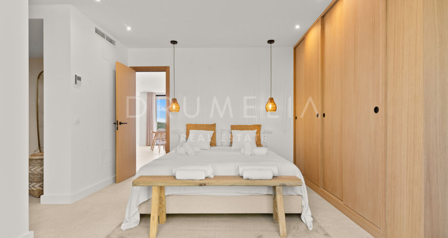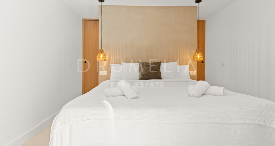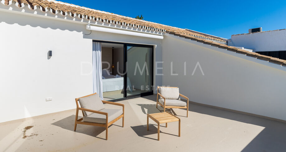 Situada en una parcela privada con acceso propio, la propiedad ha sido completamente rediseñada y reconstruida por Pro Reno Marbella. La reforma fue integral: se demolieron muros, se reorganizó la distribución, se renovó la fachada y los interiores se diseñaron desde cero. El resultado es una vivienda contemporánea refinada y atemporal.