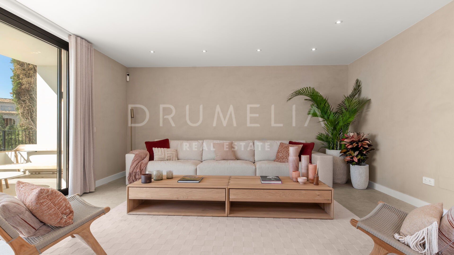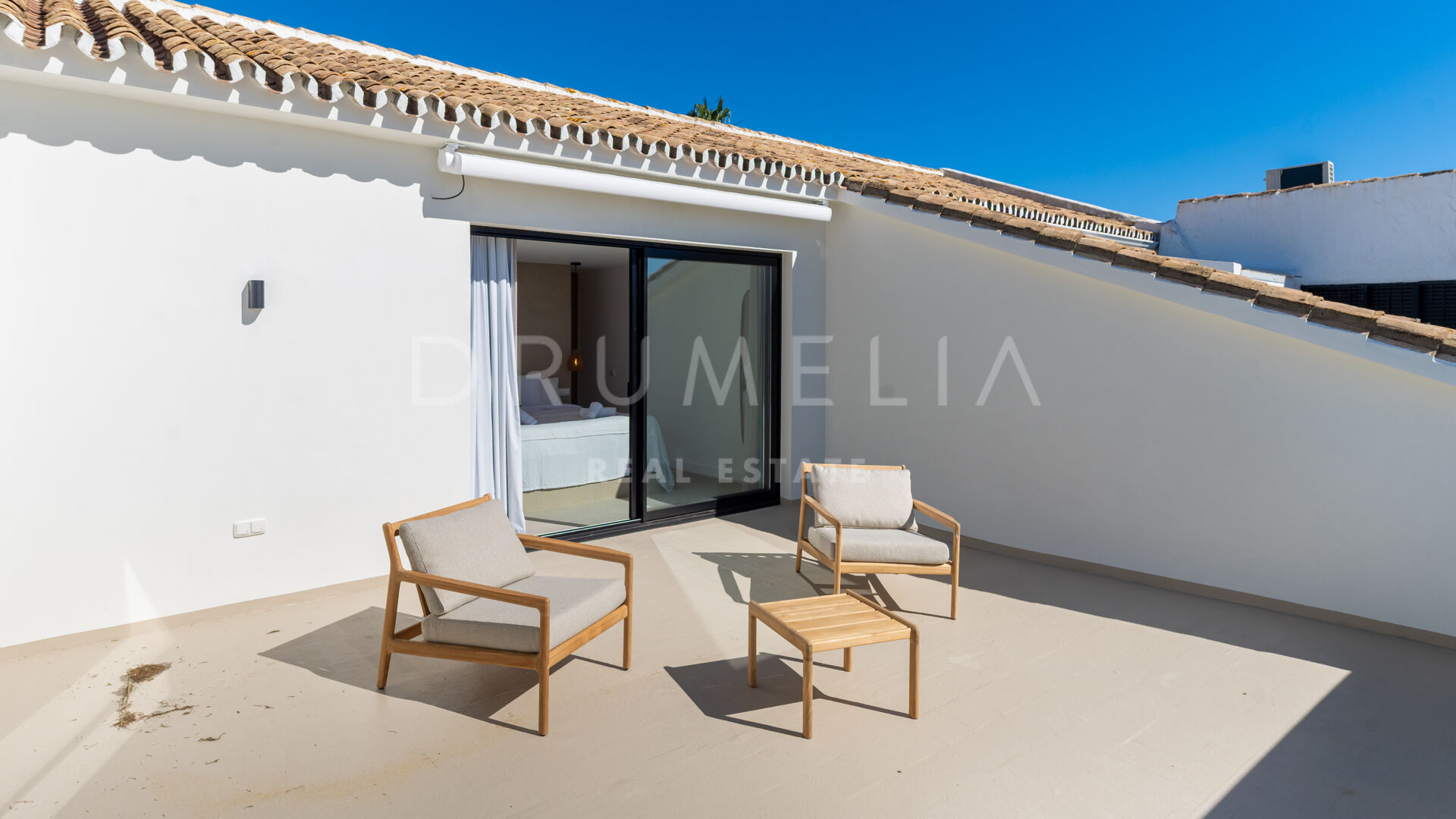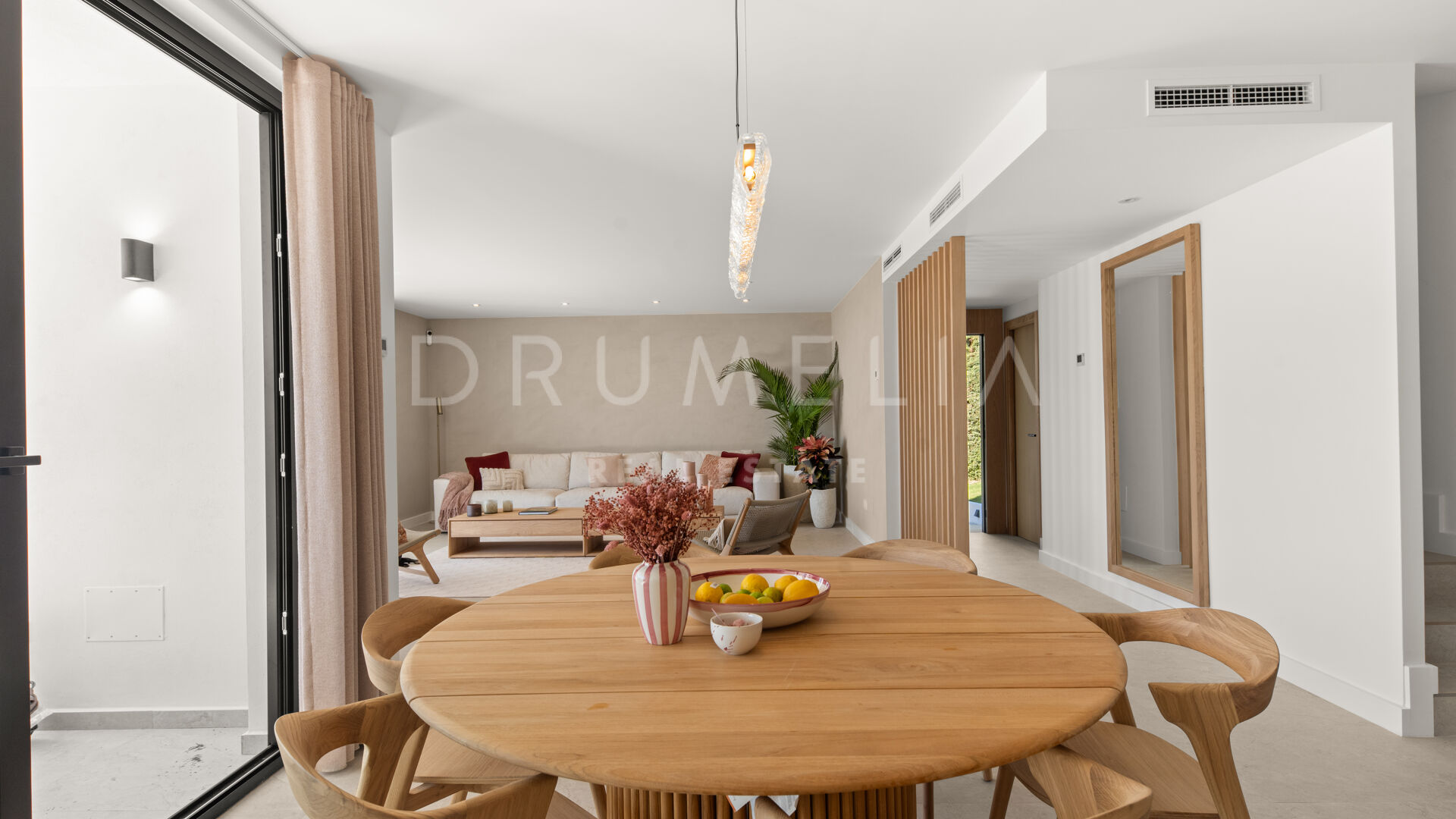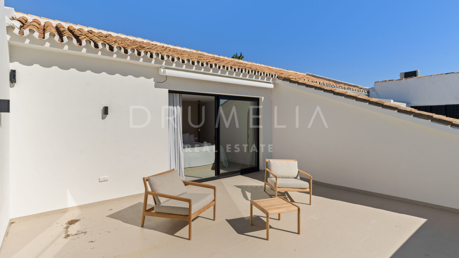Las paredes con acabado Mortex y las amplias puertas correderas conectan las zonas de estar con la terraza principal, creando una transición fluida entre interior y exterior. La villa dispone de cuatro dormitorios, todos con baño en suite. El salón principal se abre directamente a la terraza con vistas abiertas al mar. Una elegante escalera de entrada define la llegada a la propiedad.