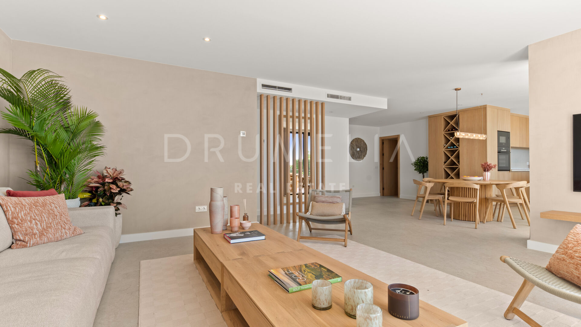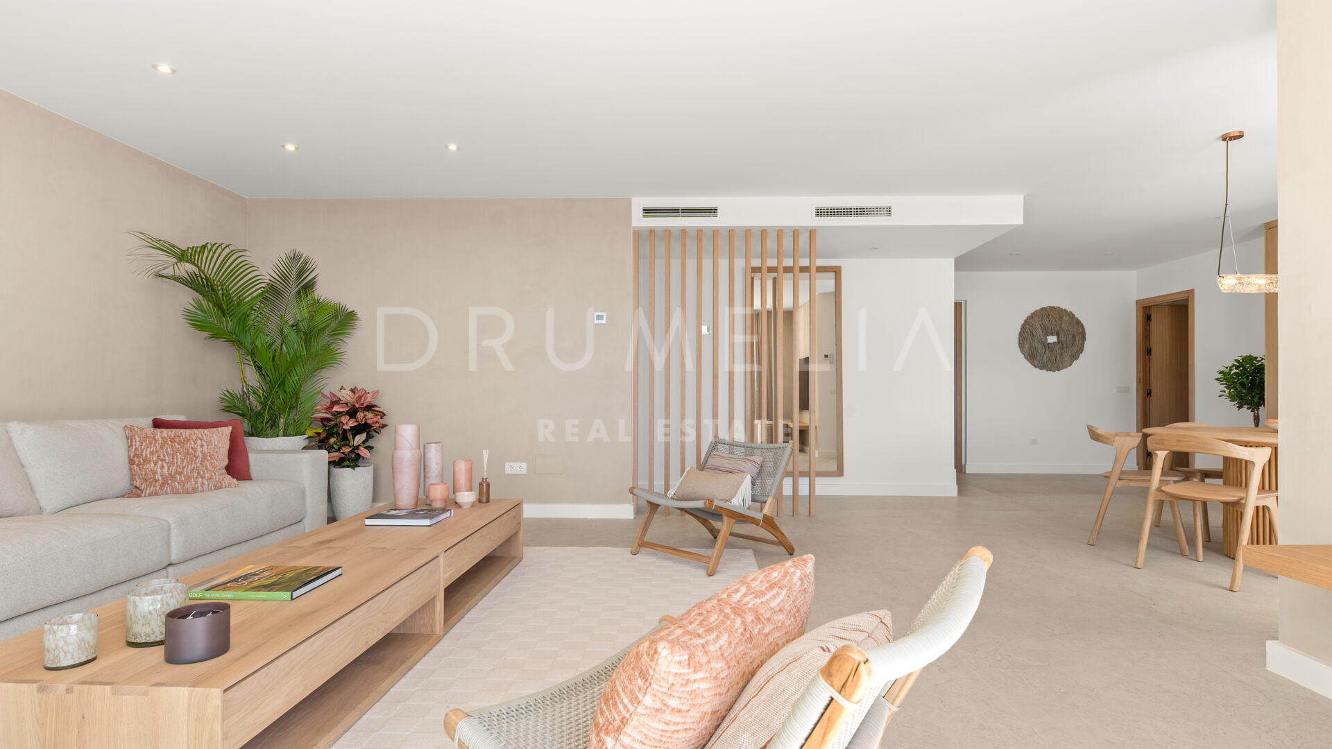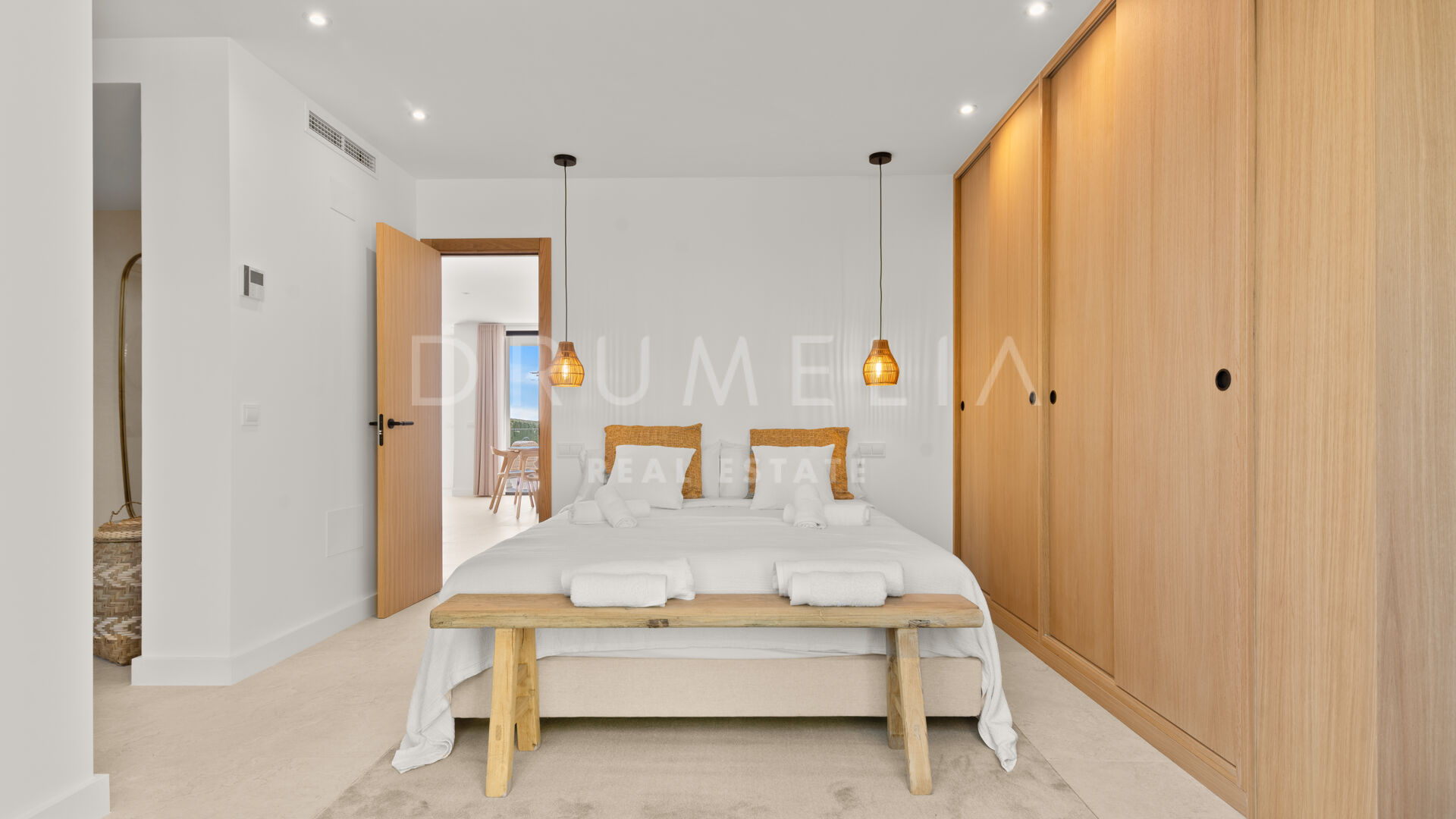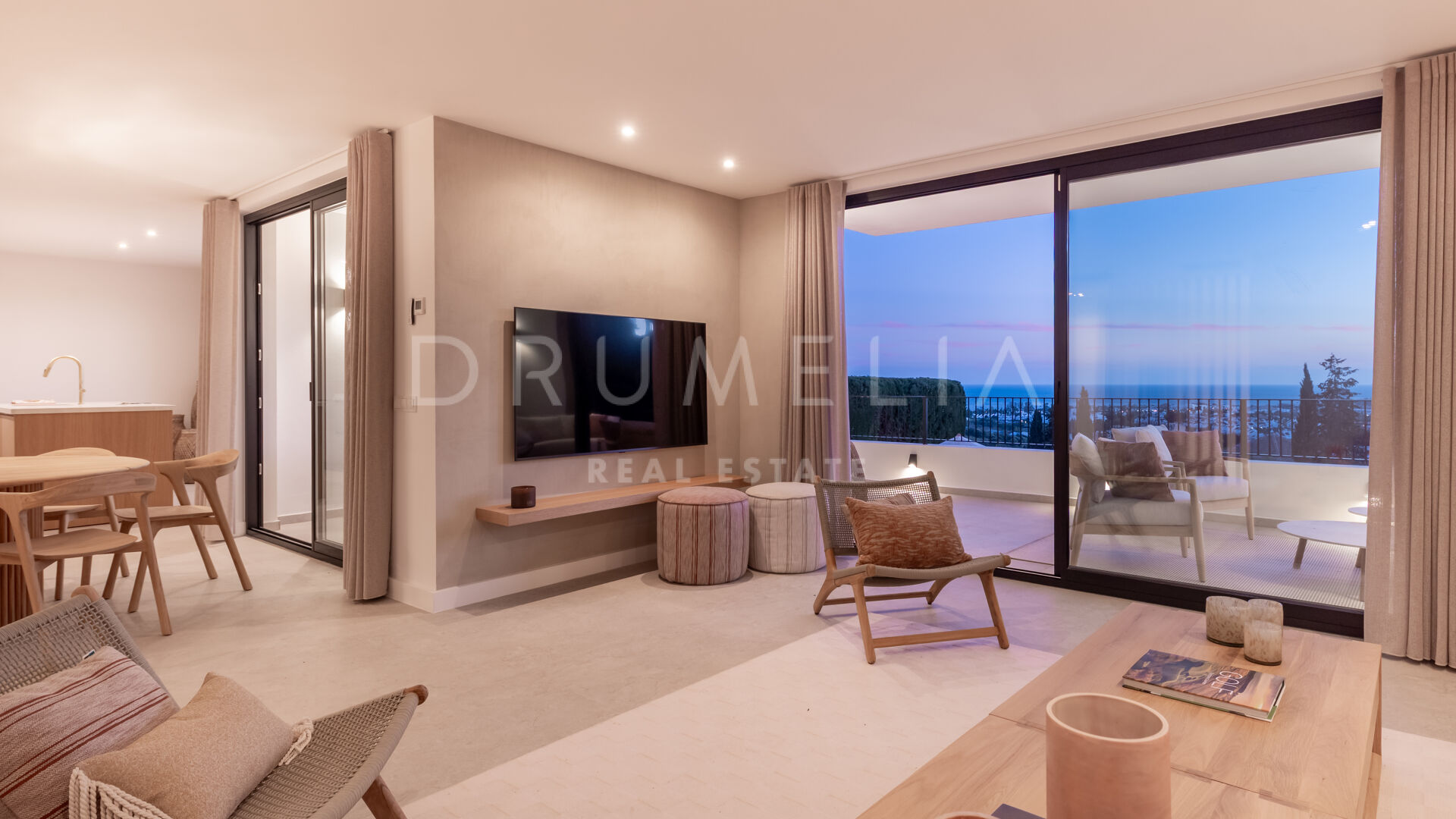 Las paredes con acabado Mortex y las amplias puertas correderas conectan las zonas de estar con la terraza principal, creando una transición fluida entre interior y exterior. La villa dispone de cuatro dormitorios, todos con baño en suite. El salón principal se abre directamente a la terraza con vistas abiertas al mar. Una elegante escalera de entrada define la llegada a la propiedad.