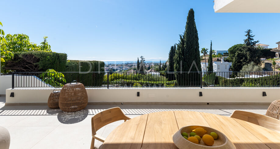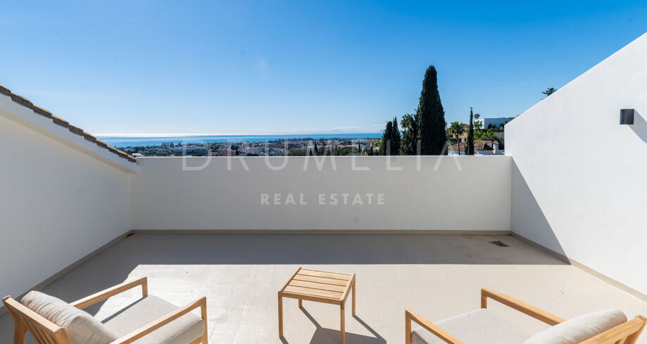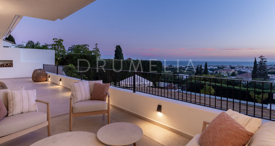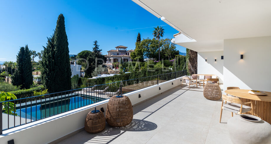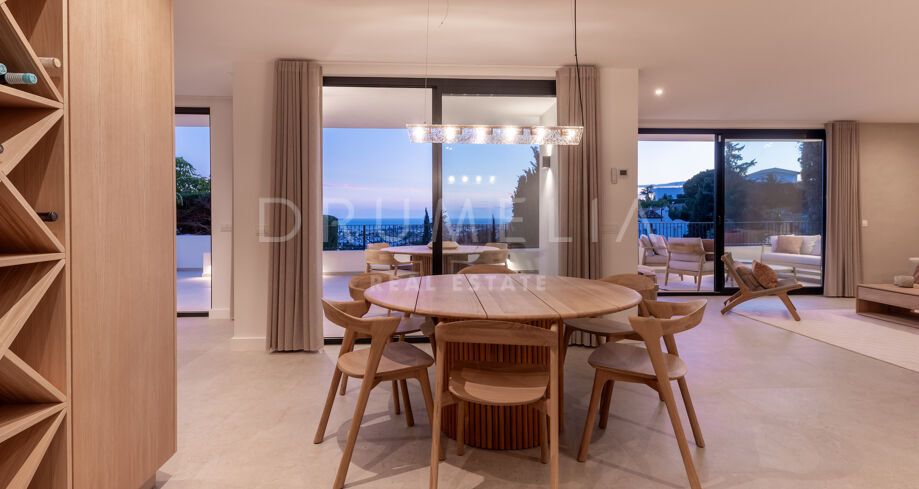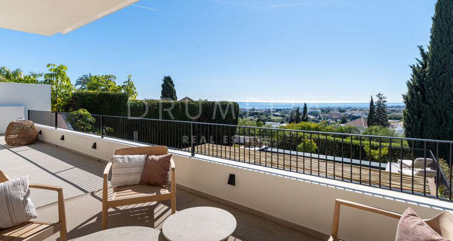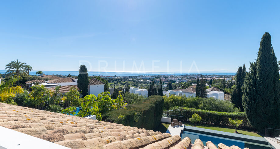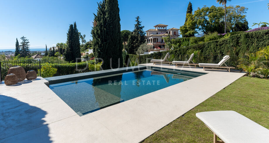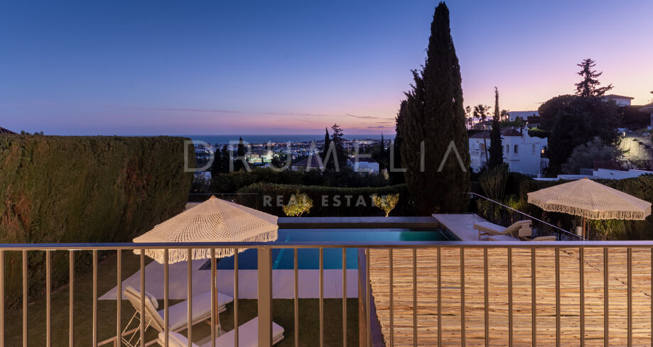 Ubicada en la prestigiosa zona residencial de Paraíso Alto, Benahavís, esta villa totalmente renovada ofrece vistas panorámicas al mar Mediterráneo hasta Gibraltar, visibles desde casi todos los espacios principales.