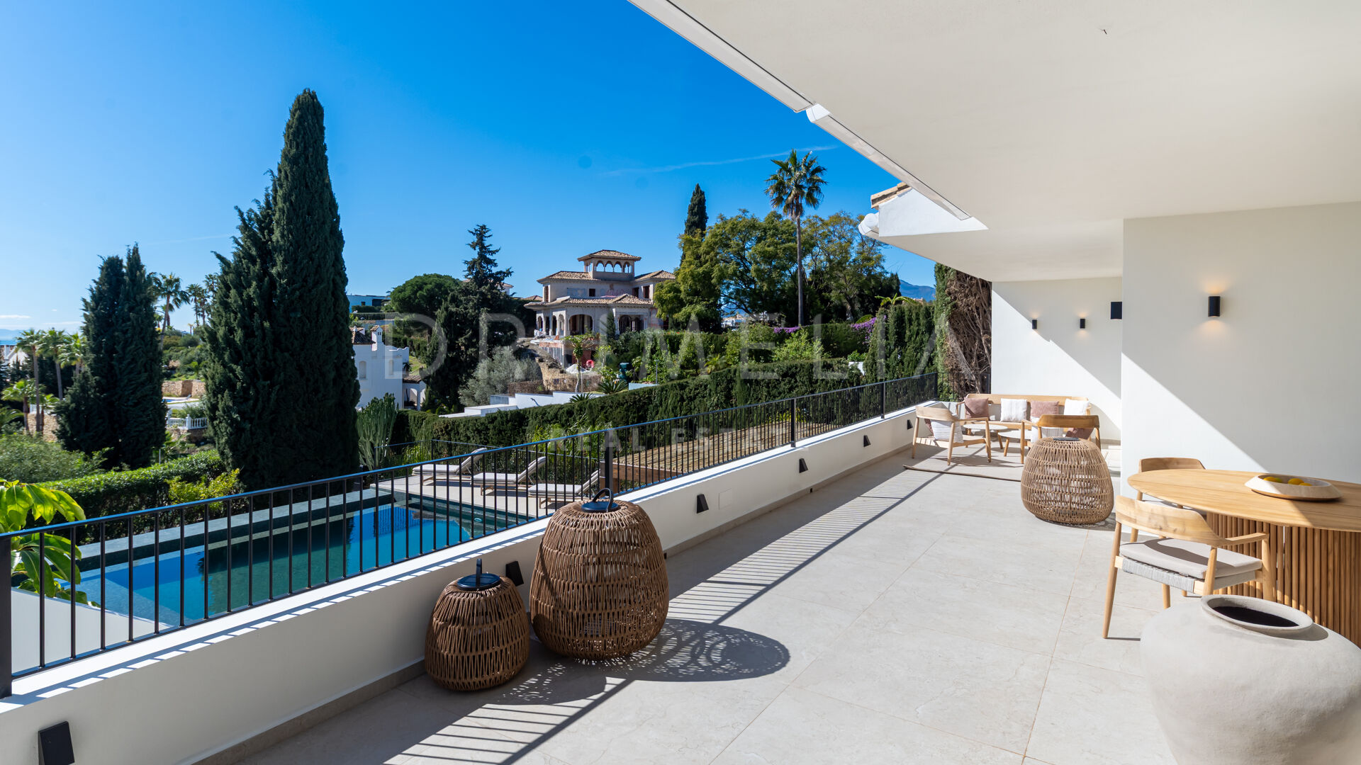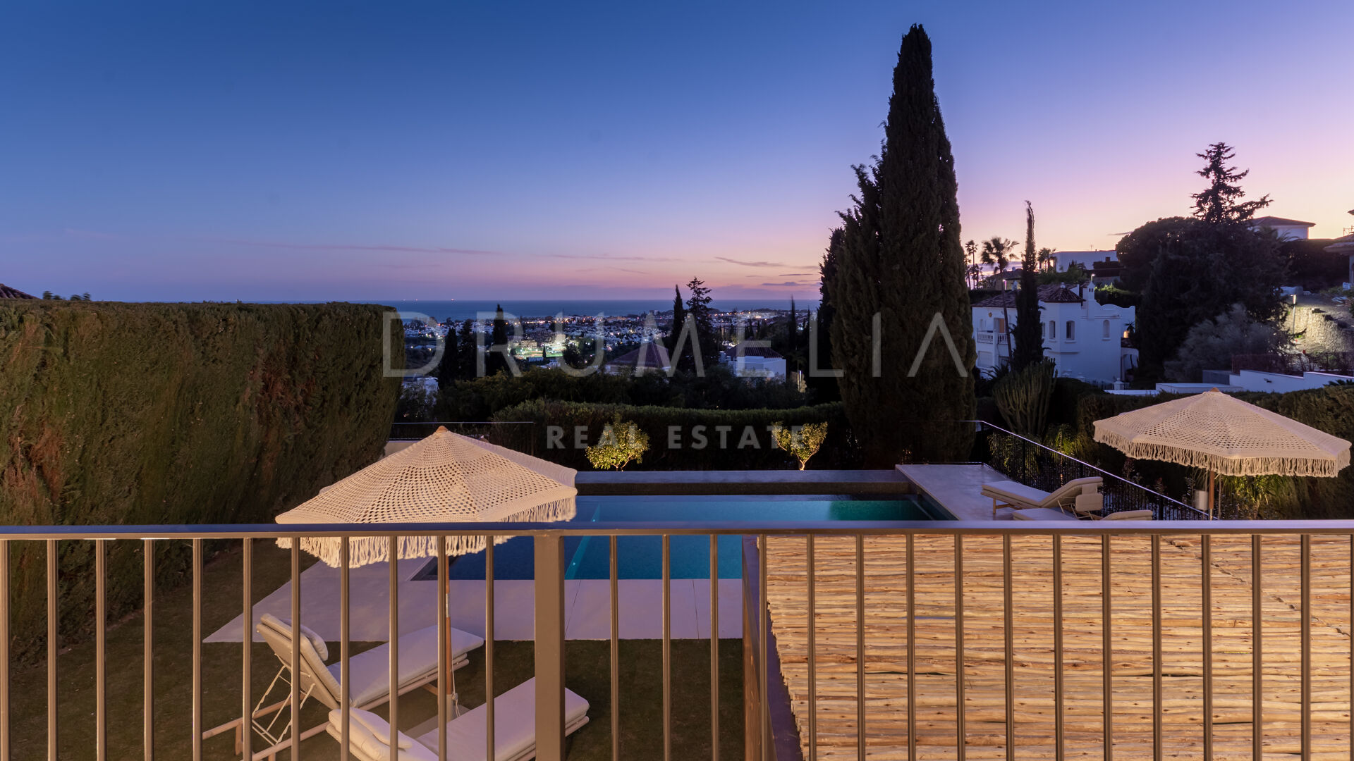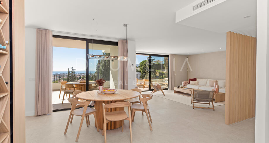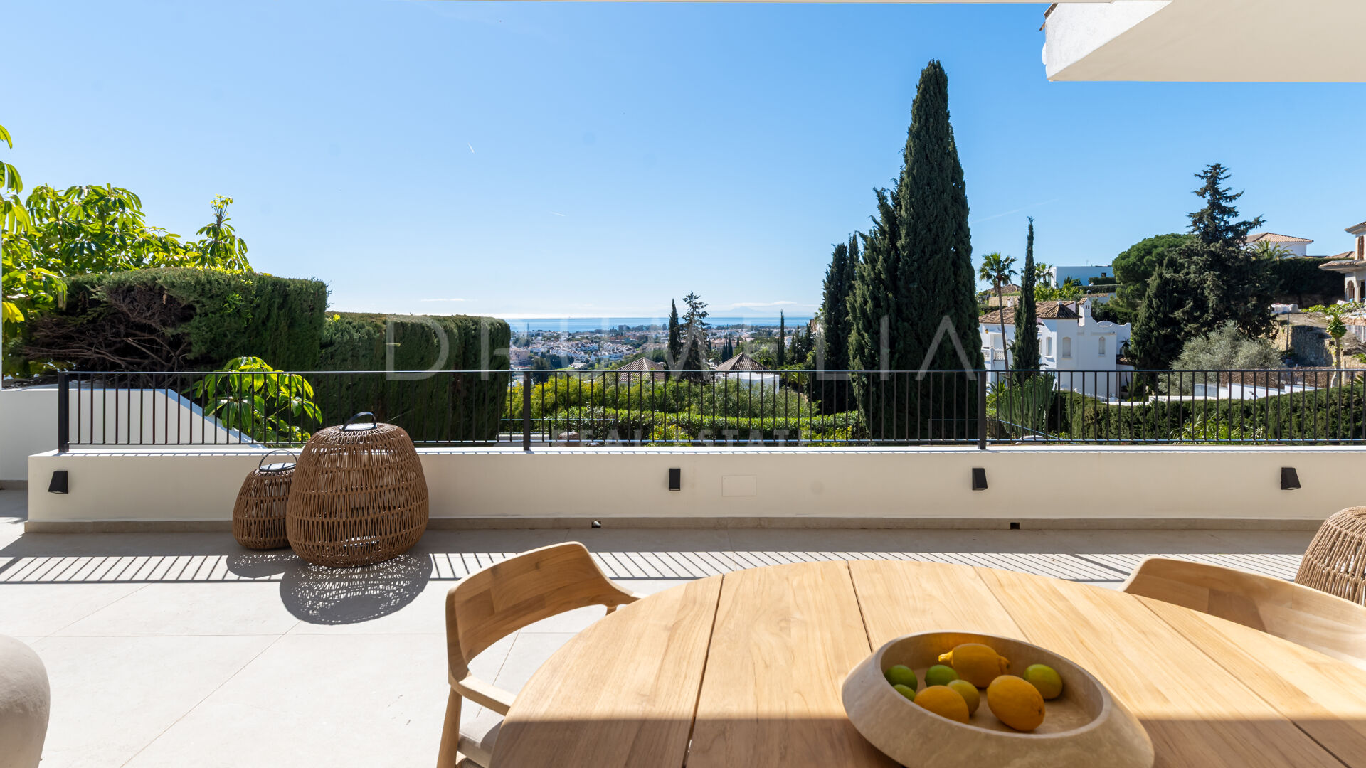Ubicada en la prestigiosa zona residencial de Paraíso Alto, Benahavís, esta villa totalmente renovada ofrece vistas panorámicas al mar Mediterráneo hasta Gibraltar, visibles desde casi todos los espacios principales.