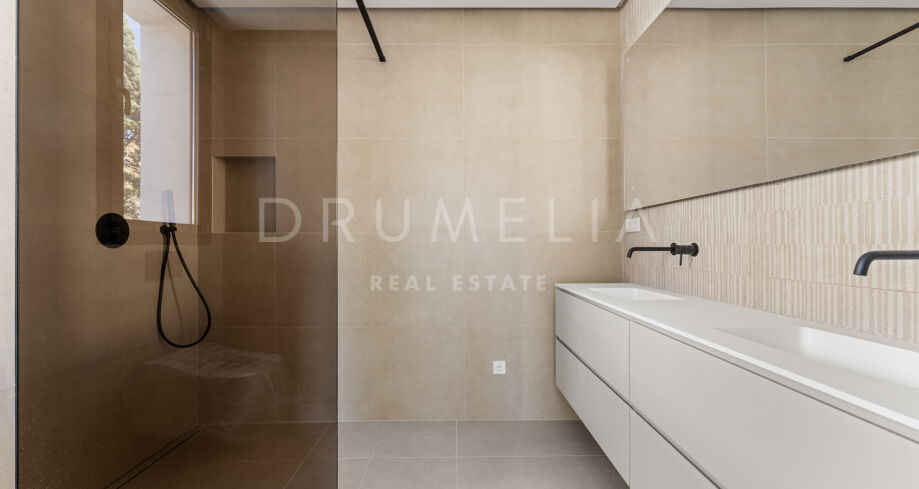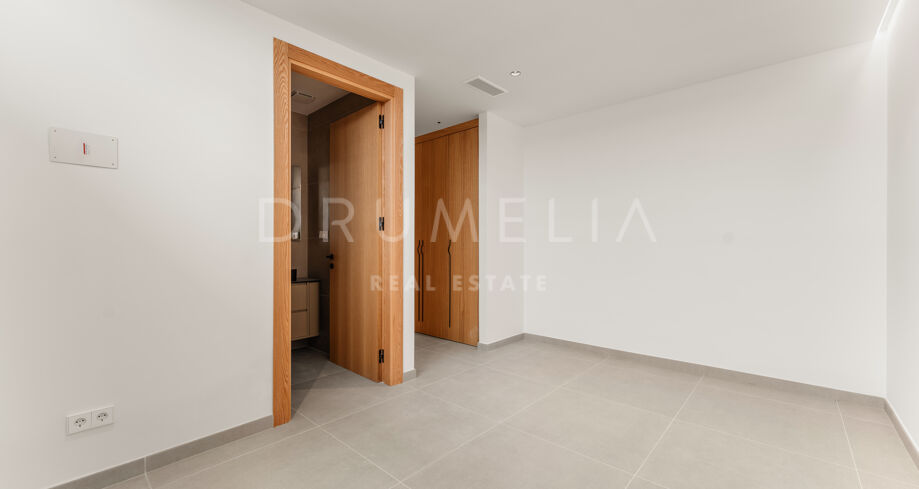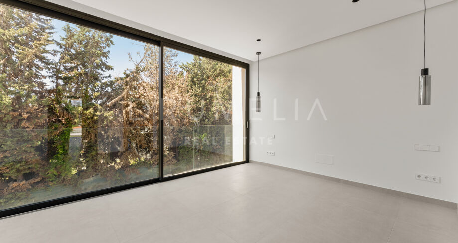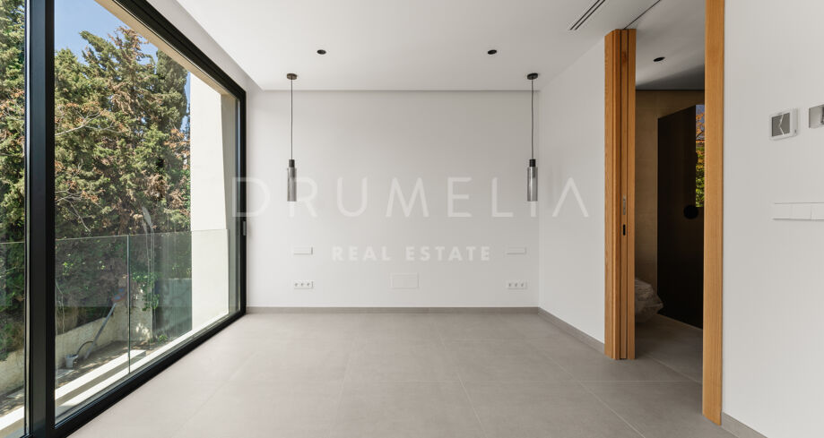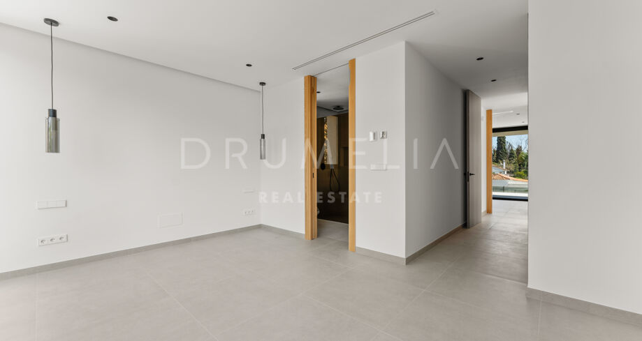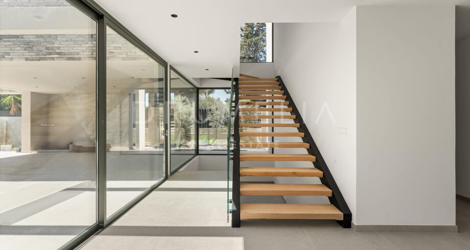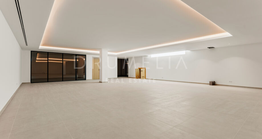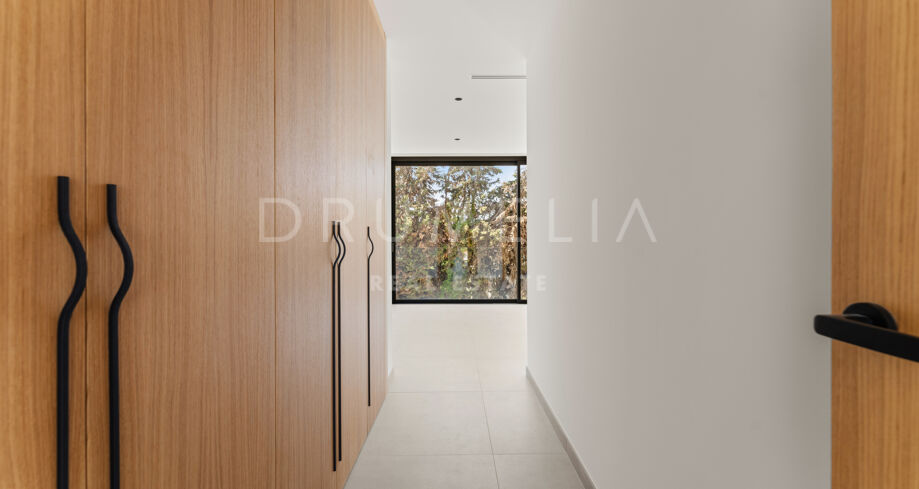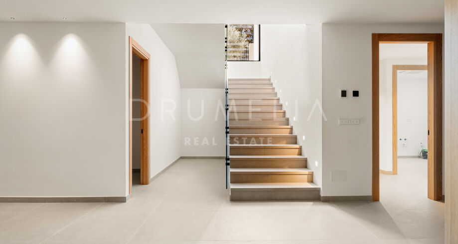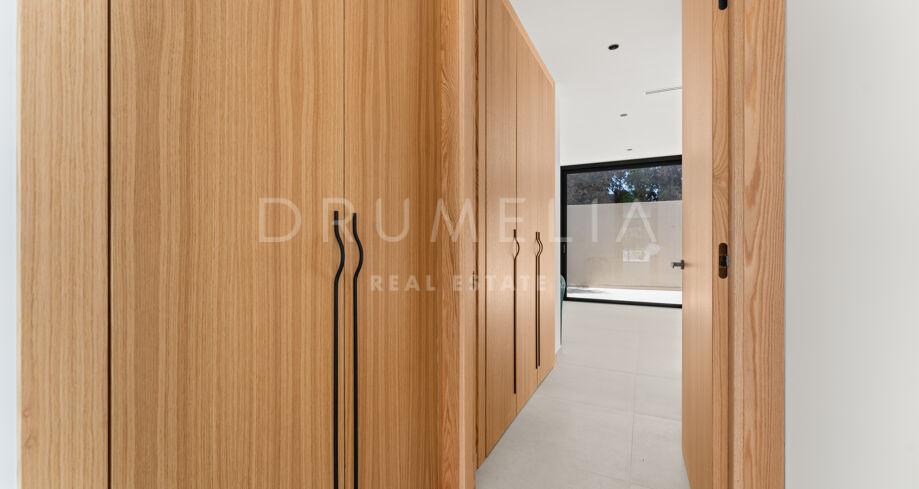 La villa dispone de ocho dormitorios en suite, todos con armarios empotrados. La suite principal incluye vestidor. El diseño interior neutro, los materiales naturales y los grandes ventanales que van del suelo al techo crean estancias luminosas y abiertas. La cocina abierta, el comedor y la sala de estar ofrecen una distribución funcional, con grandes puertas correderas que conectan con terrazas, jardín privado y piscina.