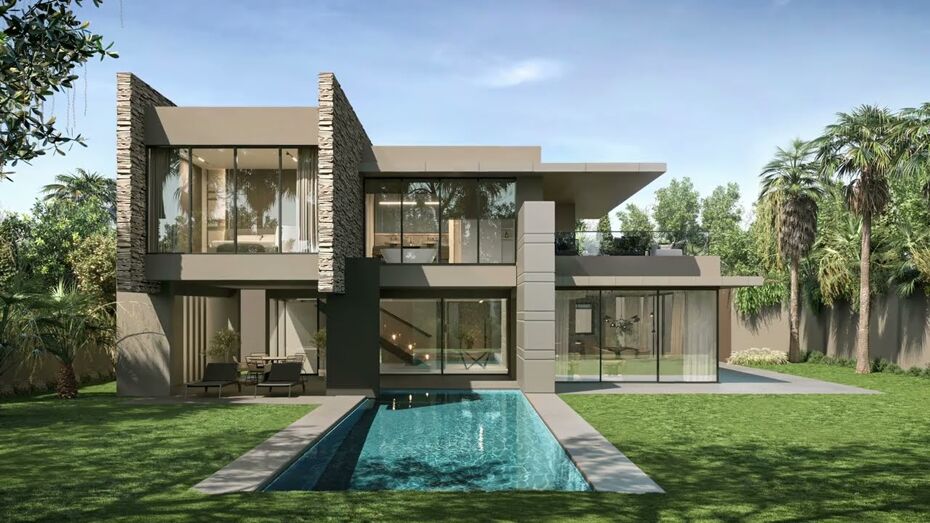 La propiedad sigue un diseño moderno y minimalista, priorizando la funcionalidad y los acabados de calidad. Las zonas exteriores incluyen jardines paisajistas, piscina y múltiples terrazas.
