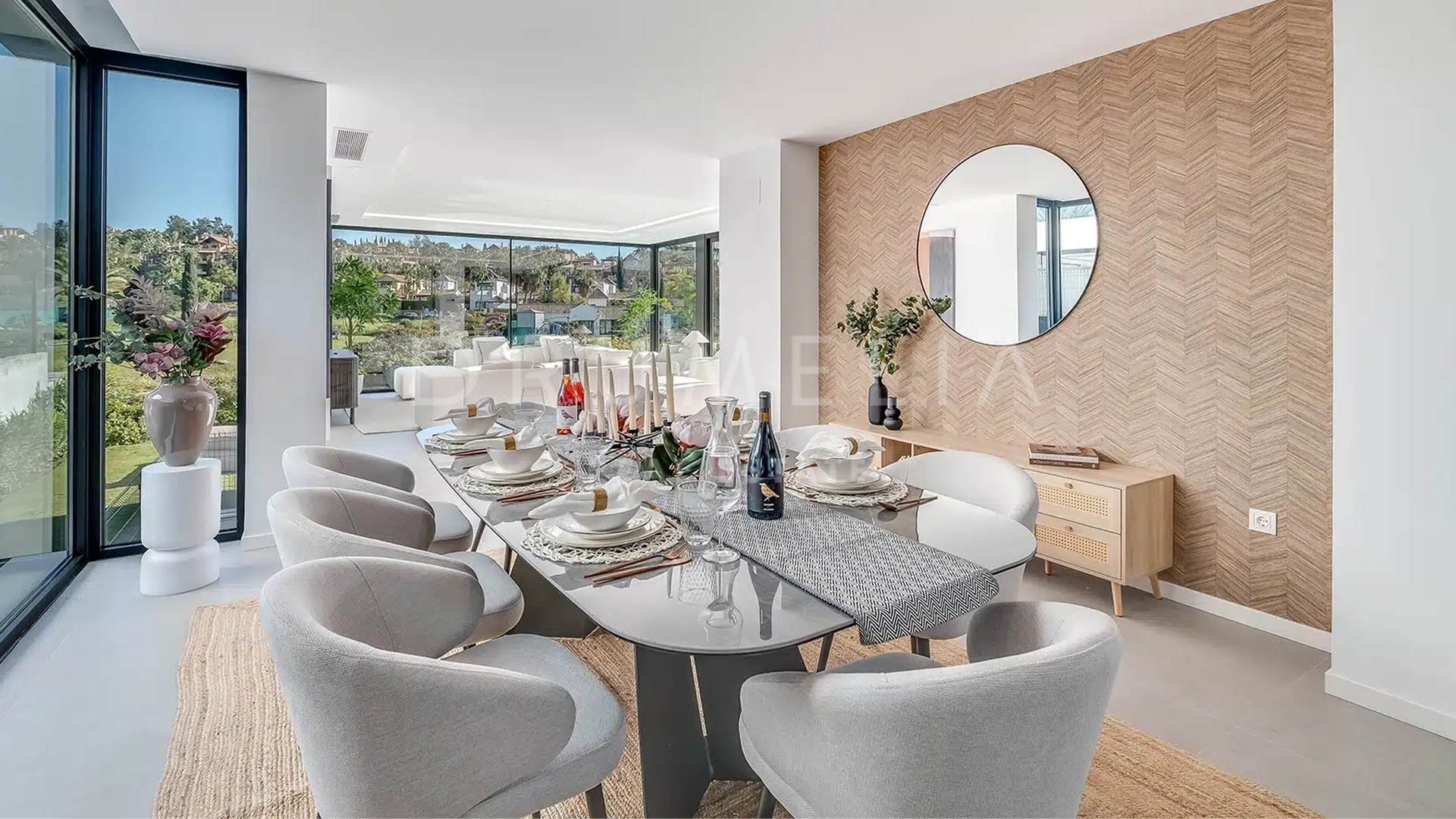Las zonas al aire libre están diseñadas para disfrutar durante todo el año, con terrazas cubiertas y descubiertas, espacios privados y vistas abiertas al campo de golf El Campanario. La propiedad también se beneficia de aparcamiento privado e instalaciones modernas compatibles con un hogar recién construido.