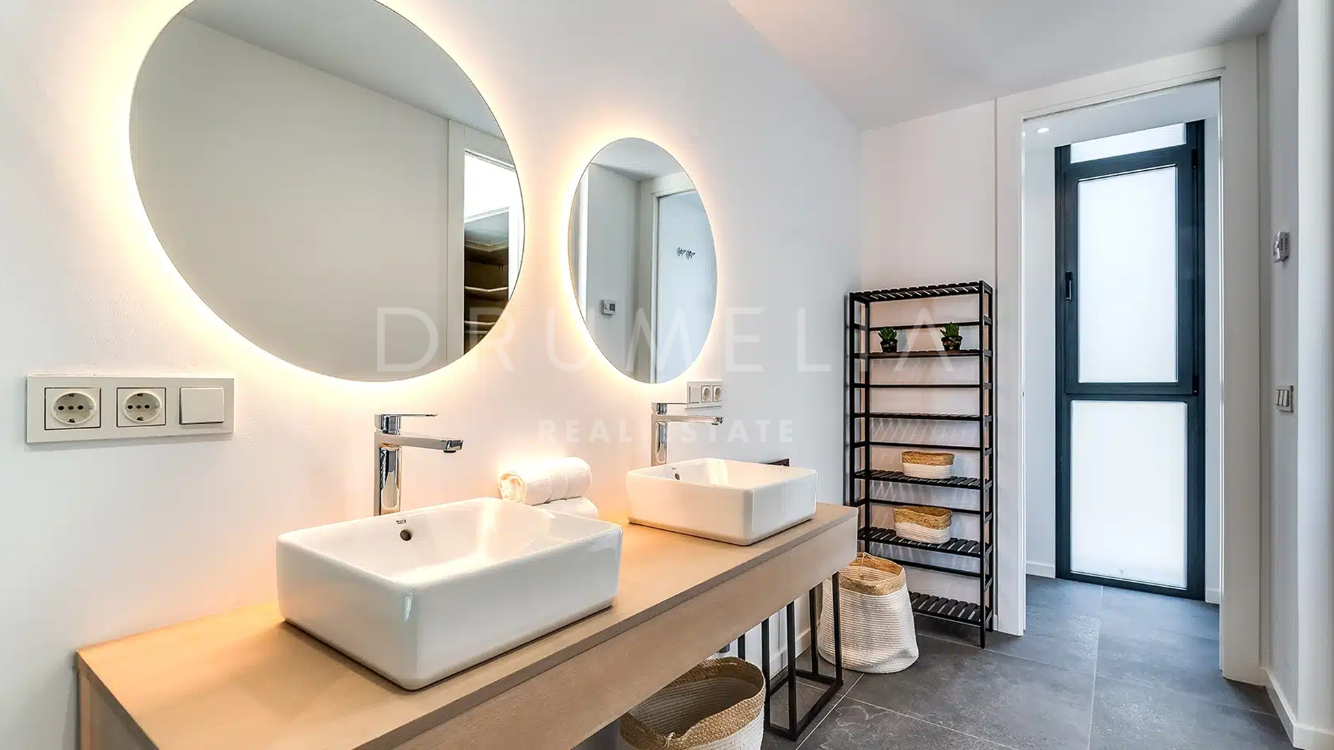 La villa consta de cinco dormitorios y cinco baños, incluyendo amplias suites en suite distribuidas en los niveles superior e inferior, ofreciendo privacidad y comodidad tanto para los residentes como para los huéspedes. El nivel inferior proporciona un espacio flexible adecuado para zonas de ocio adicionales, gimnasio, sala de cine o alojamiento de invitados, dependiendo de las preferencias del propietario.