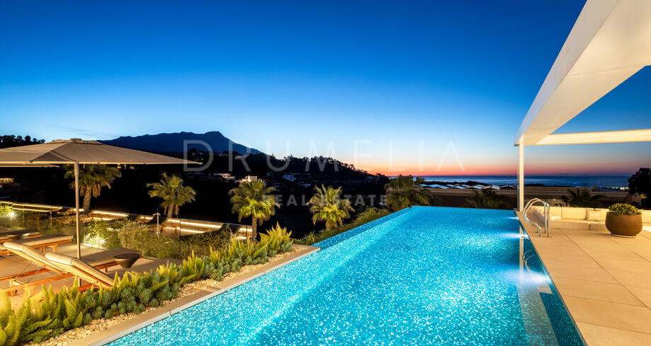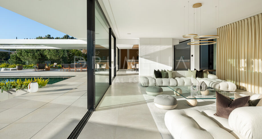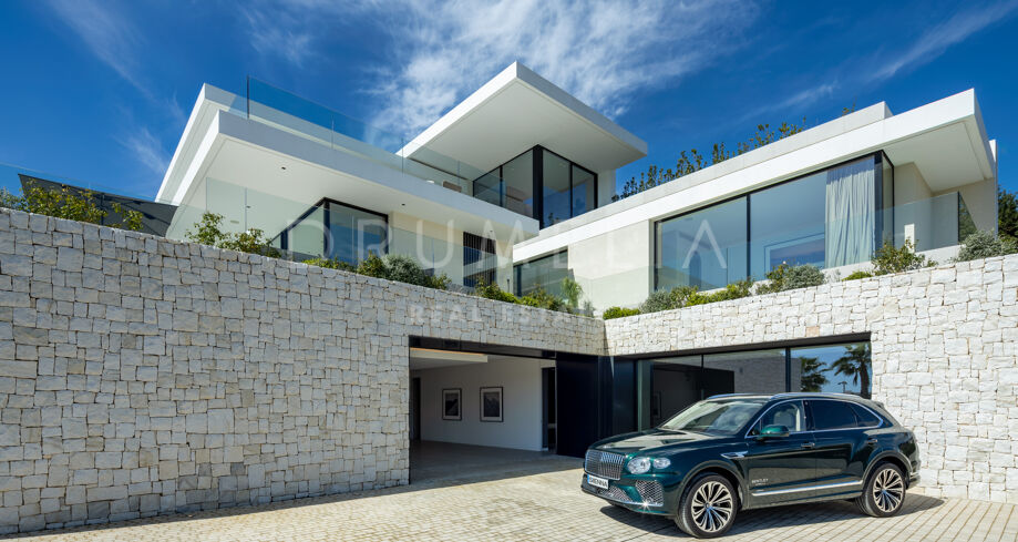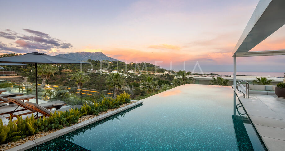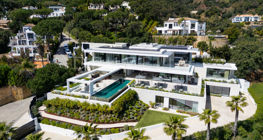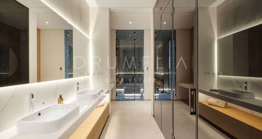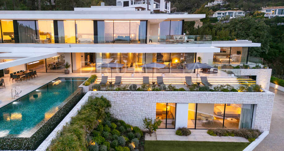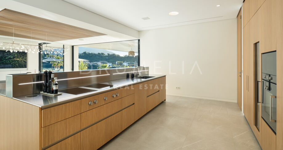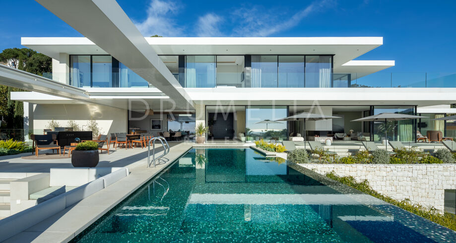 La vida al aire libre es igualmente impresionante, con amplias terrazas, tanto sombreadas como soleadas, diseñadas para cenar al aire libre o relajarse tranquilamente. Una chimenea de gas empotrada amplía la usabilidad en los meses más fríos, mientras que la amplia piscina infinita de doble tamaño, con calefacción, una cubierta automática oculta y un sistema de agua salada, parece fluir sin interrupción hacia el horizonte, ofreciendo unas vistas panorámicas fascinantes.