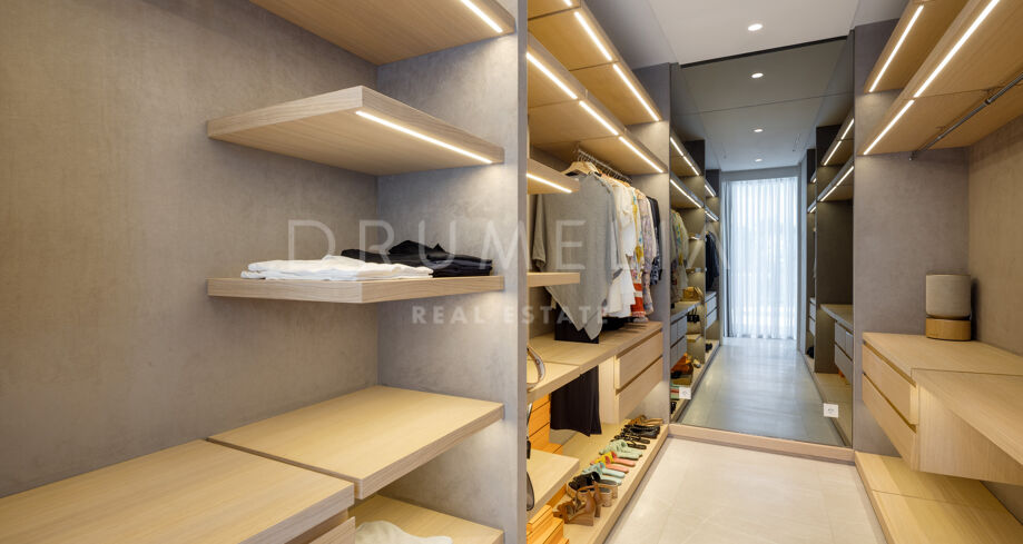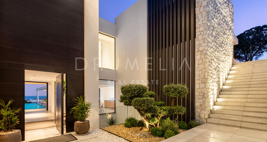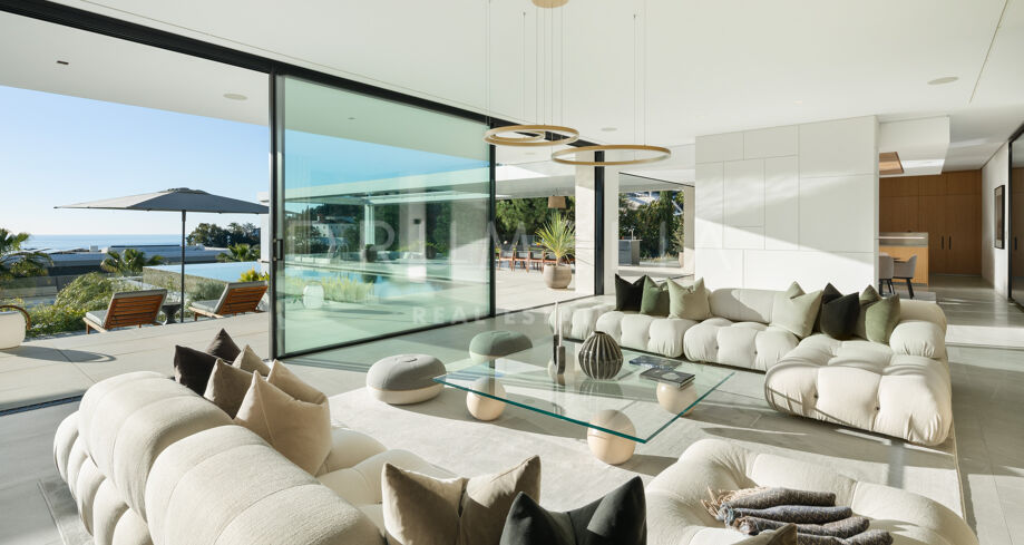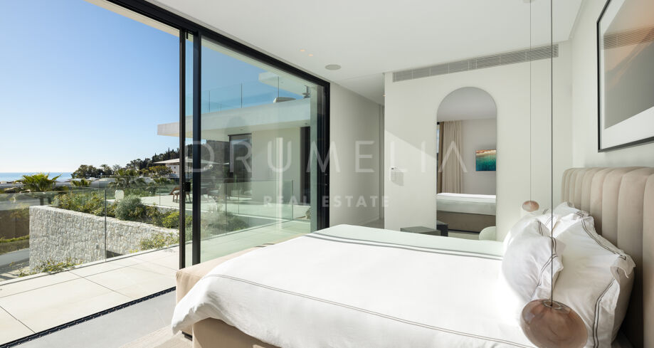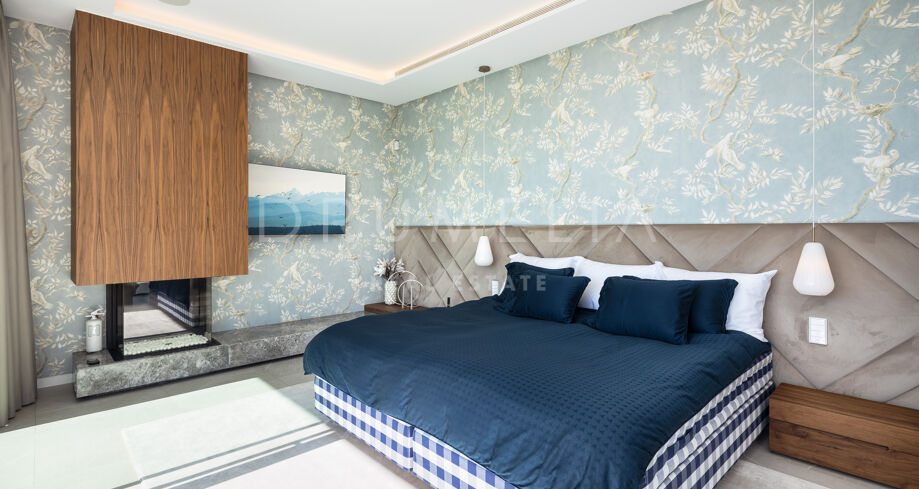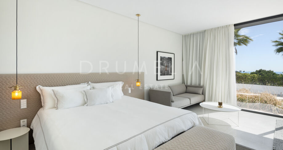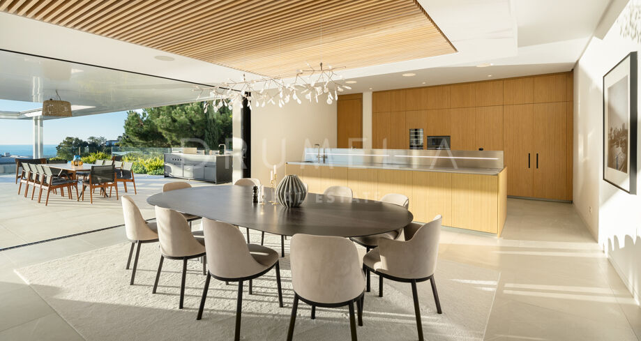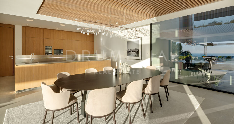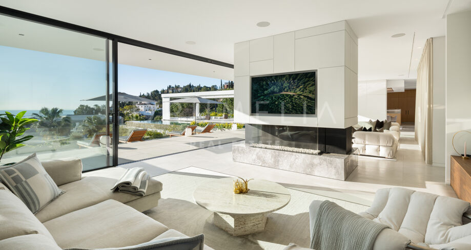 Con ocho amplios dormitorios en suite y dos baños adicionales para invitados, la casa está diseñada para una vida y un alojamiento sin complicaciones. La planta diáfana une a la perfección los elegantes salones y comedores con una cocina Gaggenau de última generación, equipada con los electrodomésticos más avanzados. Los techos altos y los paneles de cristal de suelo a techo bañan los interiores con luz natural, creando una atmósfera luminosa y aireada, a la vez que capturan unas vistas ininterrumpidas al mar. Una elegante y contemporánea chimenea sirve de punto focal, infundiendo al espacio calidez y un lujo discreto.