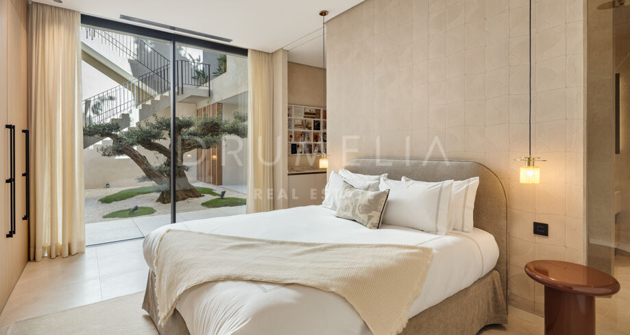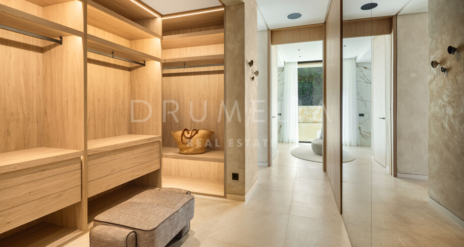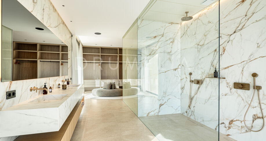 La zona principal de estar es espaciosa y está llena de luz natural. Las puertas correderas de suelo a techo conectan el salón y el comedor directamente con las terrazas y la zona de la piscina, creando una transición perfecta entre el interior y el exterior. La cocina moderna está equipada con electrodomésticos de alta gama e incluye una cocina de preparación independiente, ideal para recibir invitados y para el servicio de chef privado. Esta villa contemporánea en Benahavís ofrece seis dormitorios, cada uno con su propio baño en suite. La planta superior está completamente dedicada a la suite principal, proporcionando un refugio privado con una gran terraza y vistas ininterrumpidas al mar. Vestidores y un elegante baño completan este nivel. La distribución de la vivienda garantiza privacidad, confort y funcionalidad en todos los espacios.