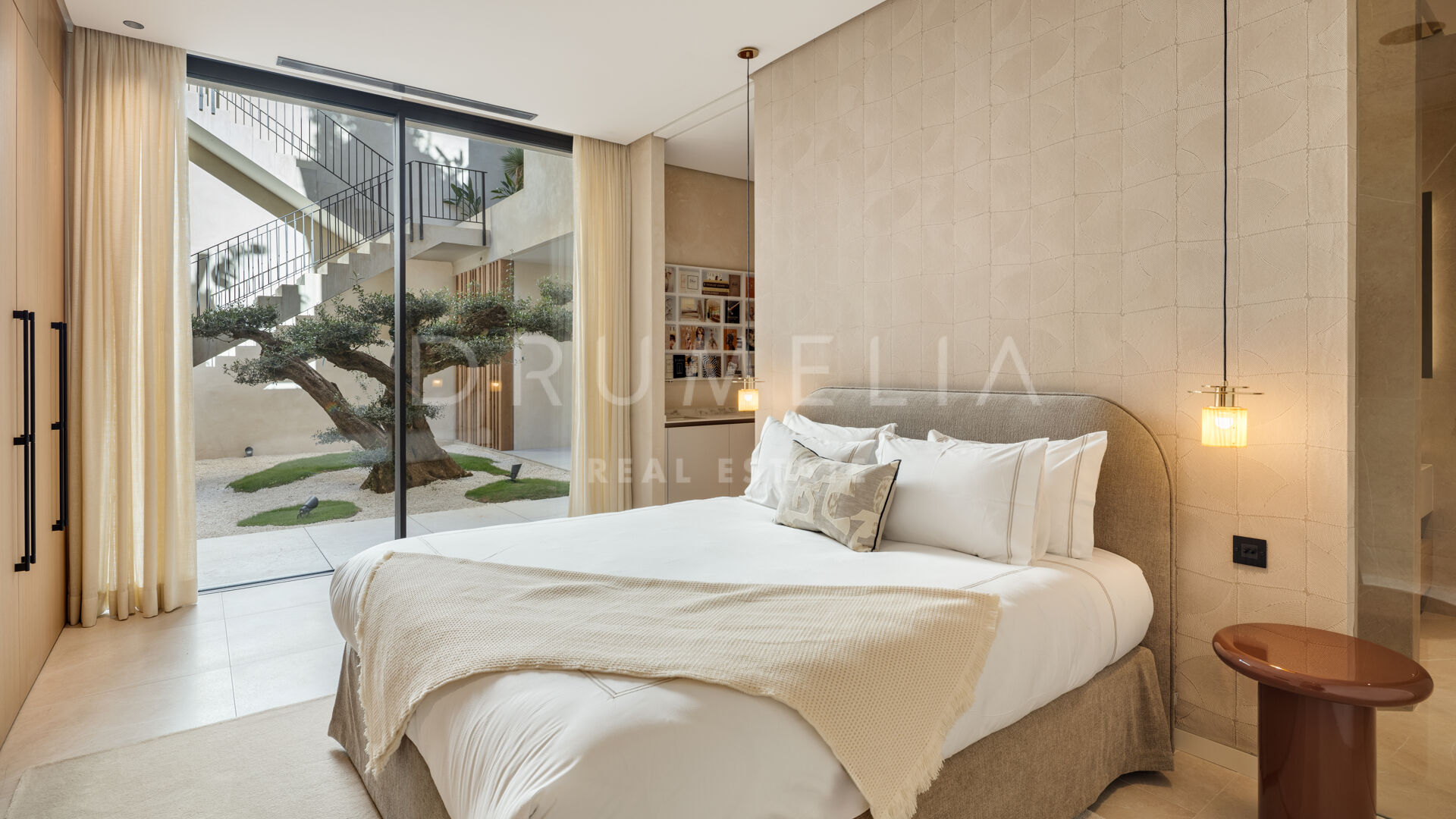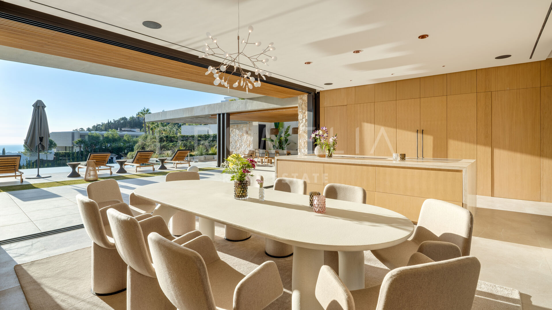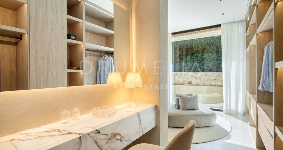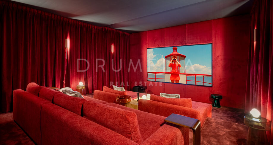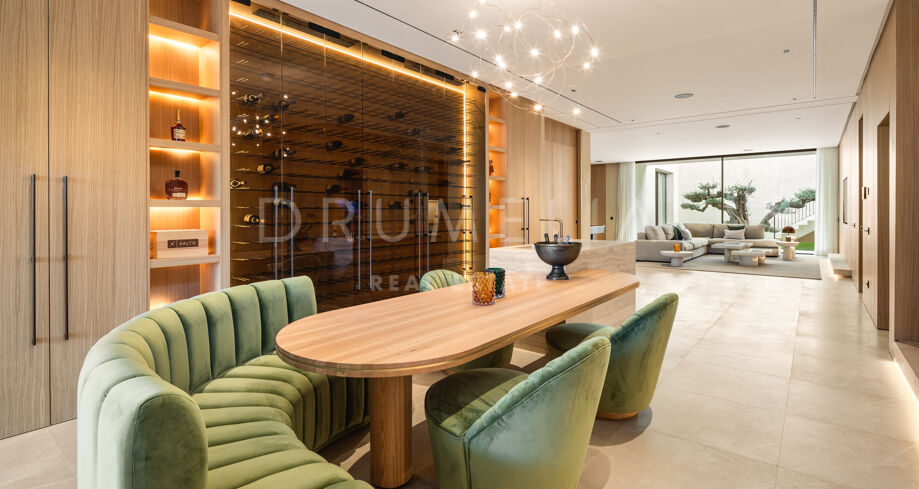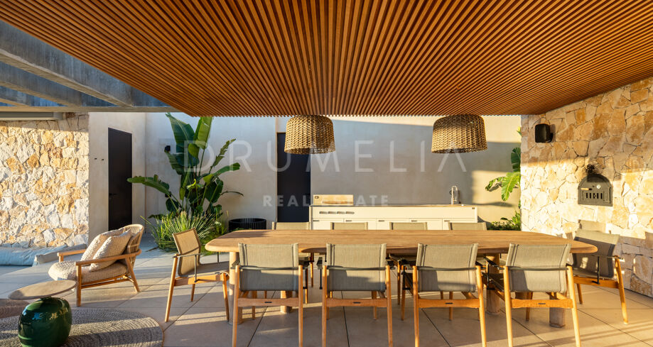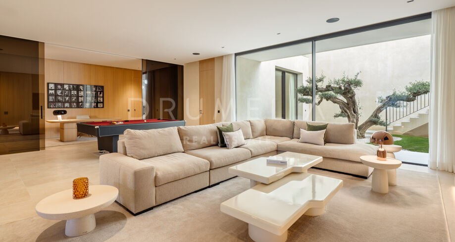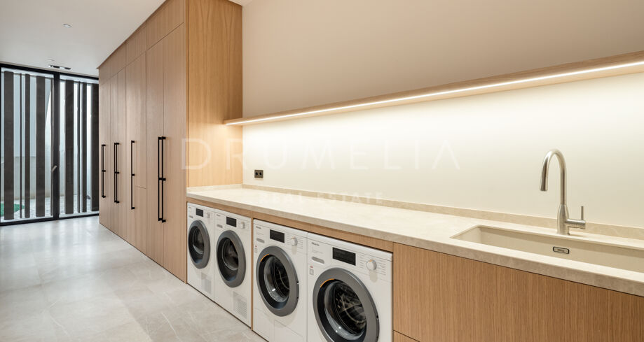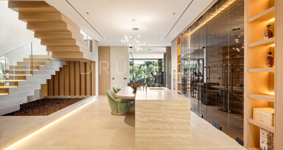 La propiedad cuenta con ascensor que conecta todas las plantas y un sistema domótico que controla la iluminación, el clima y la seguridad. La sala técnica se encuentra fuera de la estructura principal para mayor discreción y facilitar el mantenimiento. Materiales naturales, detalles en madera y grandes superficies acristaladas aportan calidez a la arquitectura contemporánea. En el exterior, la piscina de agua salada está rodeada de jardines paisajísticos y amplias terrazas. Una cocina exterior y zonas de estar al aire libre ofrecen el entorno perfecto para el entretenimiento y las comidas al fresco. El aparcamiento privado está disponible con la posibilidad de crear un garaje cerrado.