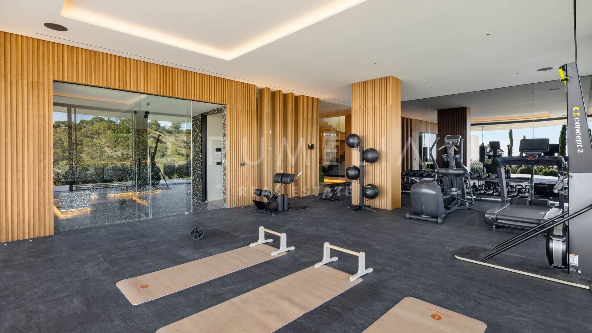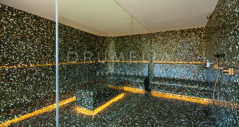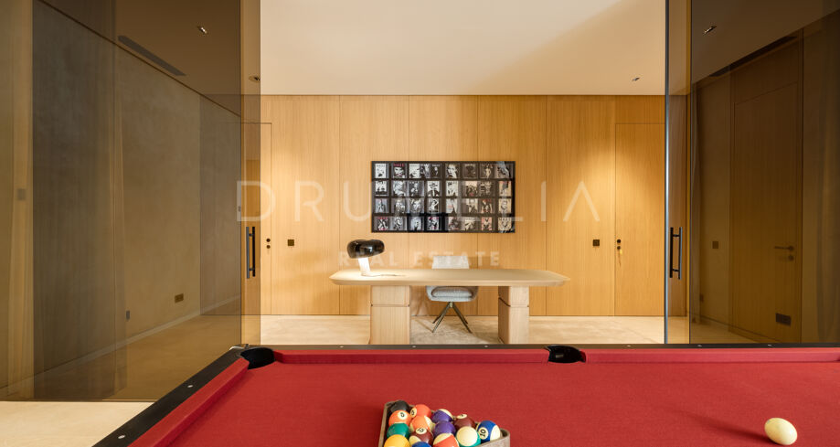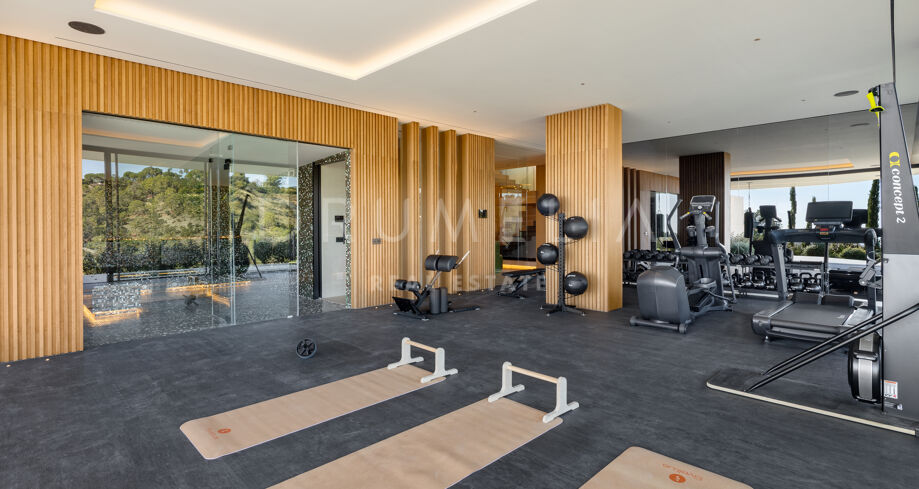 La planta inferior está diseñada para el ocio y el bienestar. Incluye una sala de cine privada, zona de juegos, bodega, hammam, piscina de inmersión y un gimnasio totalmente equipado con espacios para entrenar tanto en interior como al aire libre. Un apartamento independiente de dos dormitorios para invitados, con acceso propio, añade flexibilidad para visitantes o personal.