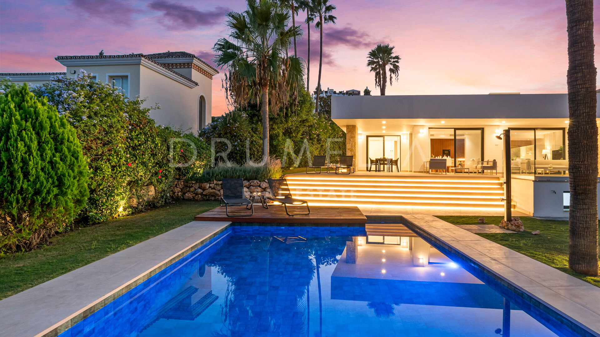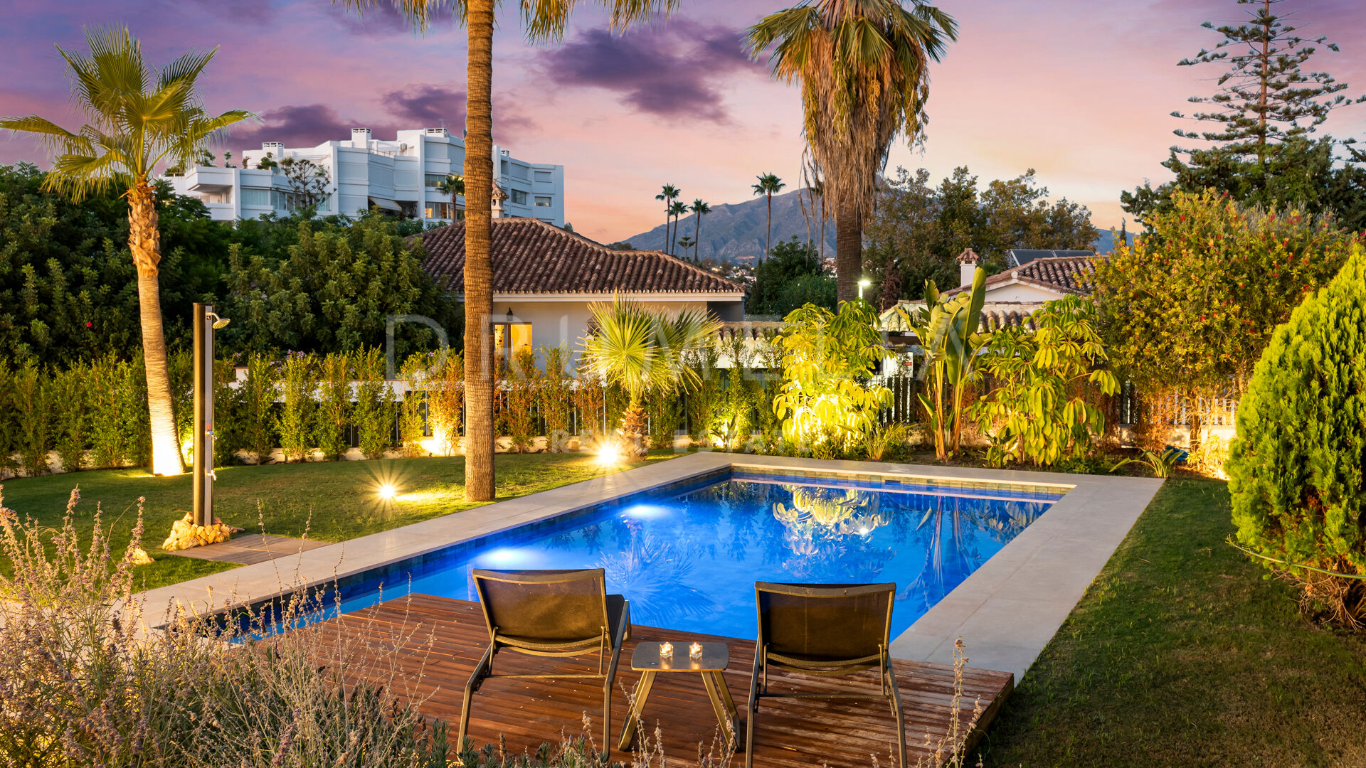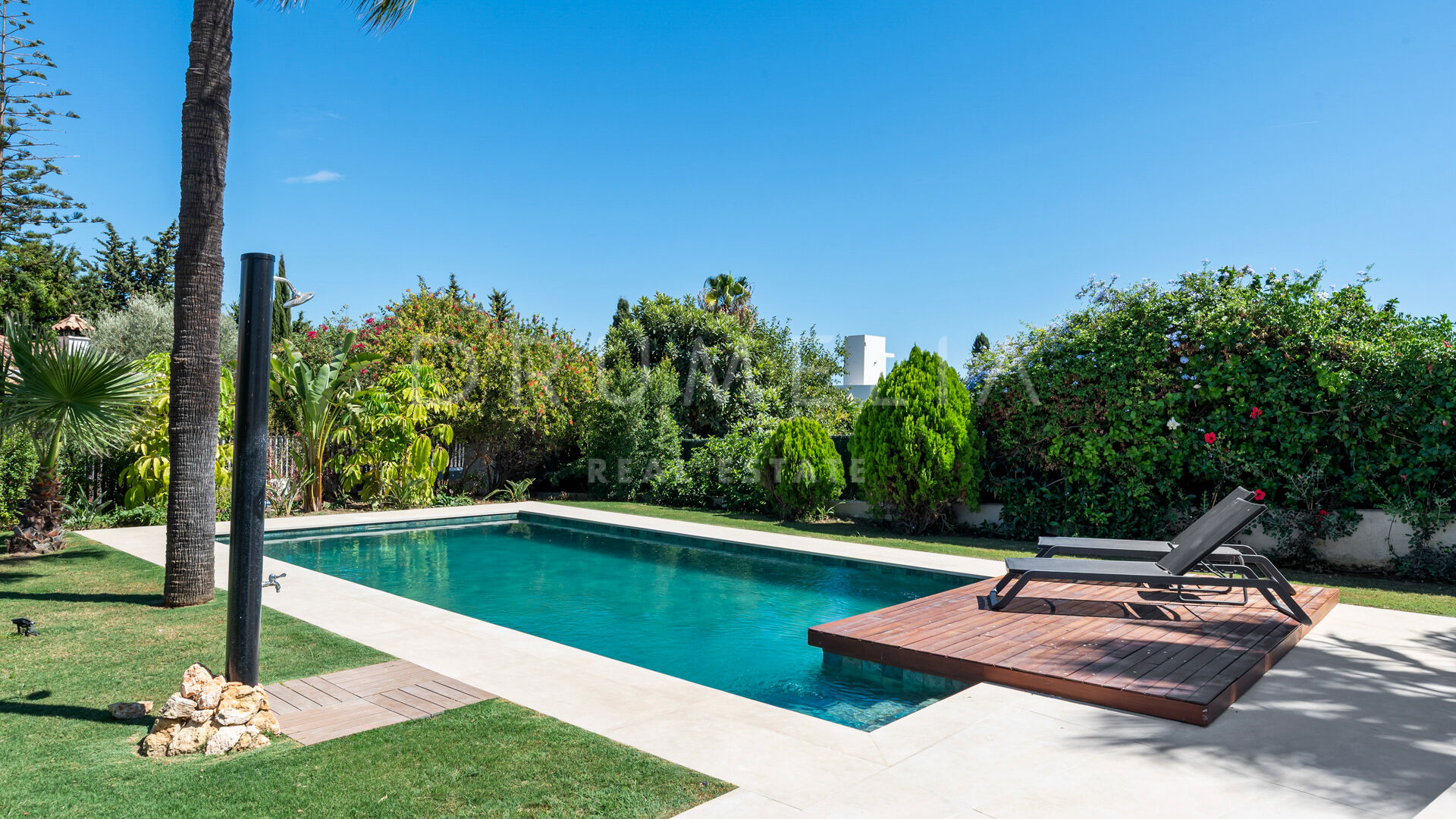 Esta elegante villa completamente amueblada en Guadalmina, San Pedro de Alcántara, combina a la perfección el estilo mediterráneo con un diseño contemporáneo. Situada a pocos pasos del prestigioso Club de Golf Guadalmina y a minutos de la playa, ofrece un entorno ideal tanto para residencia familiar como para segunda vivienda o inversión de lujo. Su localización garantiza tranquilidad, privacidad y acceso rápido a todos los servicios y atractivos de la Costa del Sol.
