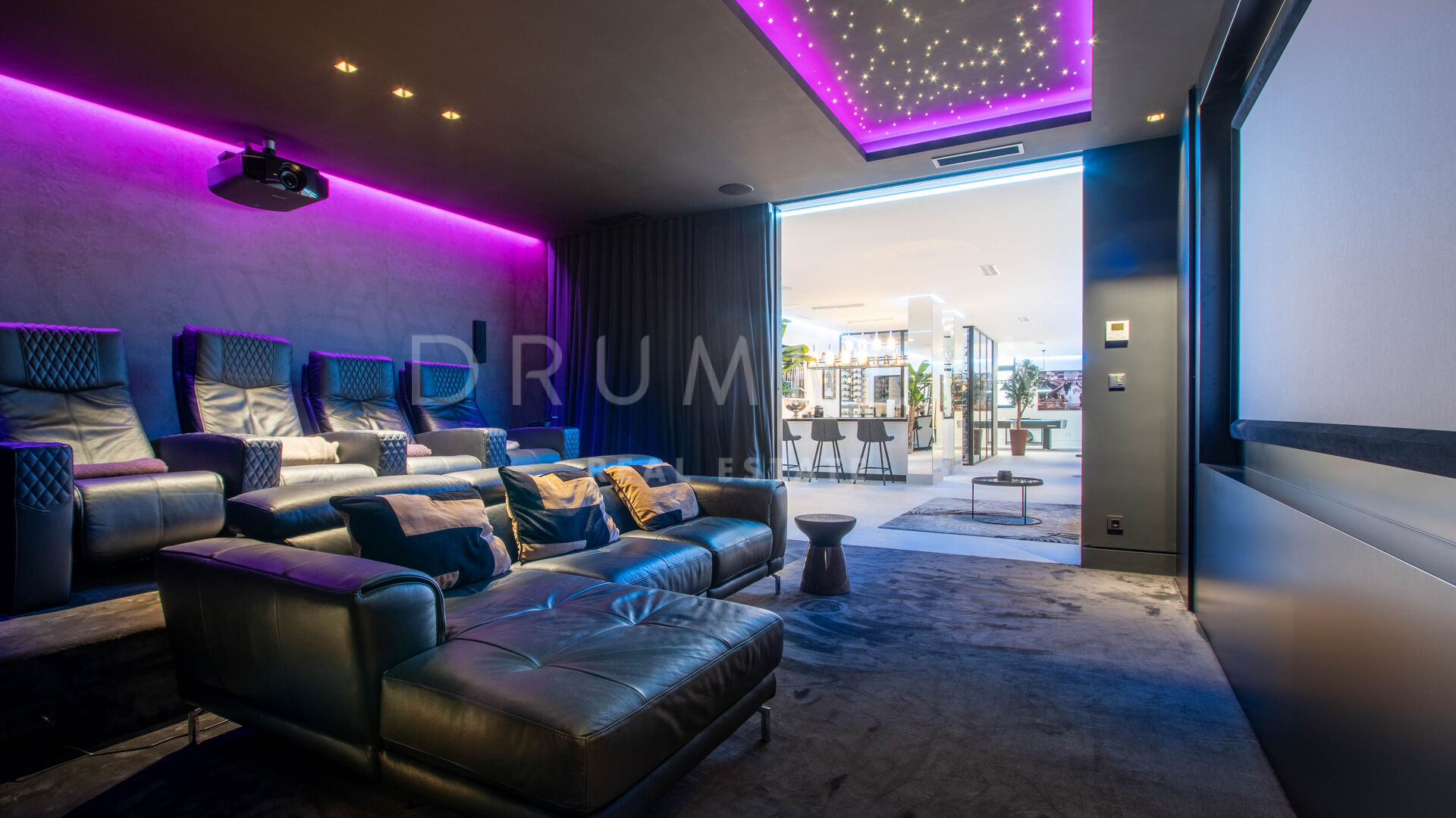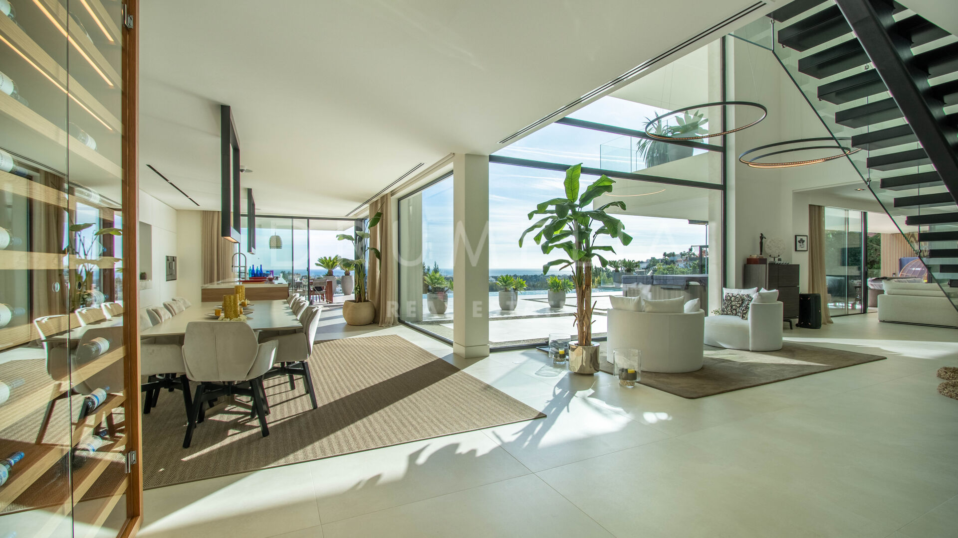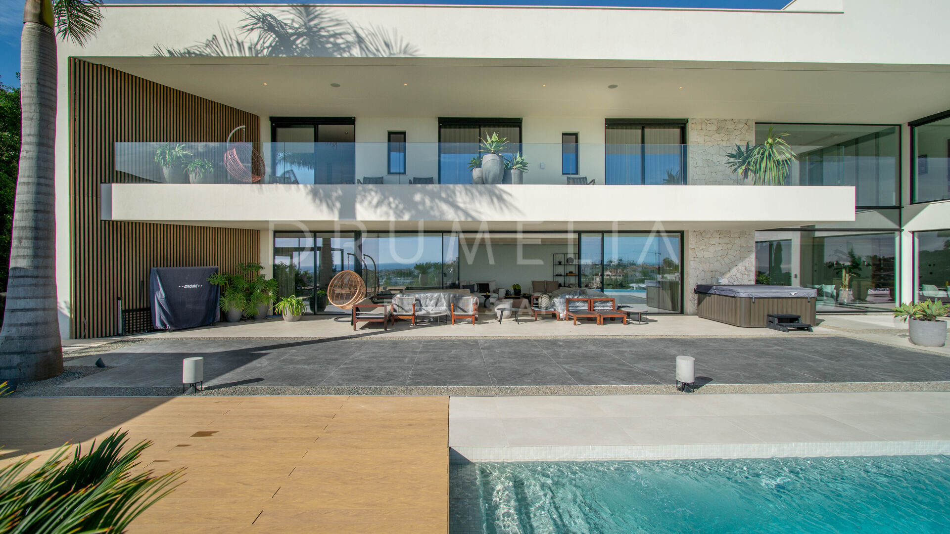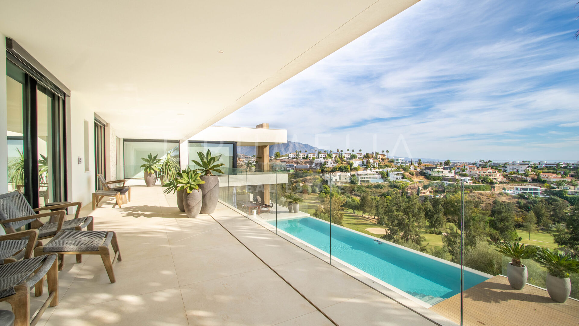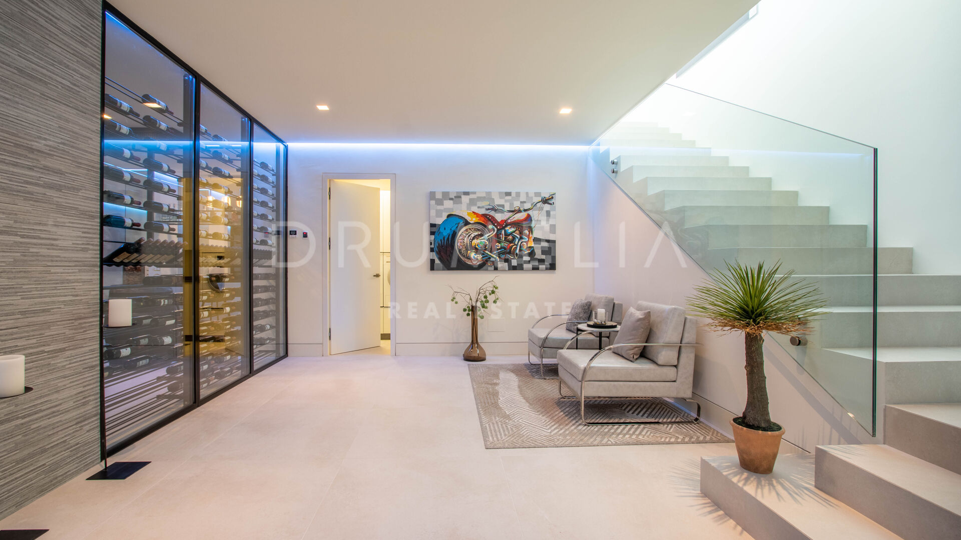 Ubicada en una parcela de 1.427 m², la espectacular casa de 616 m² consta de 3 plantas, accesibles por ascensor o escaleras flotantes, y tiene un hermoso y espacioso hall de entrada de doble altura. El concepto de planta abierta une zonas de estar y comedor y una cocina de estilo minimalista totalmente equipada con una enorme isla y electrodomésticos de primera calidad. Las grandes ventanas correderas integradas en la pared conectan los espacios interiores y exteriores. La propiedad tiene amplias terrazas cubiertas y descubiertas con impresionantes vistas al mar, la montaña y el golf, una increíble piscina infinita, jacuzzi, cocina exterior y barbacoa. La terraza principal se ha transformado totalmente con azulejos nuevos y luces LED que se pueden cambiar a cualquier color. 5 dormitorios y 6 cuartos de baño han sido completamente diseñados con materiales de alta calidad y equipados con las últimas tecnologías. El gran sótano está totalmente equipado, con zona de juegos, bodega, bar, sala de estar, SPA, sauna, baño turco, gimnasio, lavadero y sala de cine. Hay un garaje privado.