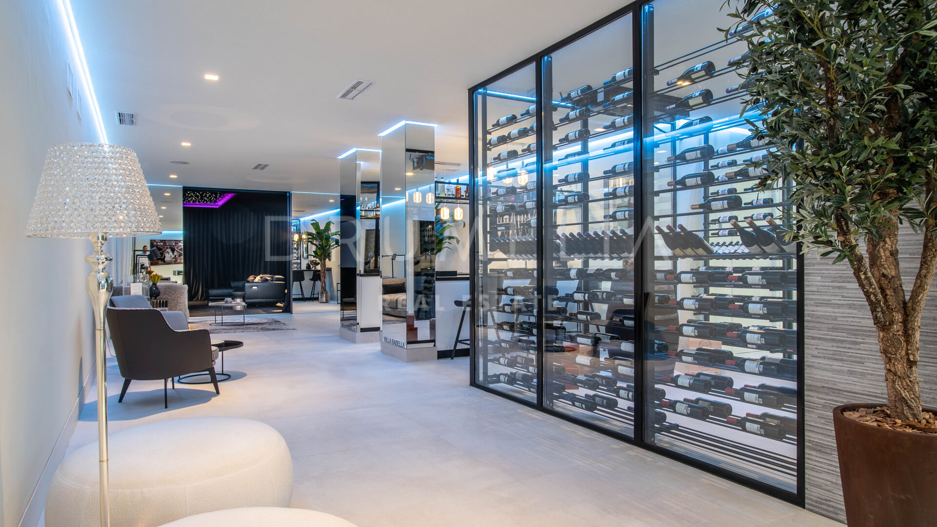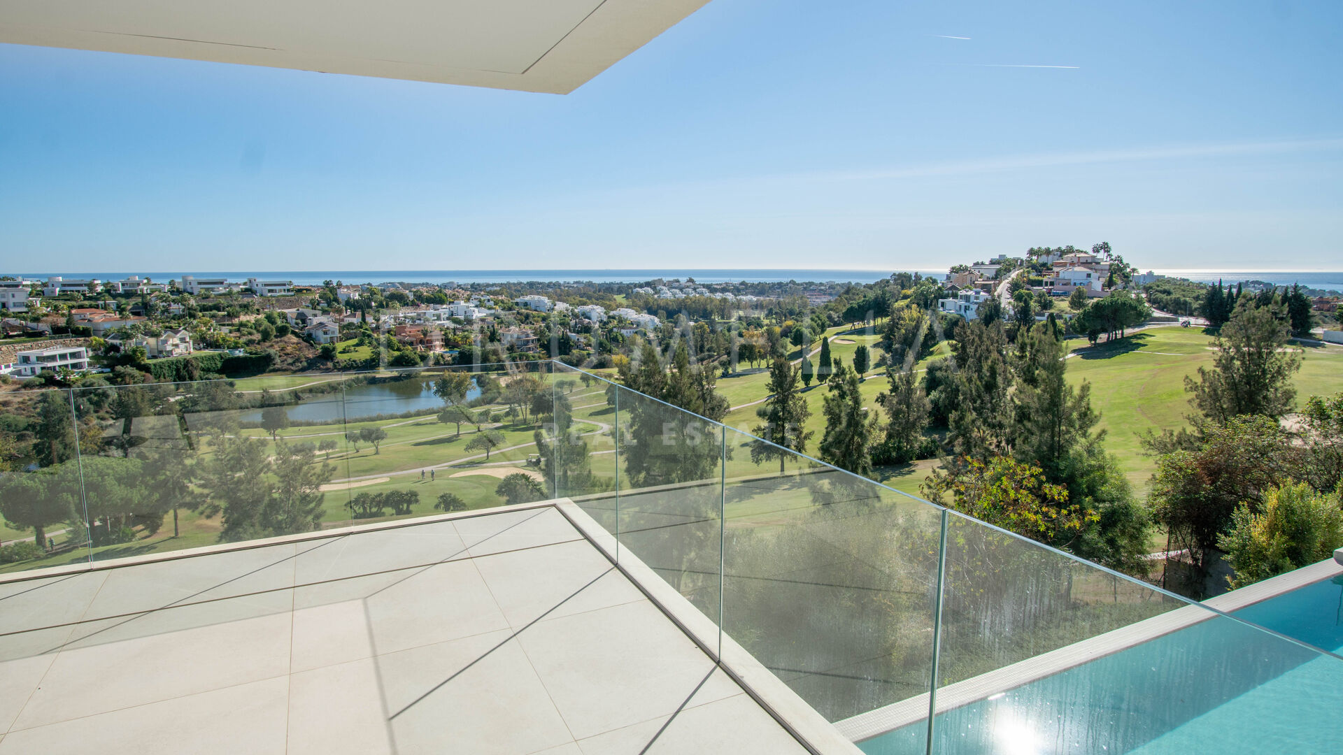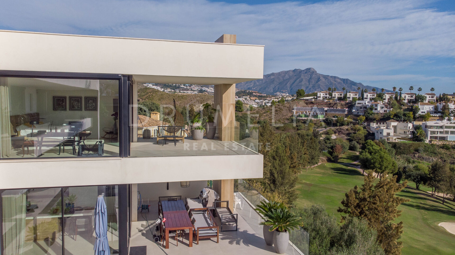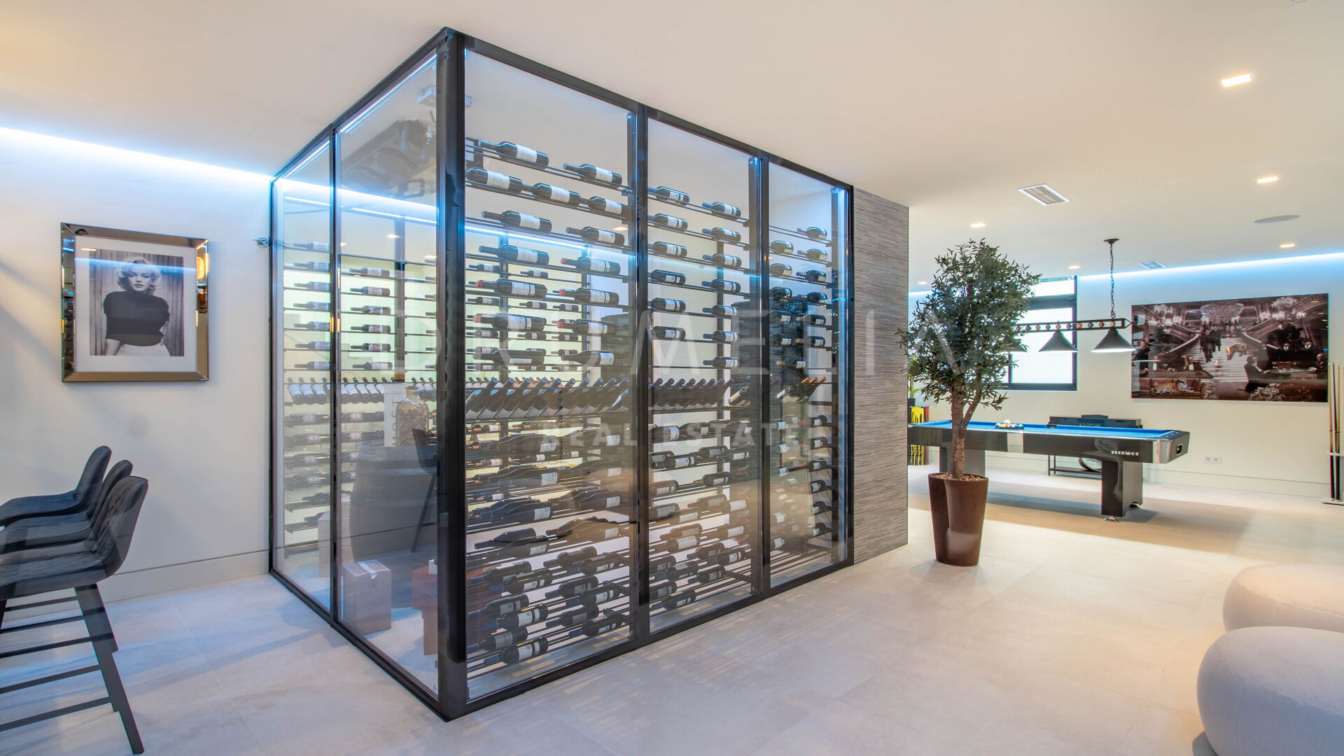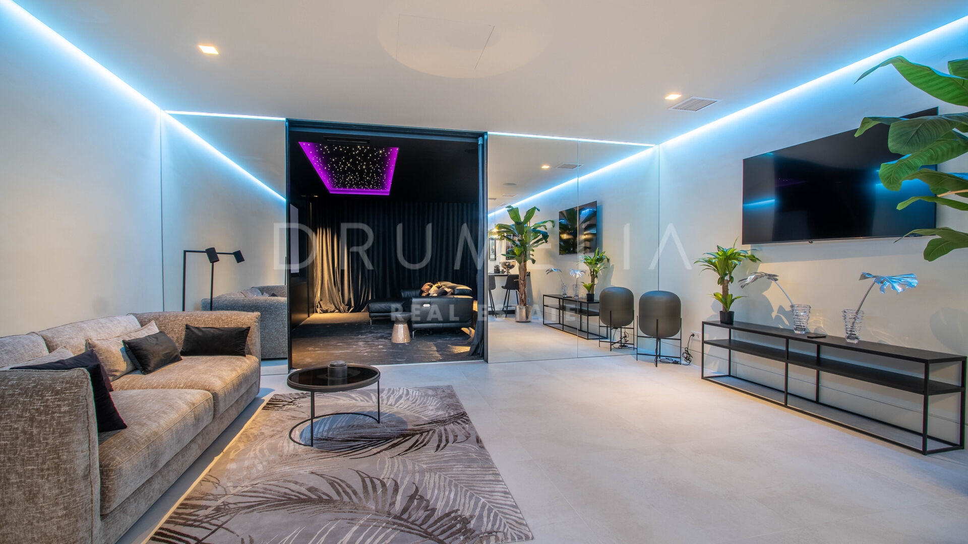 Ubicada en una parcela de 1.427 m², la espectacular casa de 616 m² consta de 3 plantas, accesibles por ascensor o escaleras flotantes, y tiene un hermoso y espacioso hall de entrada de doble altura. El concepto de planta abierta une zonas de estar y comedor y una cocina de estilo minimalista totalmente equipada con una enorme isla y electrodomésticos de primera calidad. Las grandes ventanas correderas integradas en la pared conectan los espacios interiores y exteriores. La propiedad tiene amplias terrazas cubiertas y descubiertas con impresionantes vistas al mar, la montaña y el golf, una increíble piscina infinita, jacuzzi, cocina exterior y barbacoa. La terraza principal se ha transformado totalmente con azulejos nuevos y luces LED que se pueden cambiar a cualquier color. 5 dormitorios y 6 cuartos de baño han sido completamente diseñados con materiales de alta calidad y equipados con las últimas tecnologías. El gran sótano está totalmente equipado, con zona de juegos, bodega, bar, sala de estar, SPA, sauna, baño turco, gimnasio, lavadero y sala de cine. Hay un garaje privado.