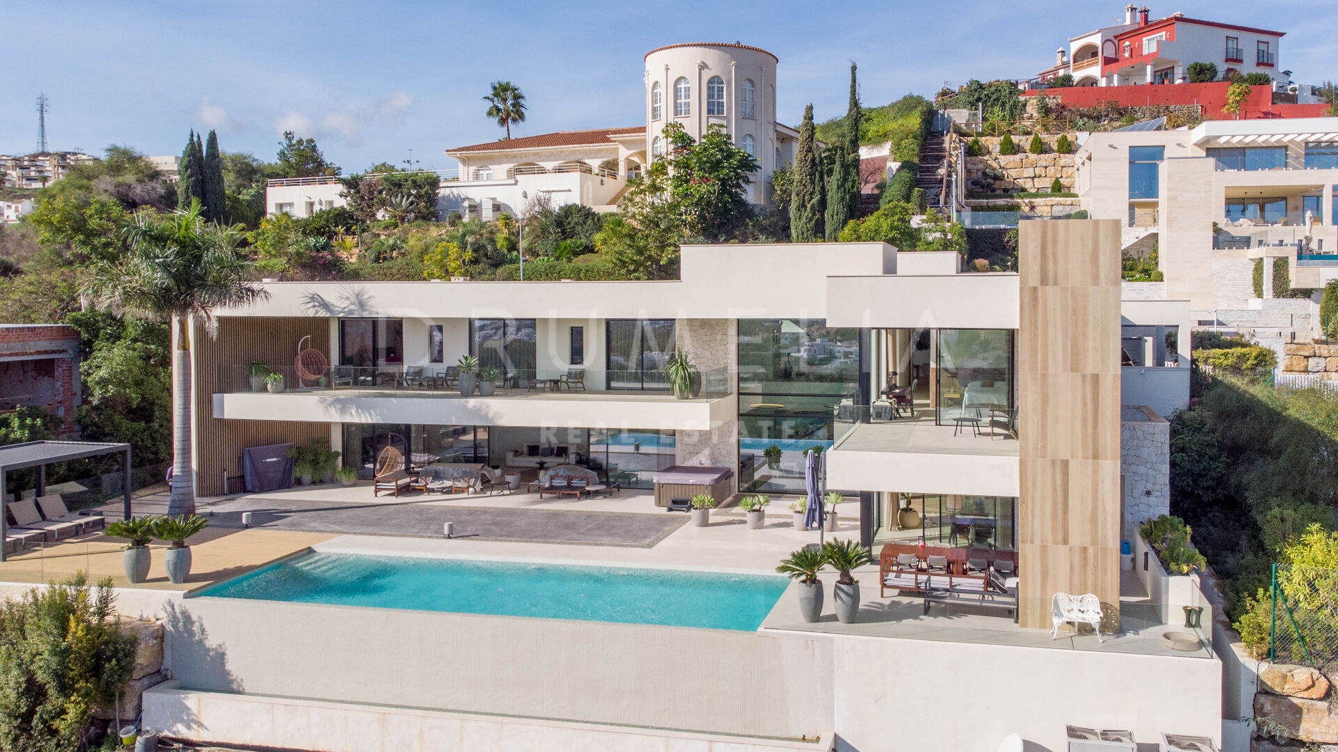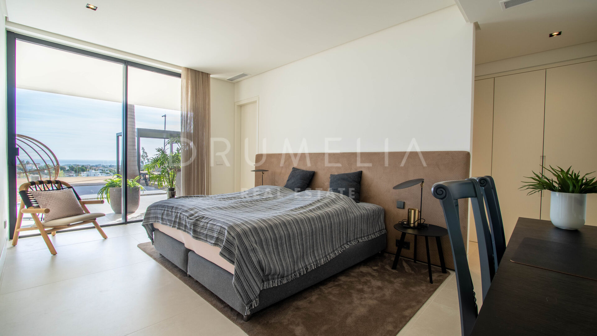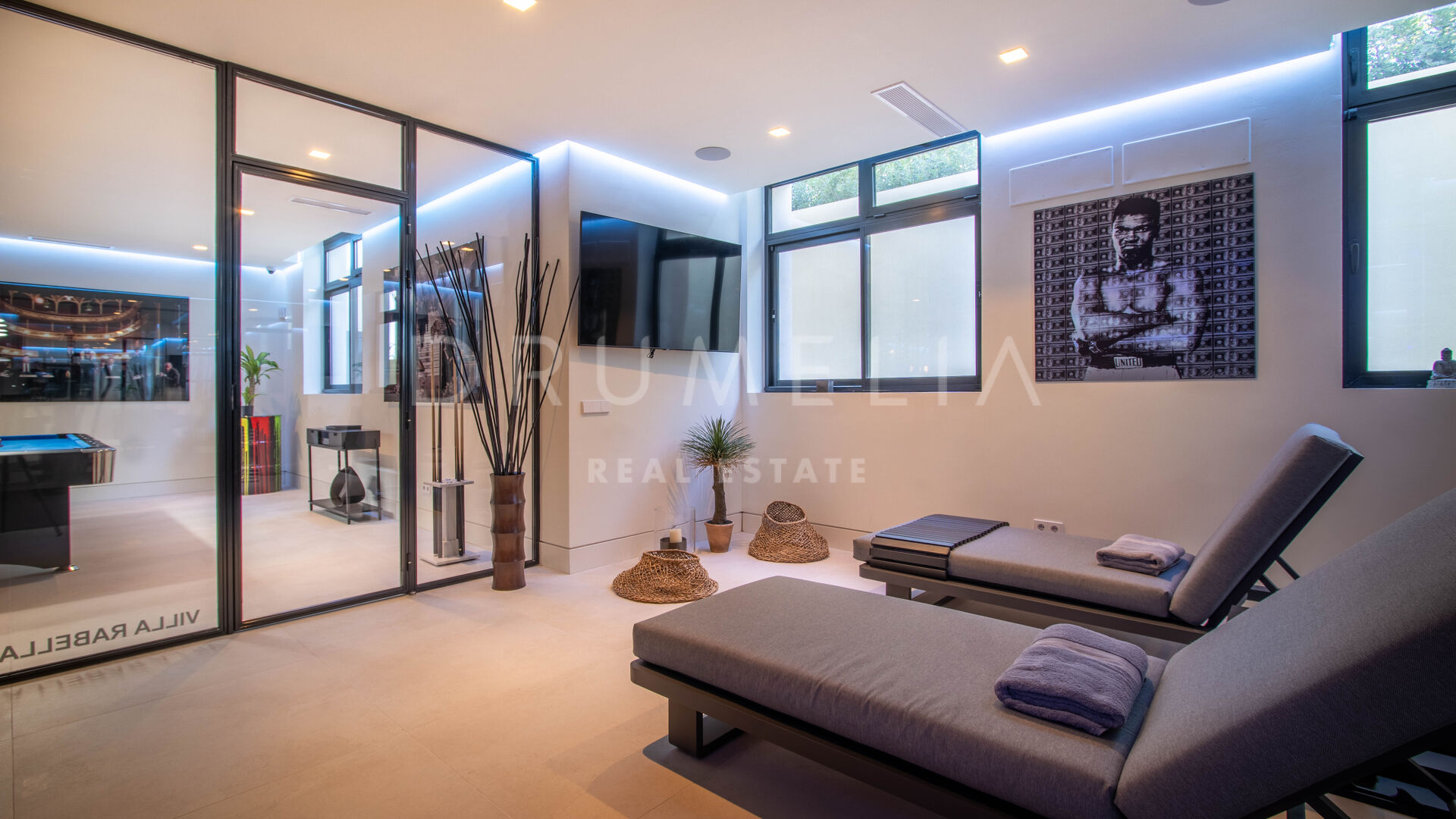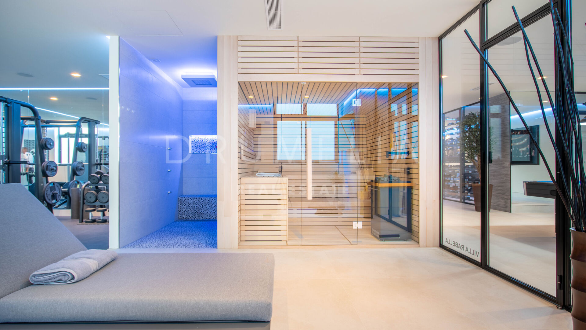Ubicada en una parcela de 1.427 m², la espectacular casa de 616 m² consta de 3 plantas, accesibles por ascensor o escaleras flotantes, y tiene un hermoso y espacioso hall de entrada de doble altura. El concepto de planta abierta une zonas de estar y comedor y una cocina de estilo minimalista totalmente equipada con una enorme isla y electrodomésticos de primera calidad. Las grandes ventanas correderas integradas en la pared conectan los espacios interiores y exteriores. La propiedad tiene amplias terrazas cubiertas y descubiertas con impresionantes vistas al mar, la montaña y el golf, una increíble piscina infinita, jacuzzi, cocina exterior y barbacoa. La terraza principal se ha transformado totalmente con azulejos nuevos y luces LED que se pueden cambiar a cualquier color. 5 dormitorios y 6 cuartos de baño han sido completamente diseñados con materiales de alta calidad y equipados con las últimas tecnologías. El gran sótano está totalmente equipado, con zona de juegos, bodega, bar, sala de estar, SPA, sauna, baño turco, gimnasio, lavadero y sala de cine. Hay un garaje privado.