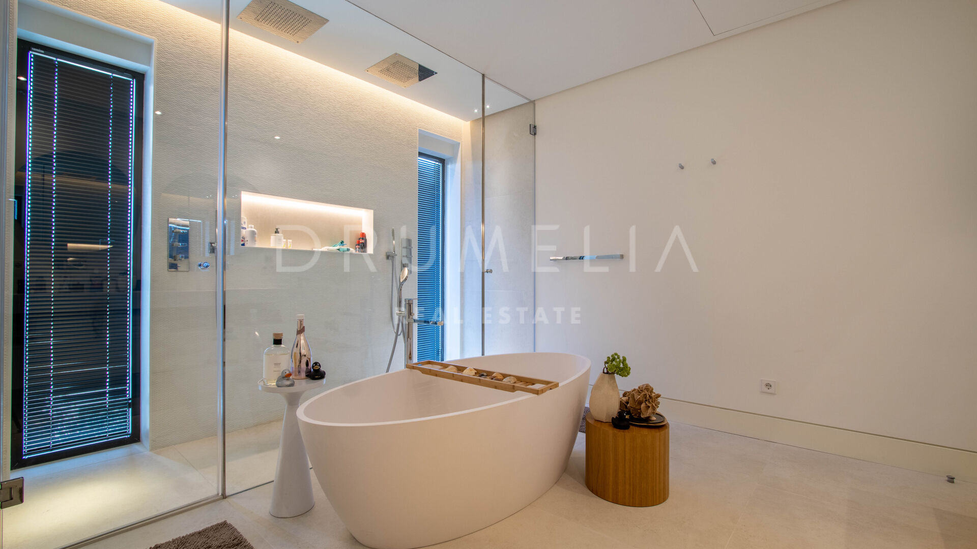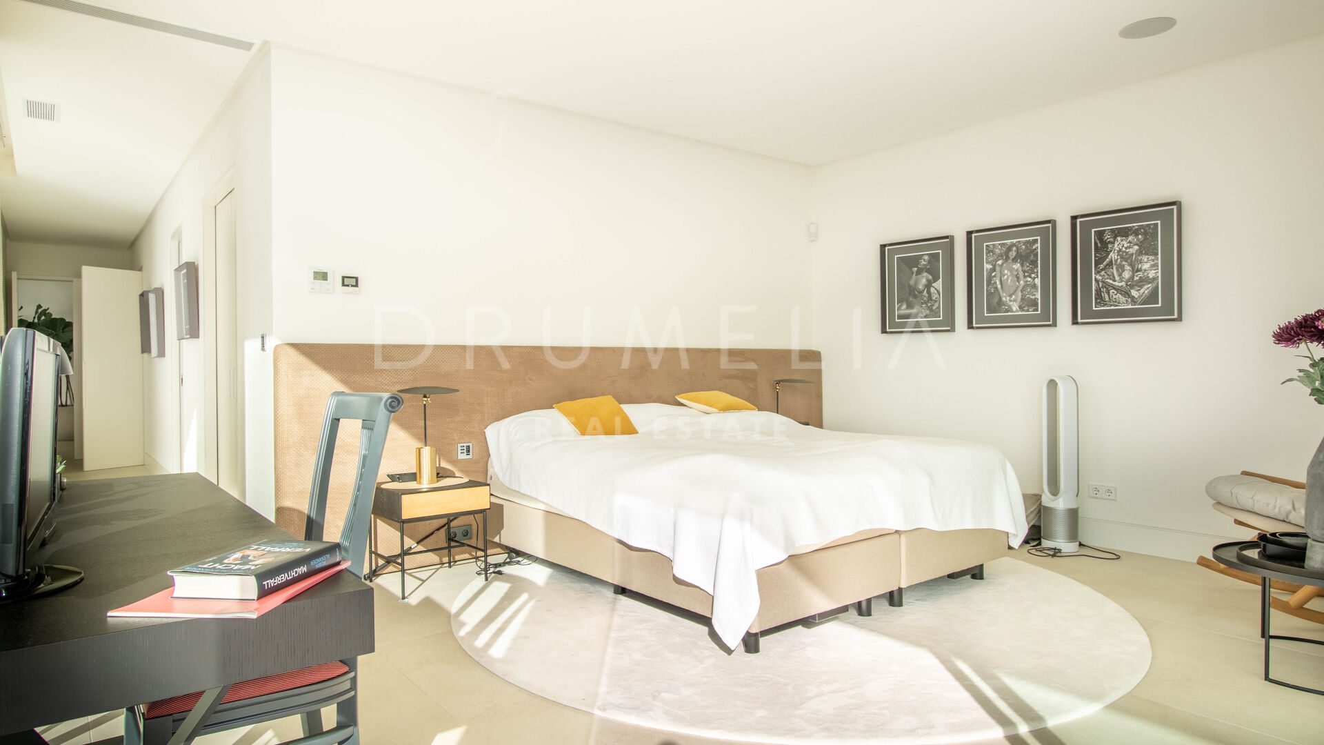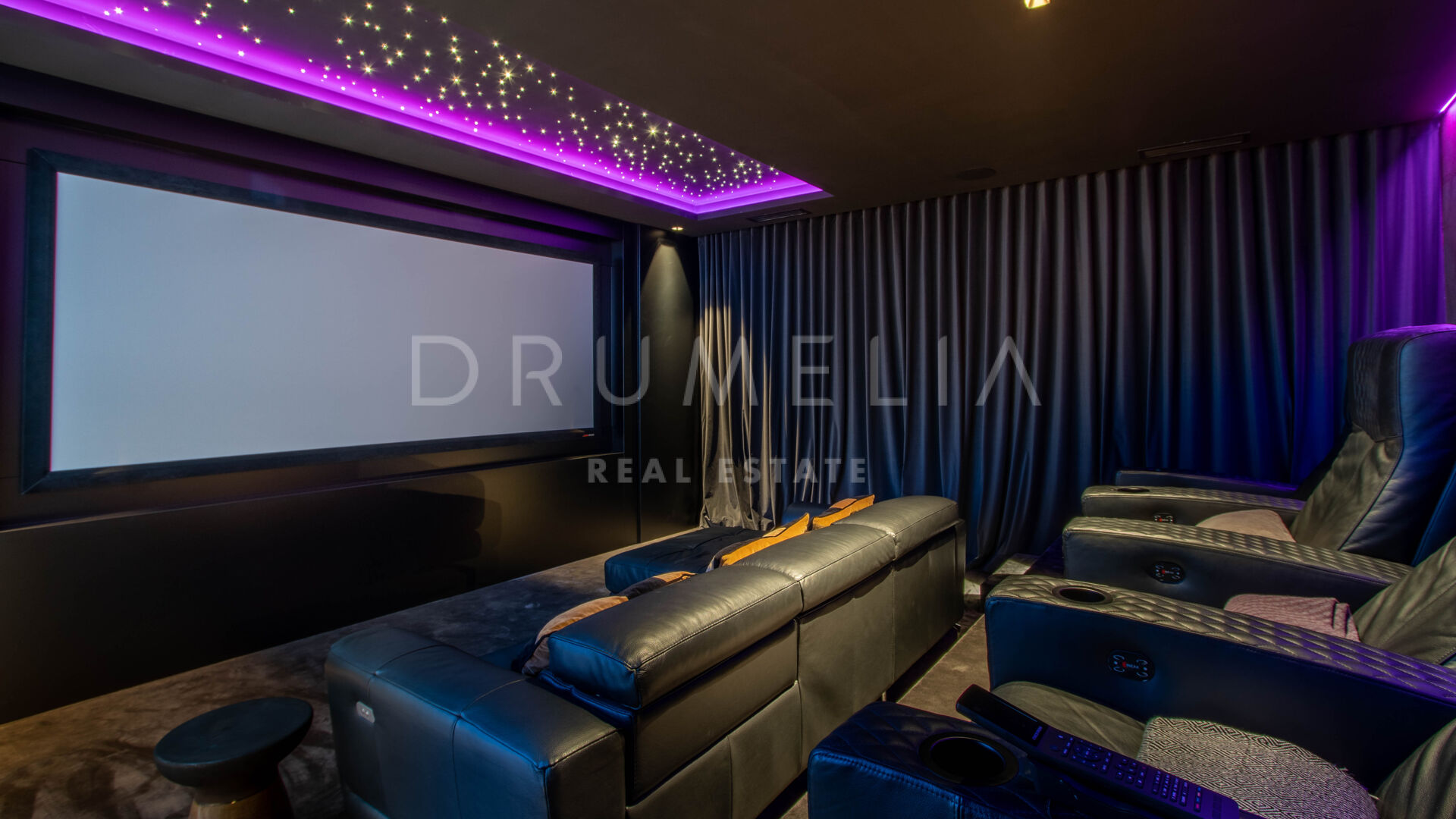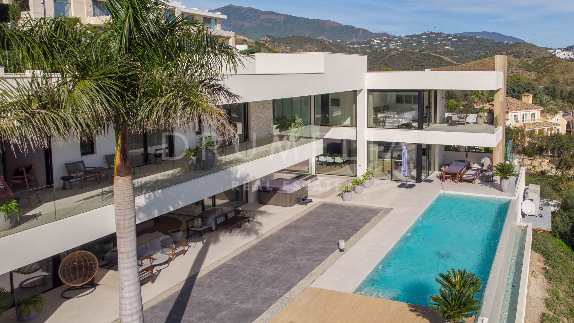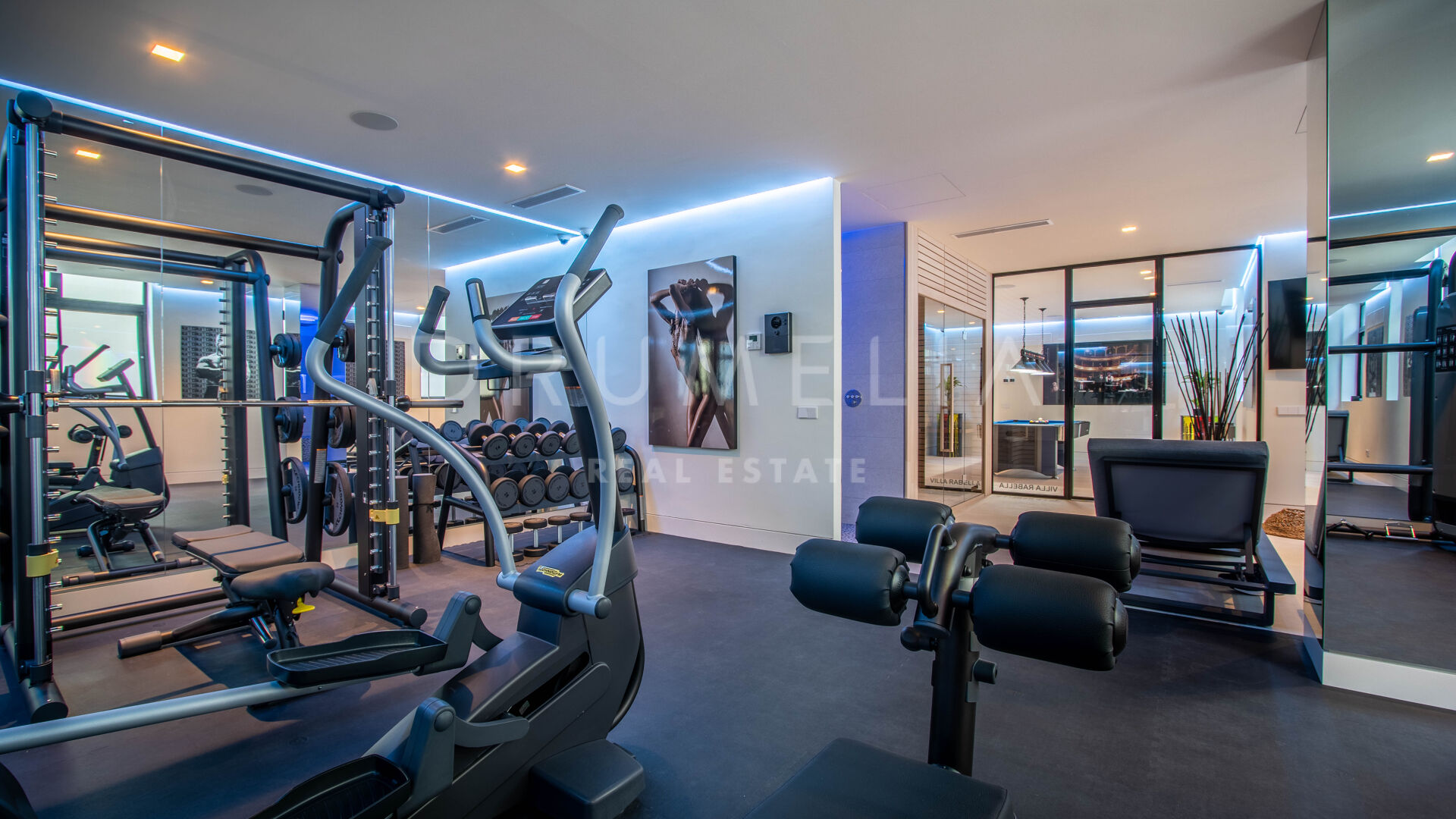 Ubicada en una parcela de 1.427 m², la espectacular casa de 616 m² consta de 3 plantas, accesibles por ascensor o escaleras flotantes, y tiene un hermoso y espacioso hall de entrada de doble altura. El concepto de planta abierta une zonas de estar y comedor y una cocina de estilo minimalista totalmente equipada con una enorme isla y electrodomésticos de primera calidad. Las grandes ventanas correderas integradas en la pared conectan los espacios interiores y exteriores. La propiedad tiene amplias terrazas cubiertas y descubiertas con impresionantes vistas al mar, la montaña y el golf, una increíble piscina infinita, jacuzzi, cocina exterior y barbacoa. La terraza principal se ha transformado totalmente con azulejos nuevos y luces LED que se pueden cambiar a cualquier color. 5 dormitorios y 6 cuartos de baño han sido completamente diseñados con materiales de alta calidad y equipados con las últimas tecnologías. El gran sótano está totalmente equipado, con zona de juegos, bodega, bar, sala de estar, SPA, sauna, baño turco, gimnasio, lavadero y sala de cine. Hay un garaje privado.