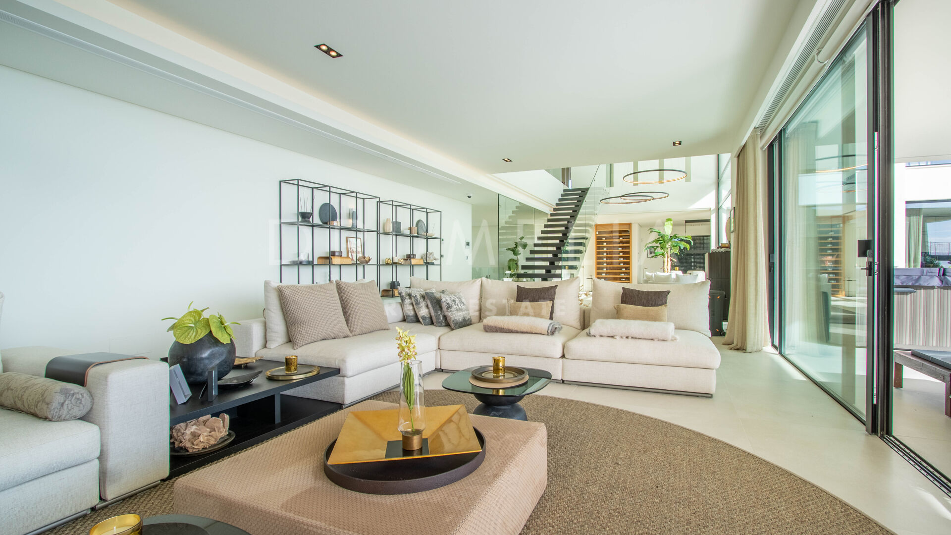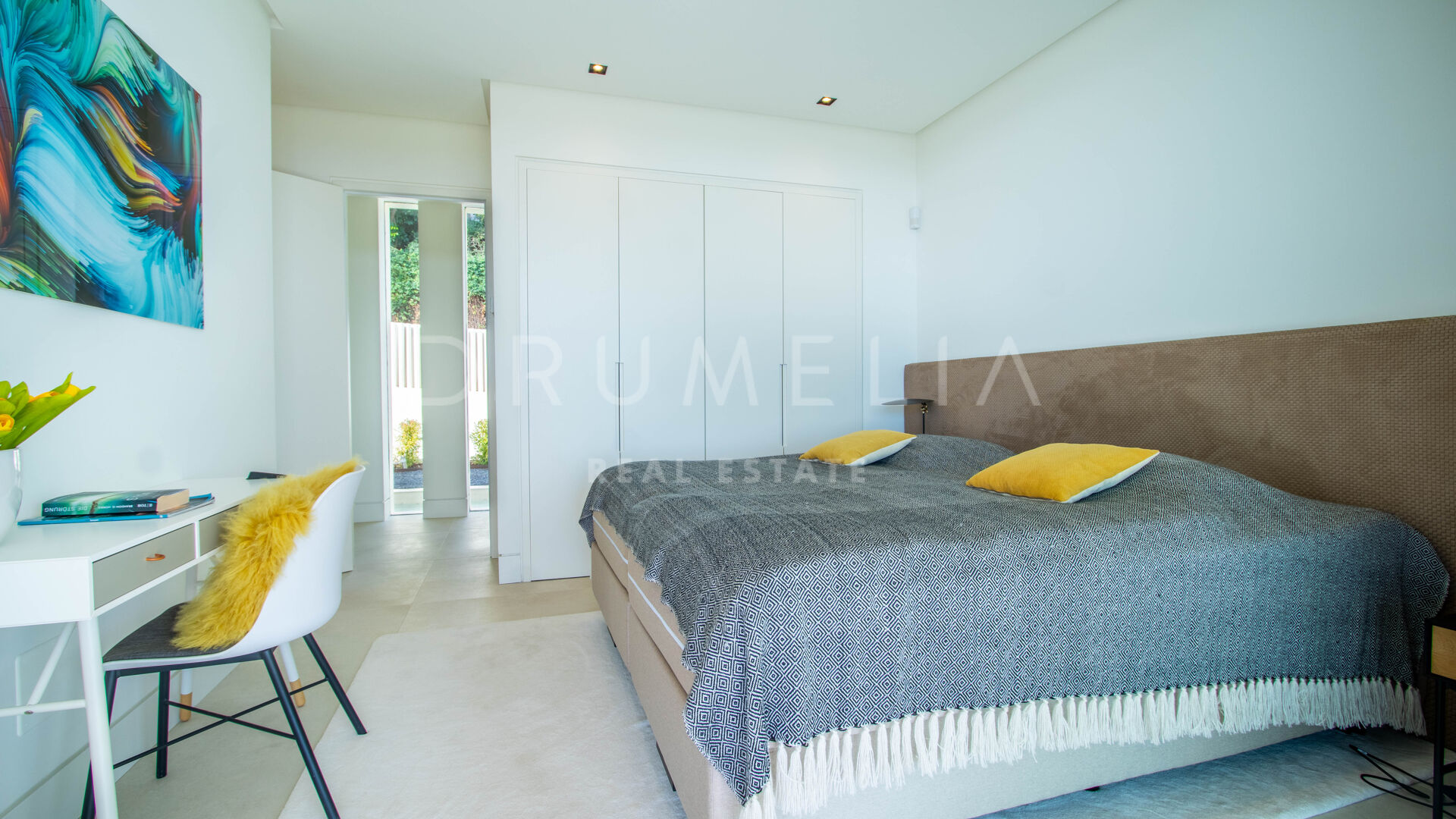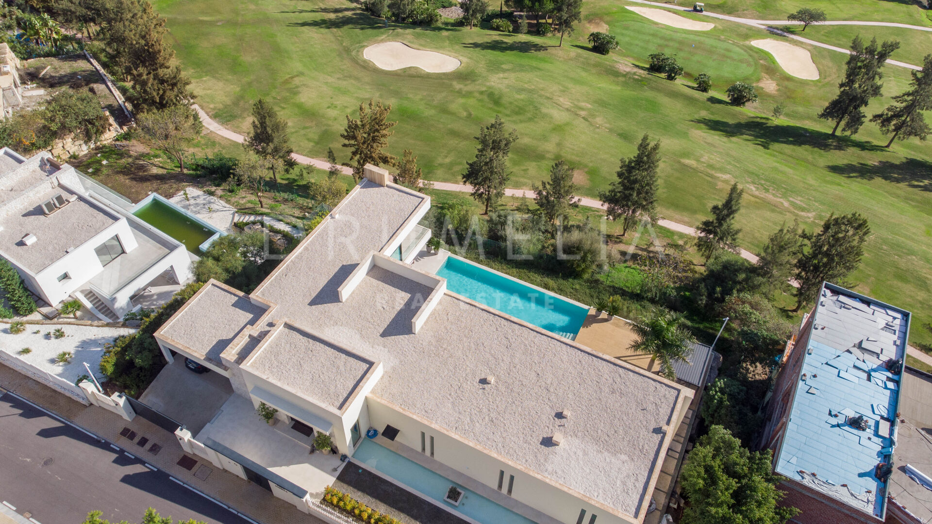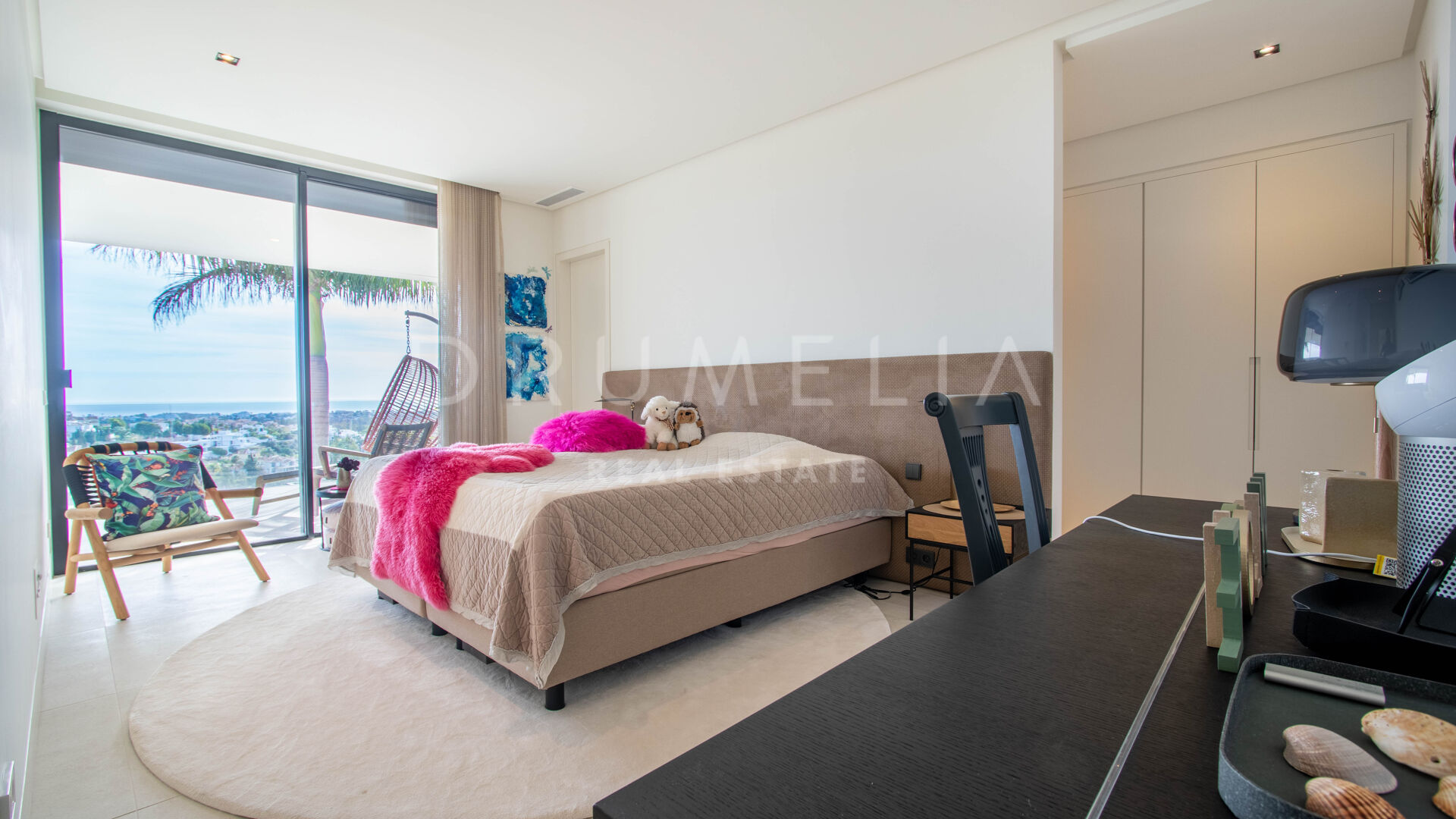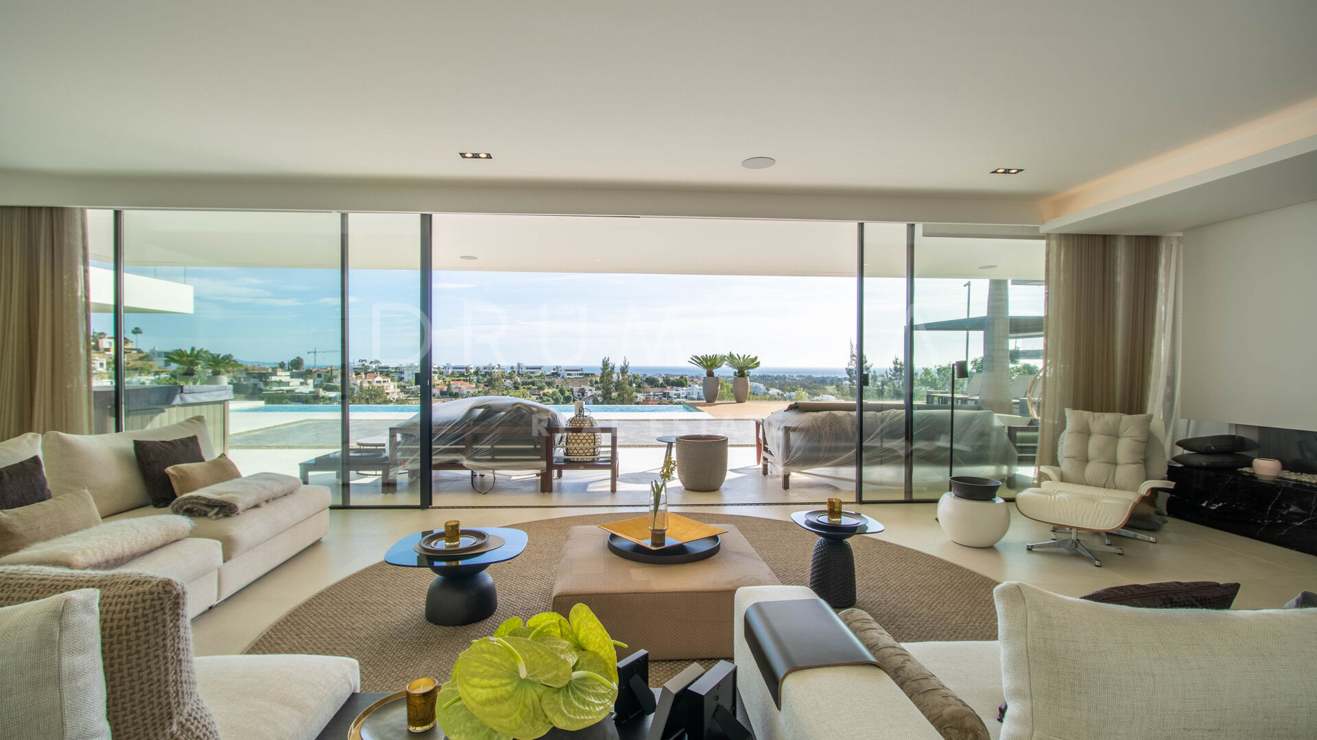 Ubicada en una parcela de 1.427 m², la espectacular casa de 616 m² consta de 3 plantas, accesibles por ascensor o escaleras flotantes, y tiene un hermoso y espacioso hall de entrada de doble altura. El concepto de planta abierta une zonas de estar y comedor y una cocina de estilo minimalista totalmente equipada con una enorme isla y electrodomésticos de primera calidad. Las grandes ventanas correderas integradas en la pared conectan los espacios interiores y exteriores. La propiedad tiene amplias terrazas cubiertas y descubiertas con impresionantes vistas al mar, la montaña y el golf, una increíble piscina infinita, jacuzzi, cocina exterior y barbacoa. La terraza principal se ha transformado totalmente con azulejos nuevos y luces LED que se pueden cambiar a cualquier color. 5 dormitorios y 6 cuartos de baño han sido completamente diseñados con materiales de alta calidad y equipados con las últimas tecnologías. El gran sótano está totalmente equipado, con zona de juegos, bodega, bar, sala de estar, SPA, sauna, baño turco, gimnasio, lavadero y sala de cine. Hay un garaje privado.