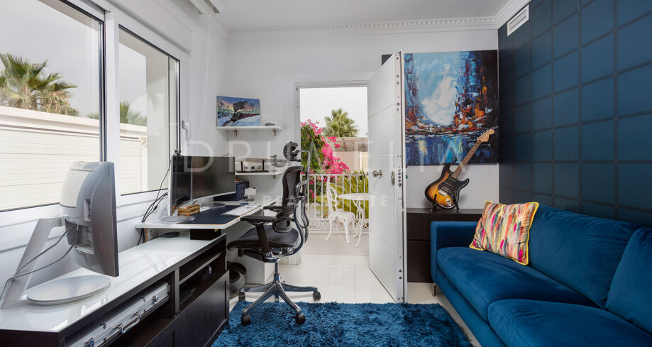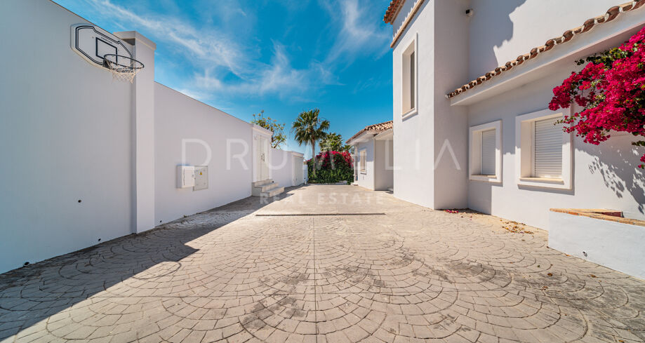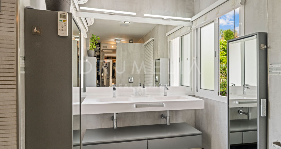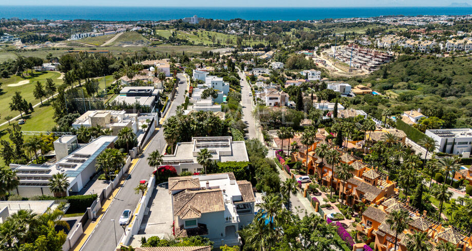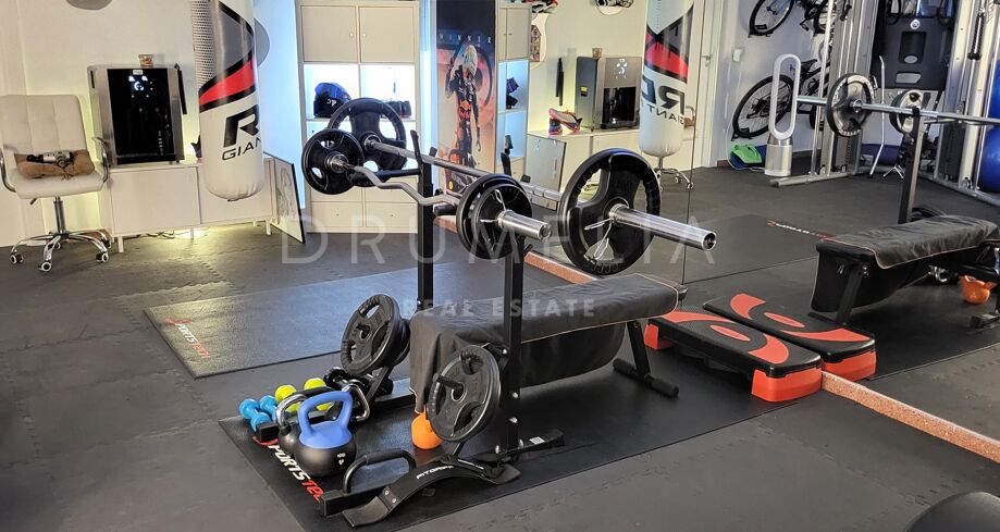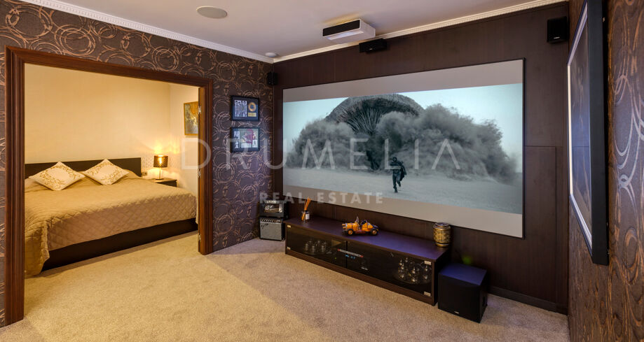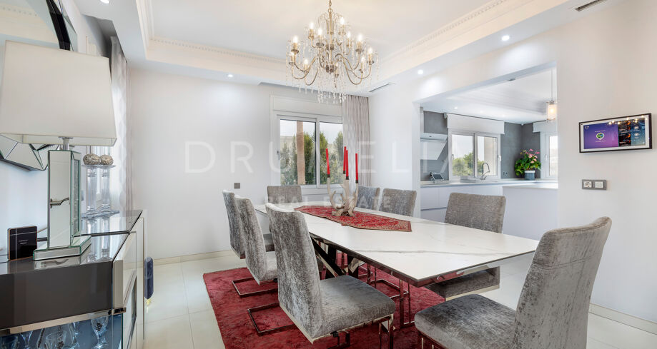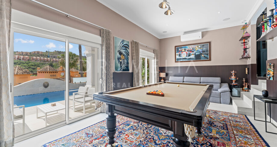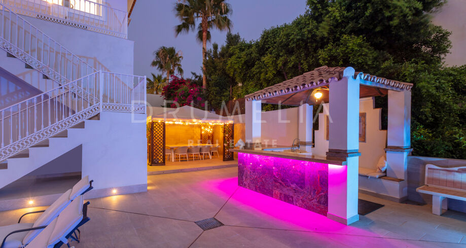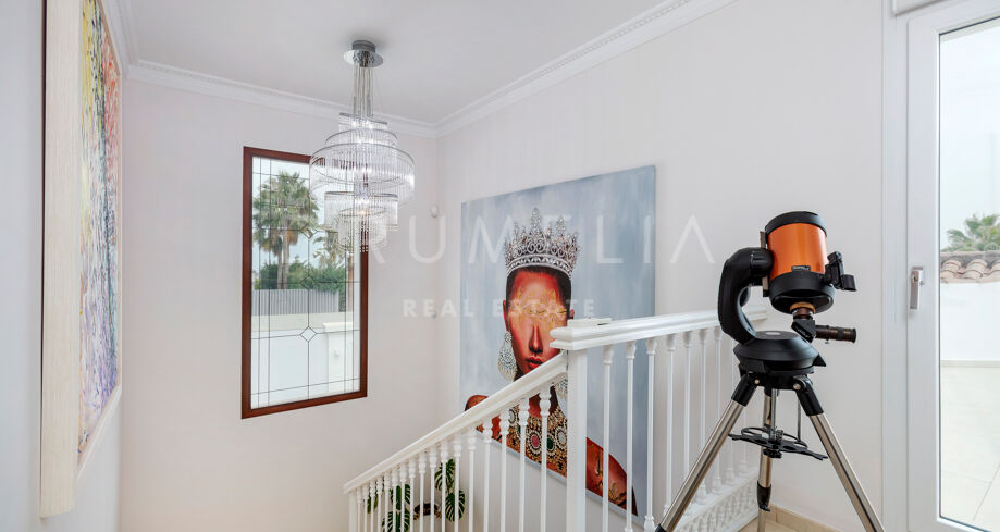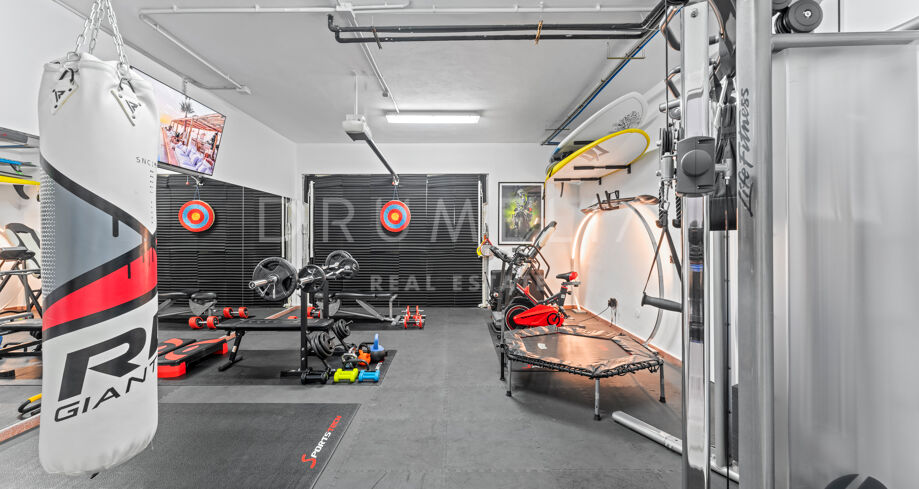 La planta baja está pensada para disfrutar y relajarse. Cuenta con una sala de cine con sonido de alta calidad, sala de juegos, gimnasio, una segunda cocina, una suite para invitados y salida directa a la piscina, la zona de barbacoa y el espacio chill-out. El jardín, que combina zonas abiertas con árboles frutales, aporta un toque natural muy especial. Con calefacción por suelo radiante, tecnología domótica y un sistema de seguridad de primer nivel, esta villa no solo es visualmente atractiva, sino que también es muy cómoda para el día a día. Una propiedad poco común en una de las zonas más valoradas de la costa.
