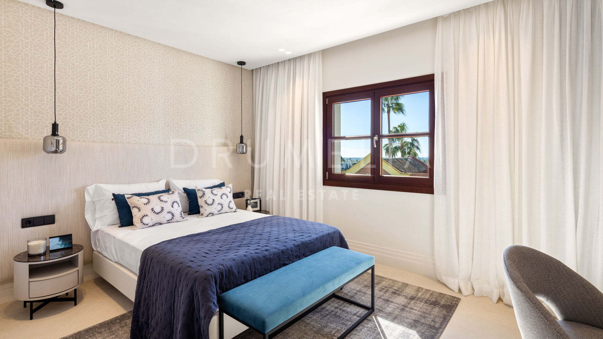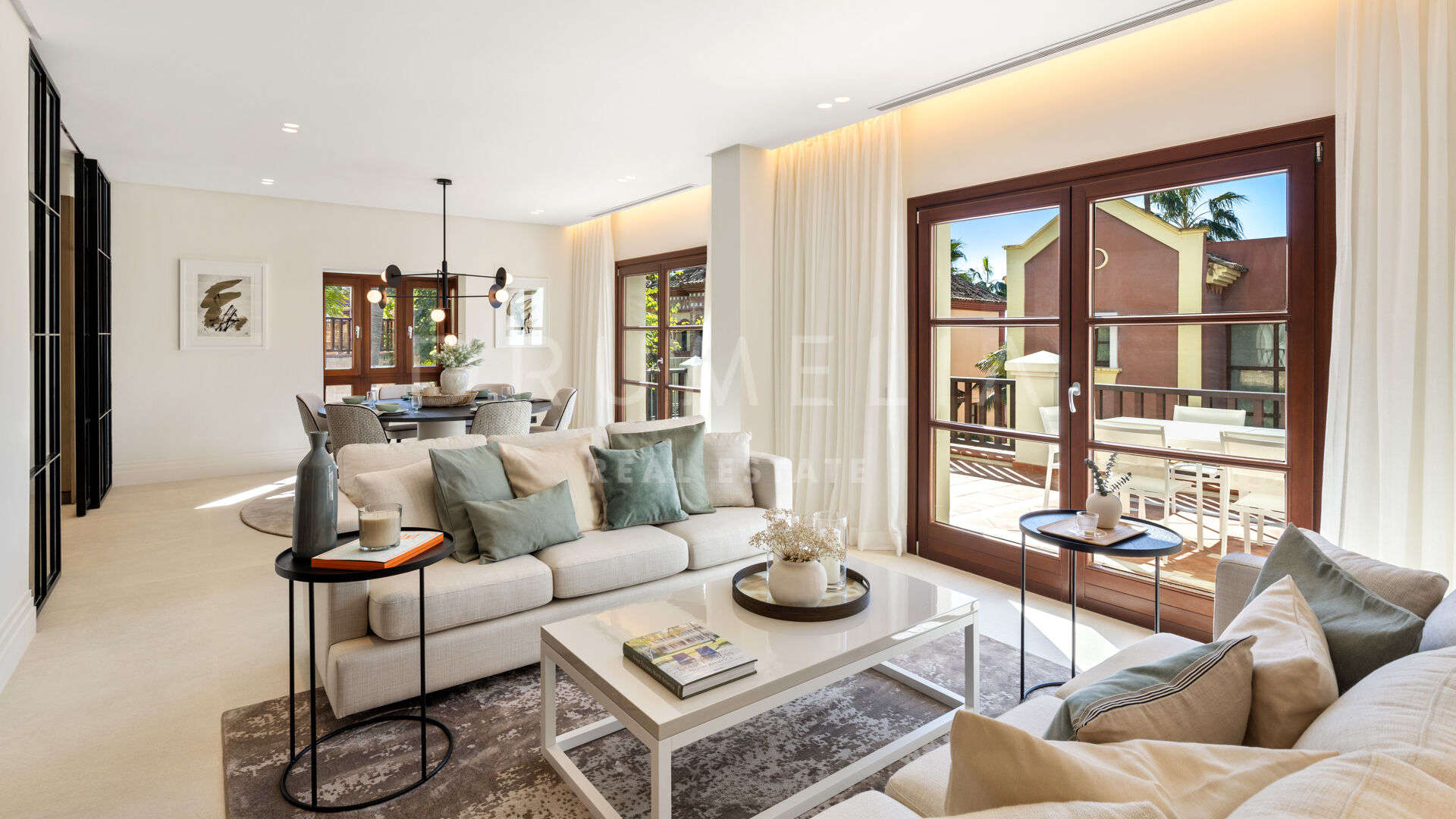 El interior de esta casa adosada irradia sofisticación y confort modernos, ya que ha sido completamente renovado con mobiliario contemporáneo, elegantes combinaciones de colores y detalles de mármol y madera de buen gusto. El salón de planta abierta conecta a la perfección el íntimo comedor con las salas de estar formales e informales, y se extiende hasta las terrazas para ofrecer un estilo de vida interior-exterior. La cocina ultramoderna, separada por elegantes puertas de cristal, incluye una impresionante isla de mármol, armarios de madera y electrodomésticos de última generación.