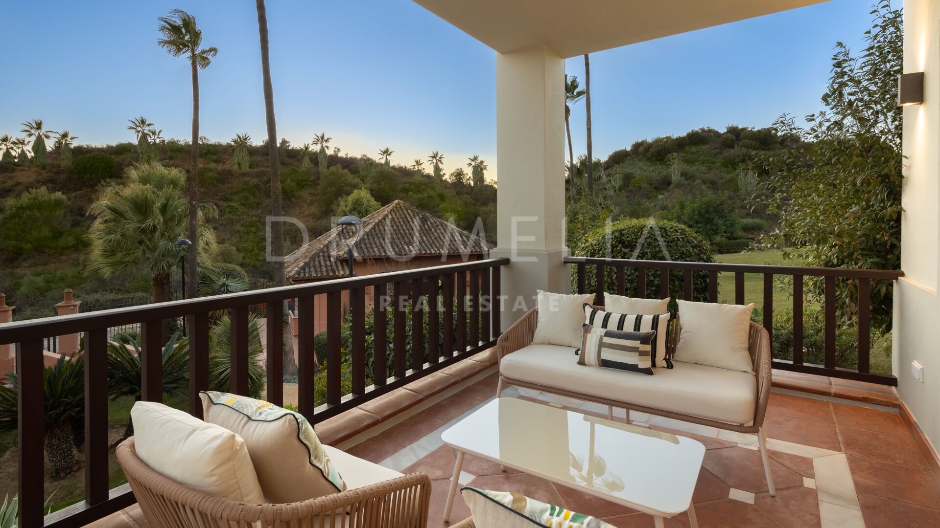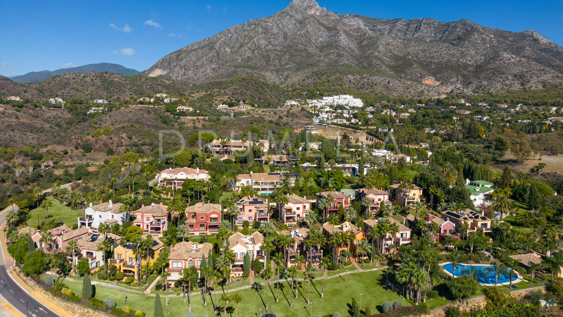 En venta en La Capellanía, Sierra Blanca, en una exclusiva urbanización de la Milla de Oro de Marbella, se encuentra esta casa adosada mediterránea de 5 dormitorios y 5 baños. Con una generosa superficie construida de 654 m² en una parcela de 624 m² y 79 m² de terraza, esta propiedad personifica el encanto de las villas mediterráneas tradicionales. Sus emblemáticas paredes blancas y las clásicas tejas del tejado se complementan con amplias terrazas diseñadas para relajarse, comer al aire libre y acceder directamente a la planta baja.