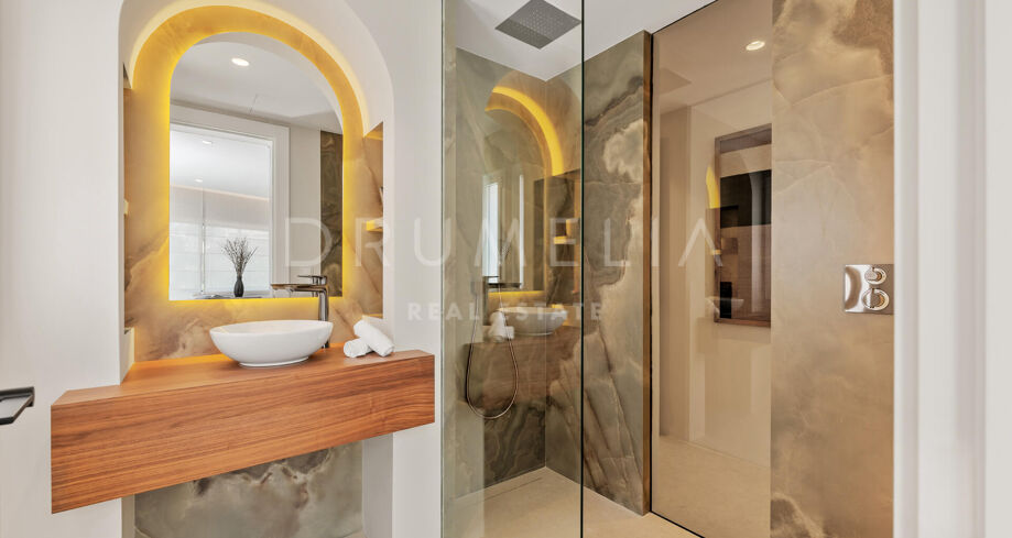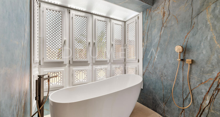 Este exclusivo ático dúplex en venta está situado justo en el centro de la urbanización de alta gama en primera línea de playa de La Morera Playa, Marbella Este. Se encuentra junto al mar en Los Monteros, junto a la playa de Los Monteros y a pocos pasos del conocido restaurante de playa Trocadero Arena. Diseñado por el legendario Melvin Villarroel, creador de algunos de los complejos de lujo más emblemáticos de Marbella, combina el encanto mediterráneo atemporal, la espectacular arquitectura andaluza y el auténtico lujo. Situada en una zona muy tranquila, con poco tráfico, esta lujosa comunidad cerrada cuenta con seguridad las 24 horas del día, preciosos jardines de 10.000 m², juegos de agua en cascada y una lista de lujos y servicios de primera clase, como gimnasio y spa privados, piscinas cubiertas y descubiertas, etc. Sus lujosos apartamentos y áticos cuentan con especificaciones de primera calidad y los mejores materiales nobles. Las vistas sobre el Mediterráneo son impresionantes, y desde este lugar, casi se puede ver la entrada al Océano Atlántico y los picos nevados de Sierra Nevada. La ubicación de esta comunidad es inmejorable y una de las mejores de Marbella, en primera línea de playa, con acceso directo a una playa de arena y muy cerca del golf (Río Real y Santa Clara están a pocos minutos), restaurantes y tiendas, colegios internacionales, instalaciones deportivas y recreativas. Le llevará unos minutos en coche al encantador puerto deportivo de Cabopino y al fabuloso Puerto Banús, a la lujosa Milla de Oro de Marbella y al Valle del Golf de Nueva Andalucía. El centro de Marbella está a menos de 5 minutos.