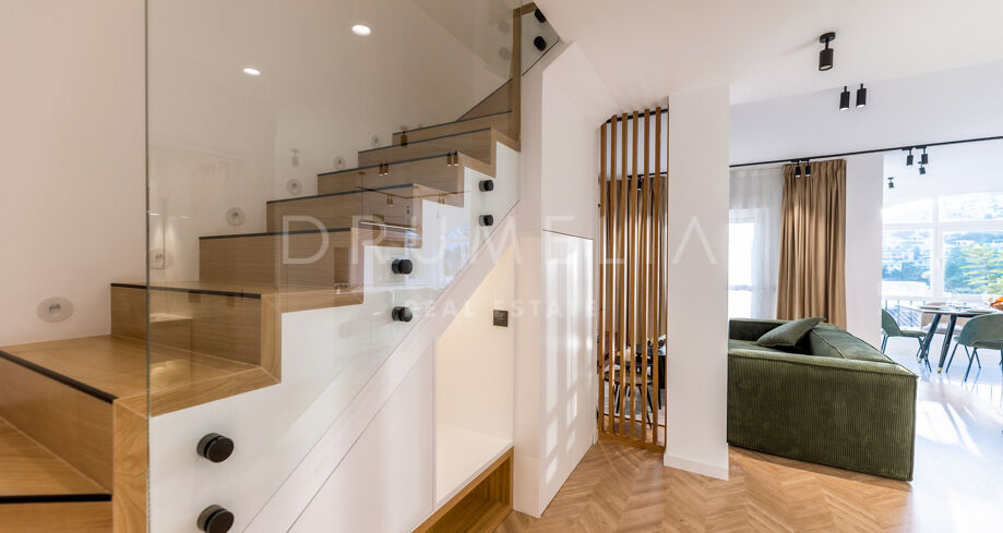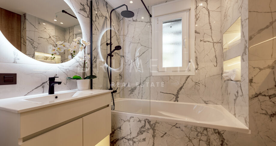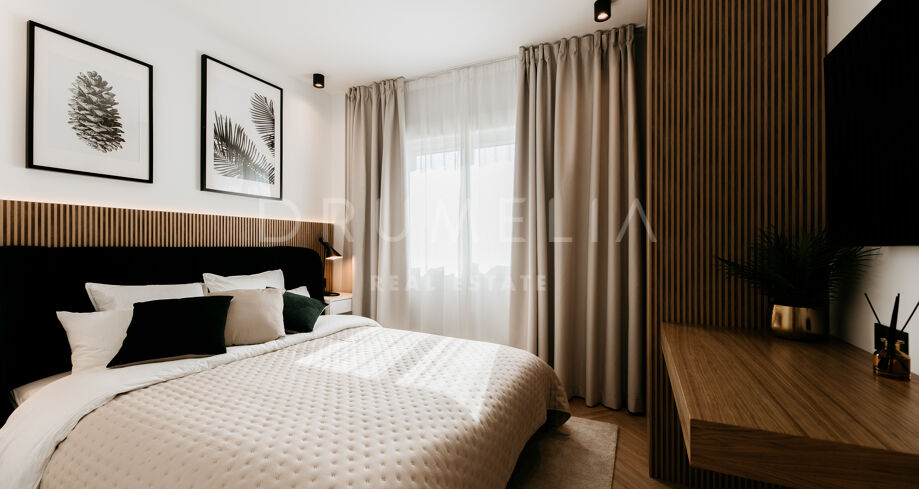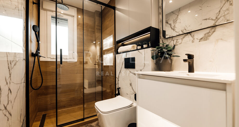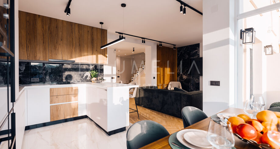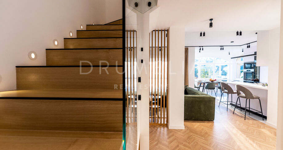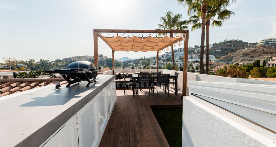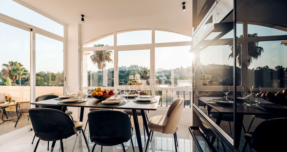 Rodeado de la hermosa naturaleza de Benahavís y propiedades similares, el apartamento de 160 m² con terraza de 43 m², 3 dormitorios (2 con baño propio) y 3 cuartos de baño ha sido totalmente reformado. Al entrar en este elegante apartmento, la planta baja le recibe con una cocina abierta de estilo minimalista totalmente equipada, conectada con zona de lavadero independiente y una zona de comedor, y un acogedor salón con sala de TV. Esta planta cuenta con un cuarto de baño convenientemente situado, un dormitorio y una suite de invitados con su propio cuarto de baño que proporciona a sus visitas un refugio privado que promete comodidad y elegancia. Junto a ella, la suite principal brilla en todo su esplendor con su propio cuarto de baño de lujo y armarios empotrados. Una hermosa escalera de madera conduce a la segunda planta. Allí le espera un magnífico solárium con amplias vistas al sereno campo de golf y al mar azul.