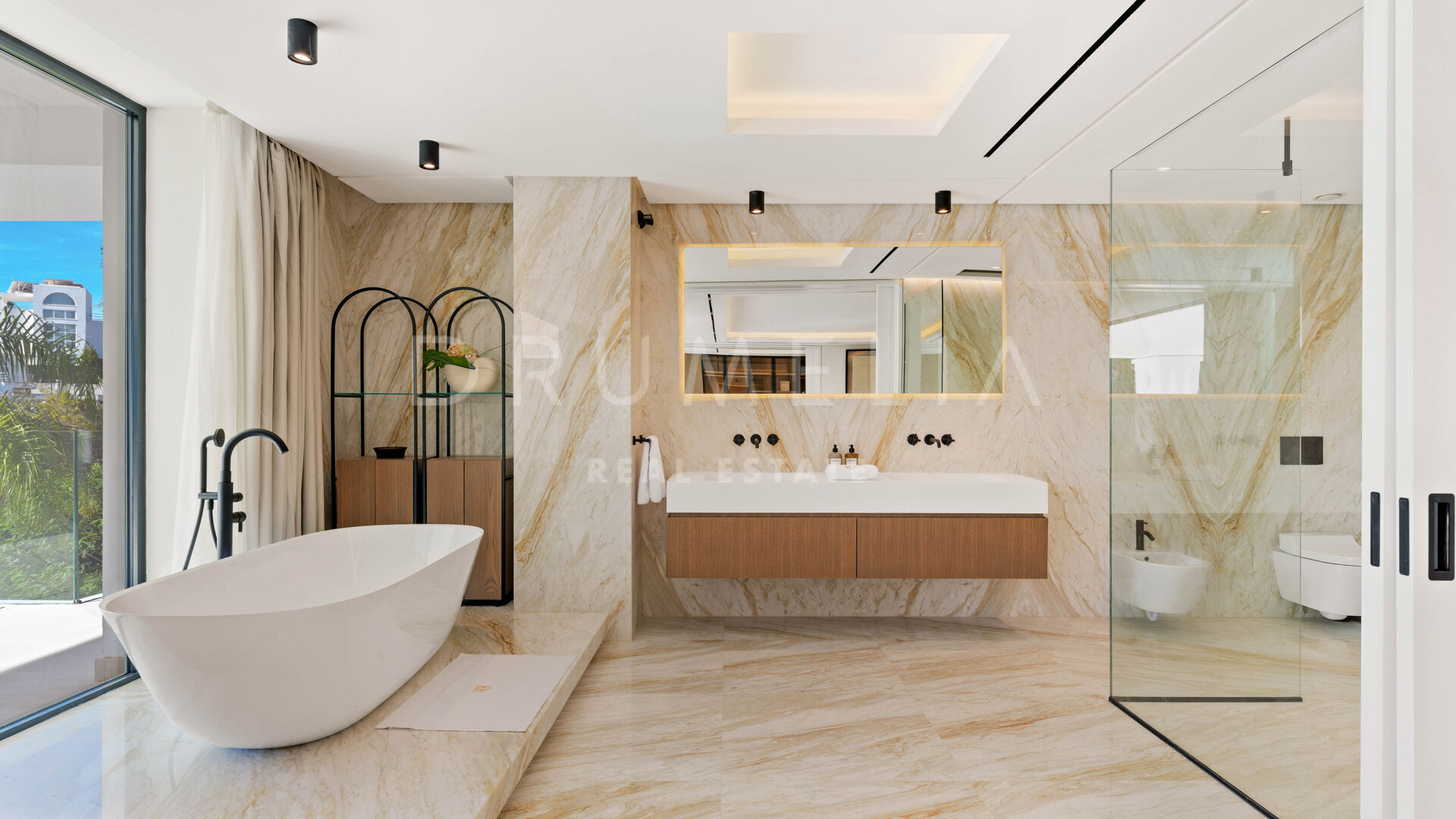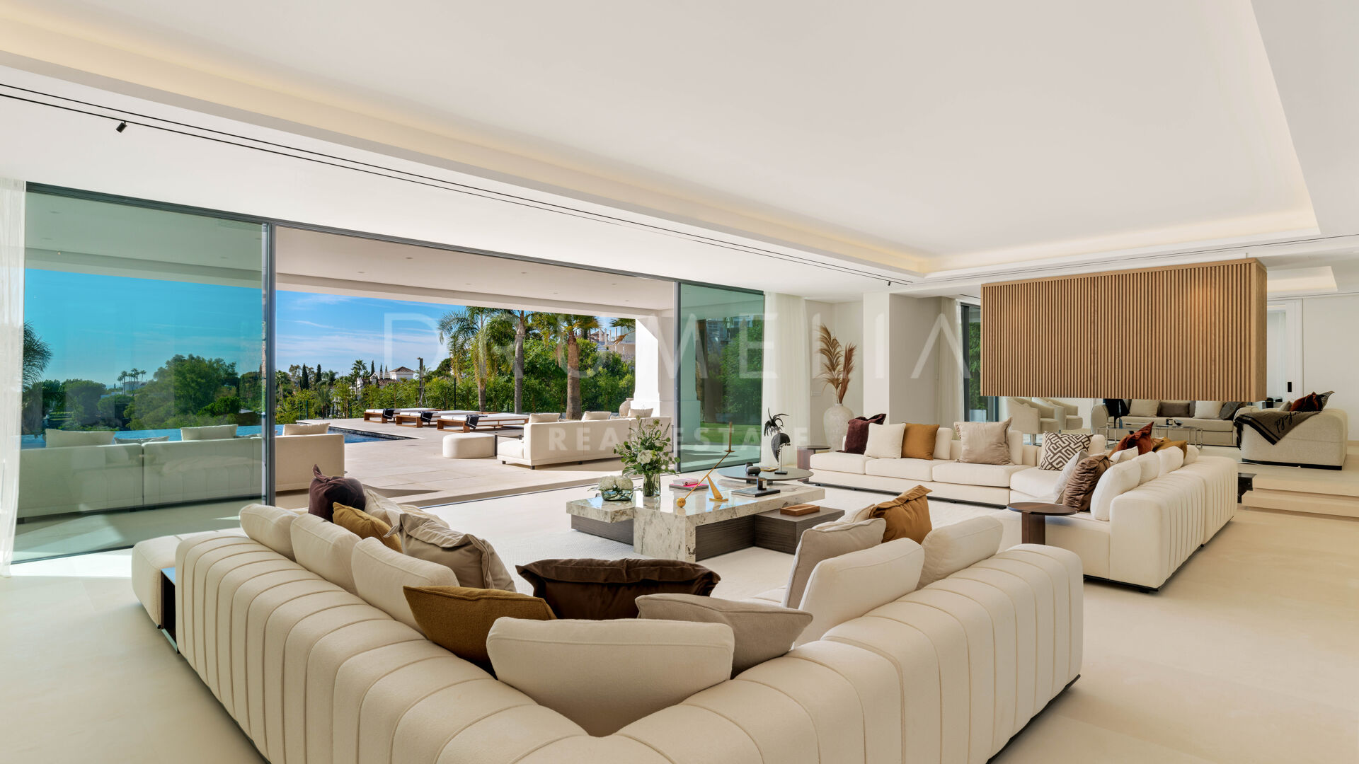 En la gran villa de 3 niveles y 7 dormitorios no se han escatimado esfuerzos para reunir los mejores materiales, la tecnología más avanzada y la artesanía para crearla. Luminoso y abierto, el nivel principal tiene un gran vestíbulo de doble altura con una gran claraboya, que hace una declaración dramática con la vista del mar a través de la habitación, una escalera doble y un ascensor que proporciona fácil acceso a todas las plantas. La amplia sala de estar está flanqueada a ambos lados por chimeneas abiertas que separan el salón de TV por un lado y el comedor por otro. La moderna cocina de chef, con una cocina de mayordomo separada, se abre a la zona de comedor y a un segundo salón donde puedes celebrar la reunión familiar o las copas previas a la cena cuando estés entretenido. En este nivel también hay un despacho y una suite de invitados con acceso independiente.
