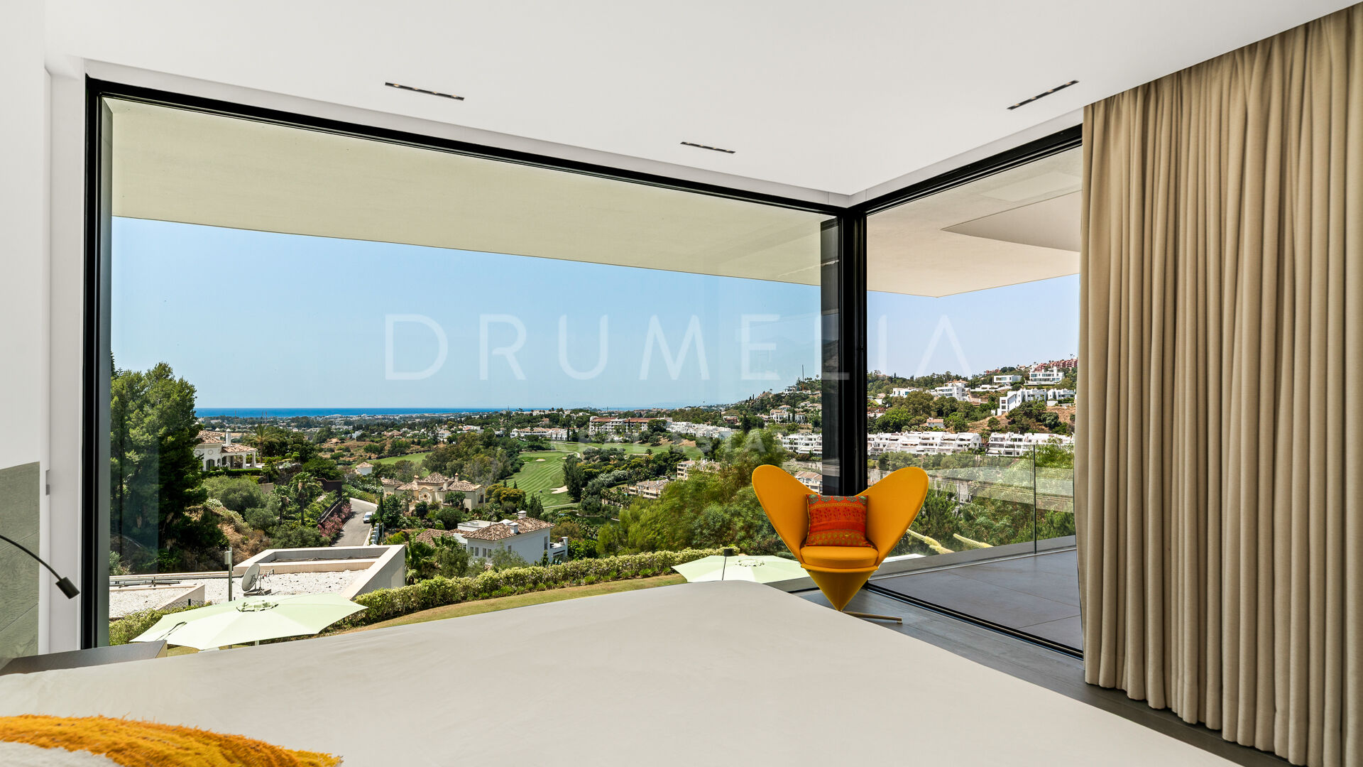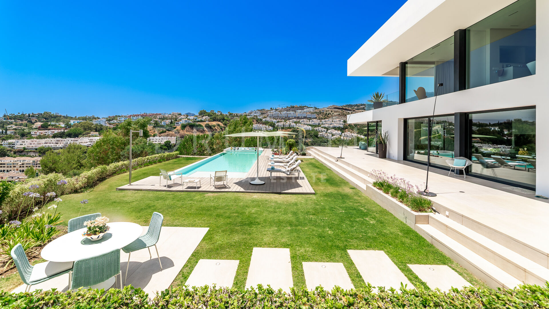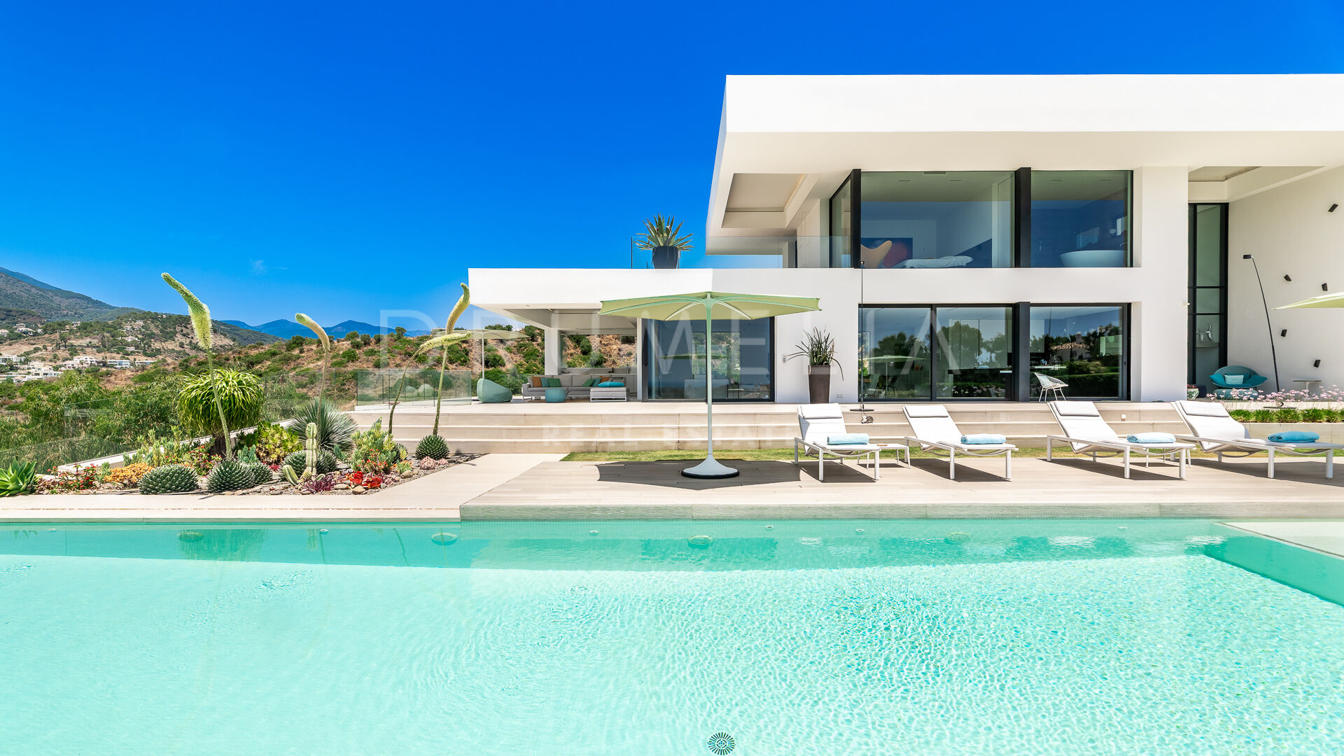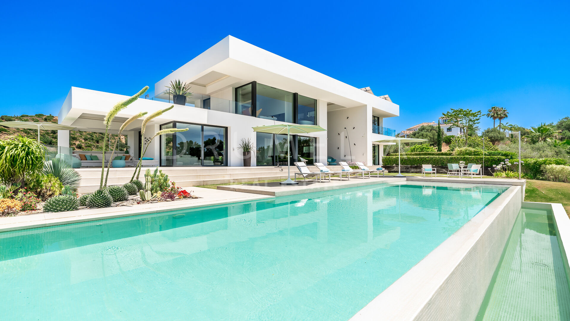 Esta villa contemporánea en Nueva Andalucía, situada en una exclusiva urbanización cerrada a solo 10 minutos de Puerto Banús, destaca por su lujo, privacidad y espectaculares vistas panorámicas al mar, la montaña y el campo de golf. Construida sobre una parcela elevada de 2.750 m², cuenta con 770 m² edificados y 480 m² de terrazas, con un diseño moderno de líneas limpias, abundante luz natural y un sistema domótico completo que garantiza eficiencia energética y confort.