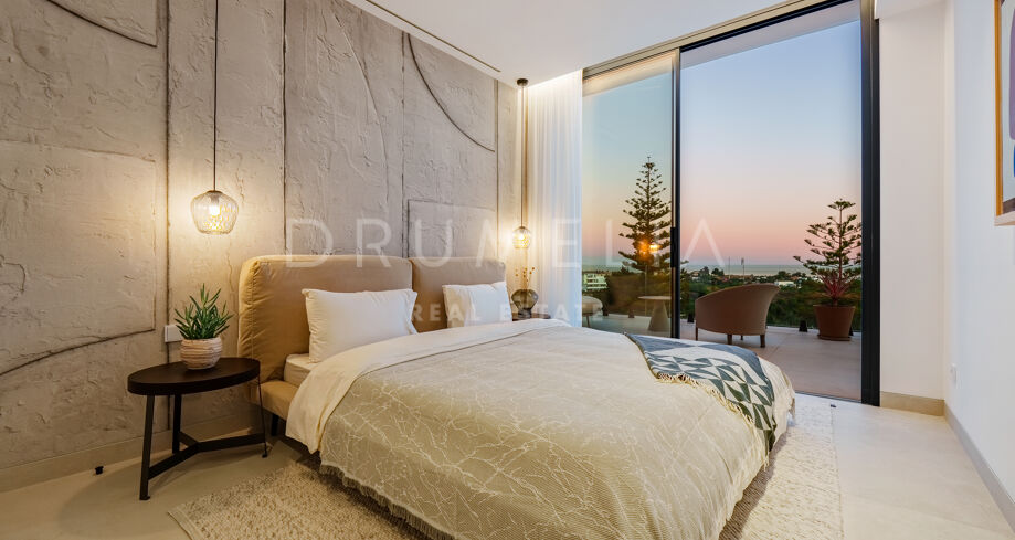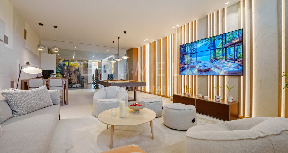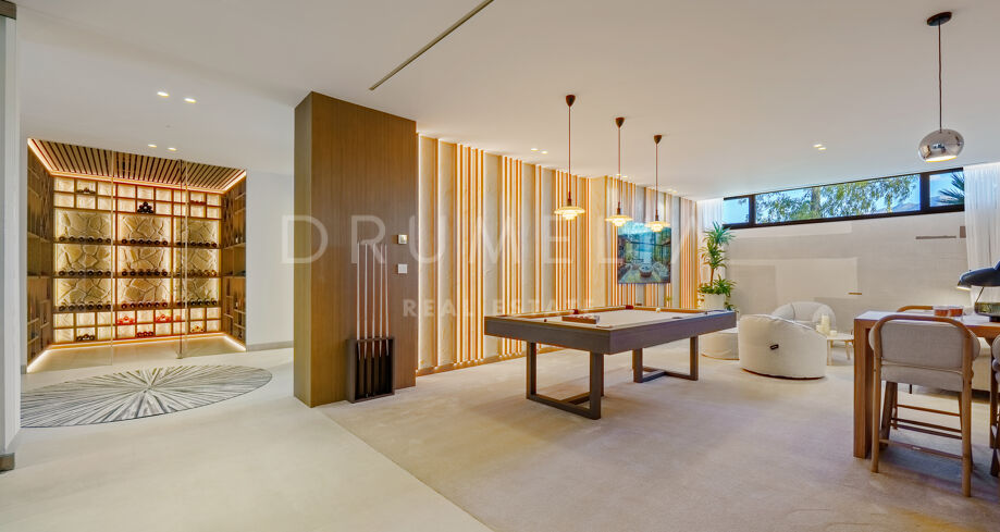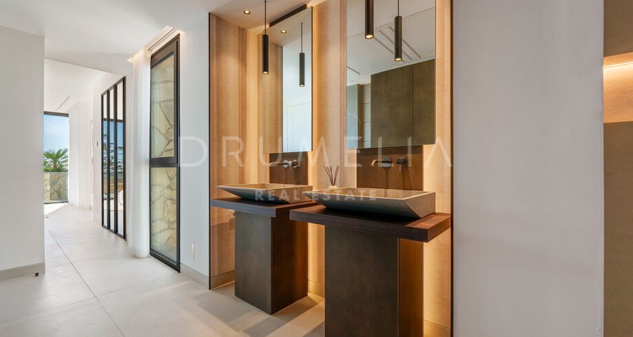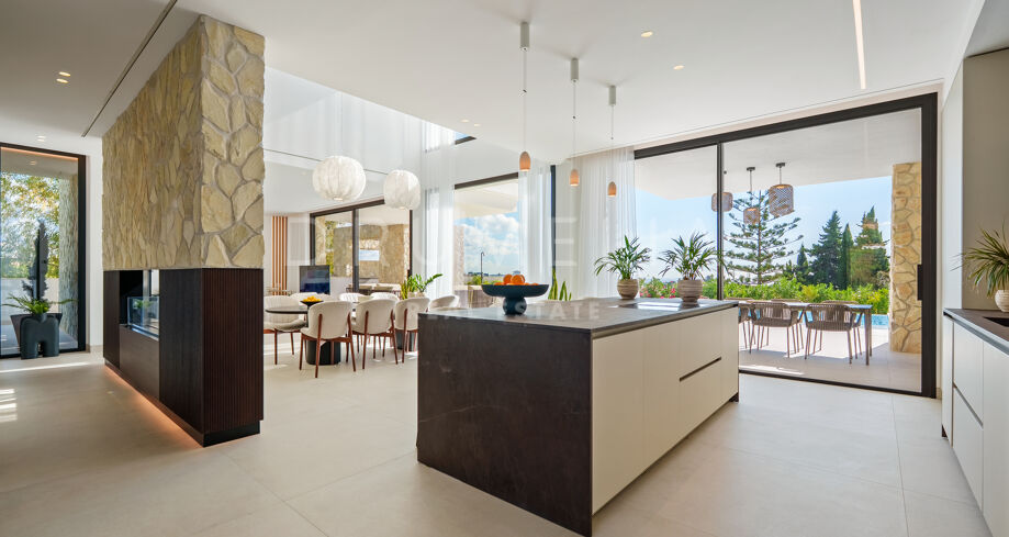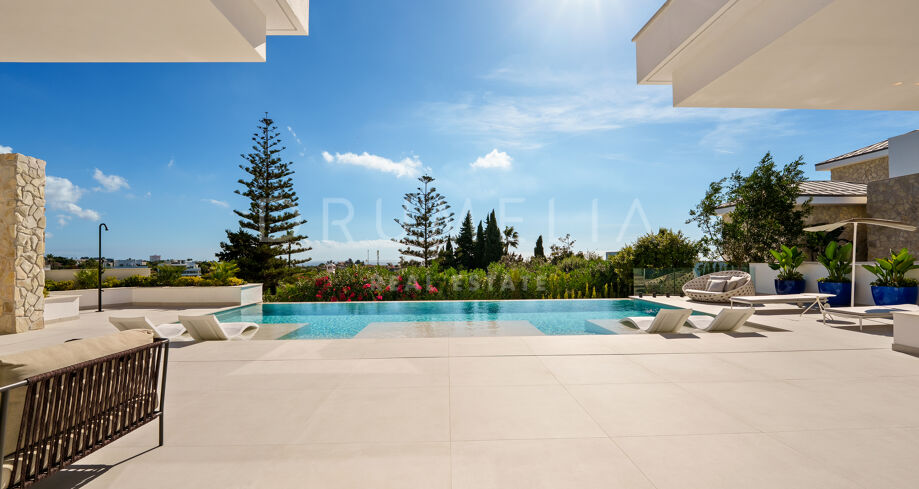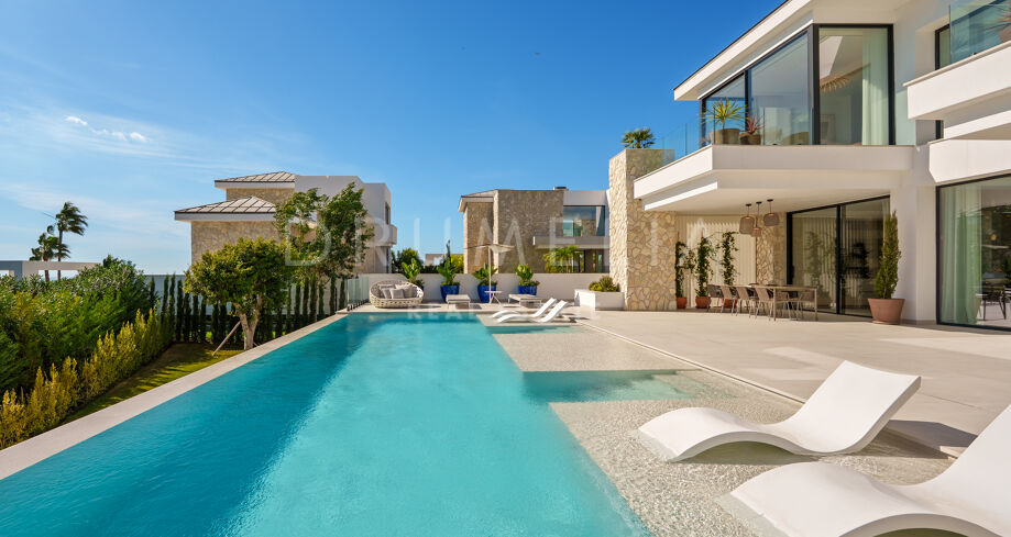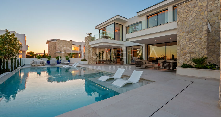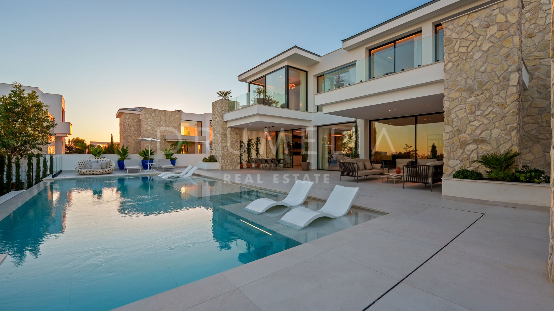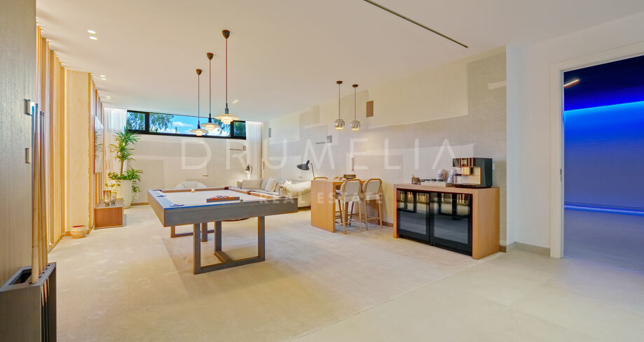 Con una superficie de 605 m² distribuidos en tres niveles, la villa ofrece cinco dormitorios y cuatro baños, todos diseñados con la máxima atención al detalle. La planta principal cuenta con espacios abiertos de salón y comedor que se integran perfectamente con amplias terrazas y una impresionante piscina infinita de 73 m², creando un estilo de vida interior–exterior ideal tanto para el entretenimiento como para el descanso. Los ventanales de suelo a techo inundan los interiores de luz natural, resaltando las líneas limpias y los acabados contemporáneos de la villa.