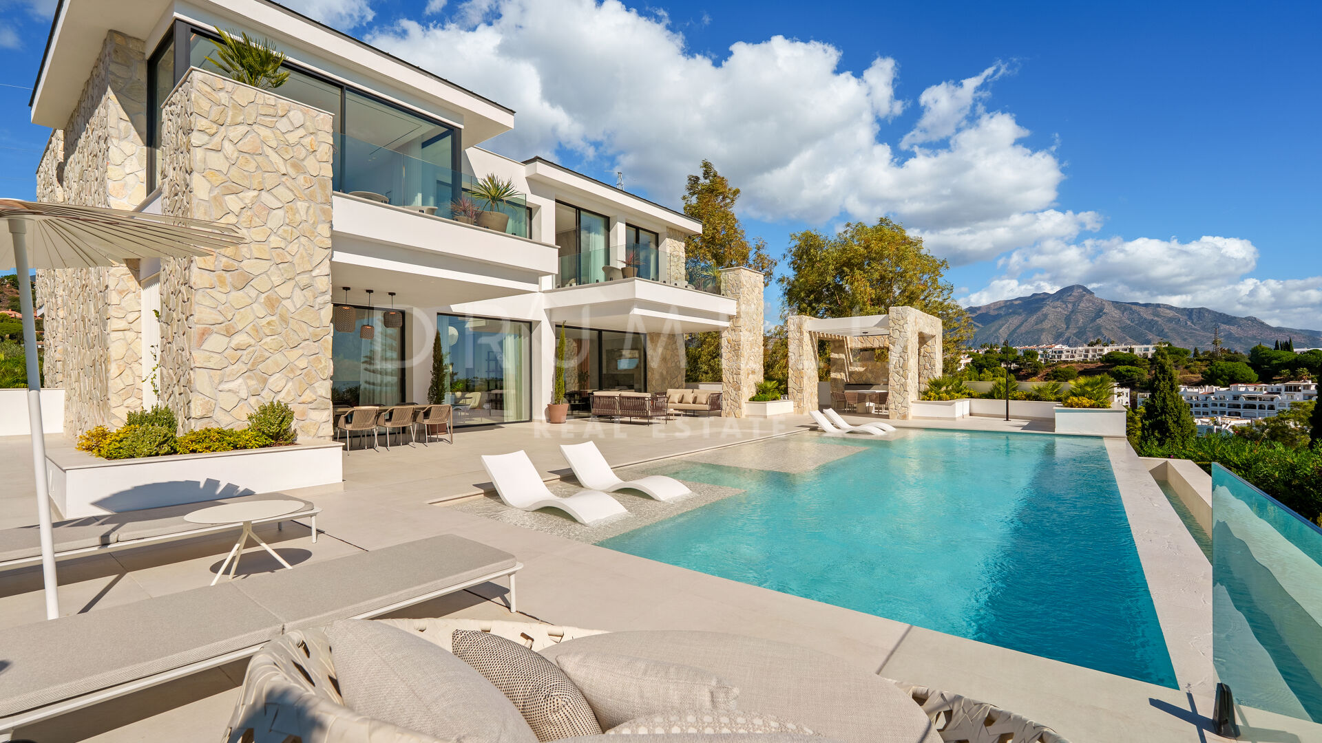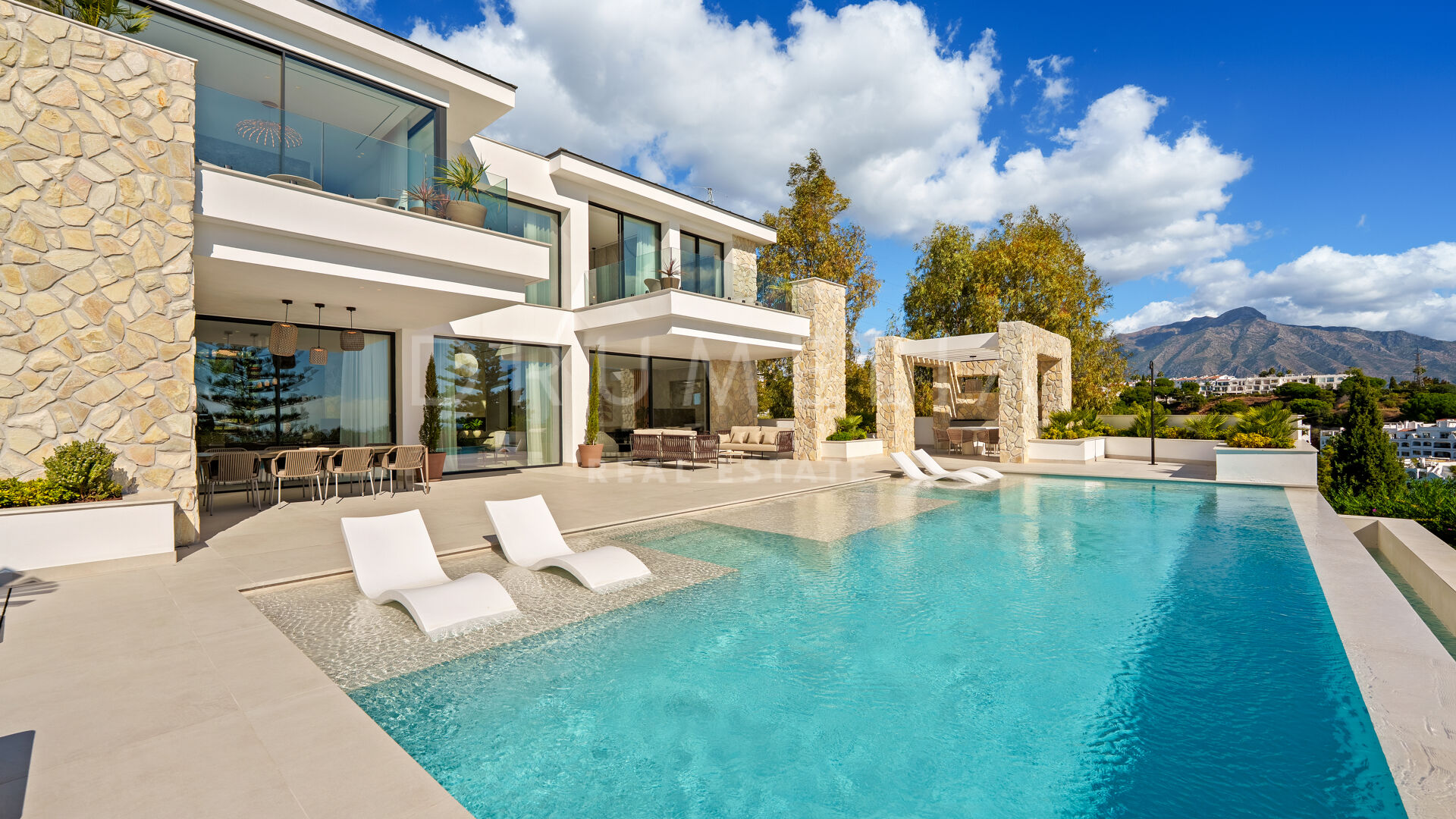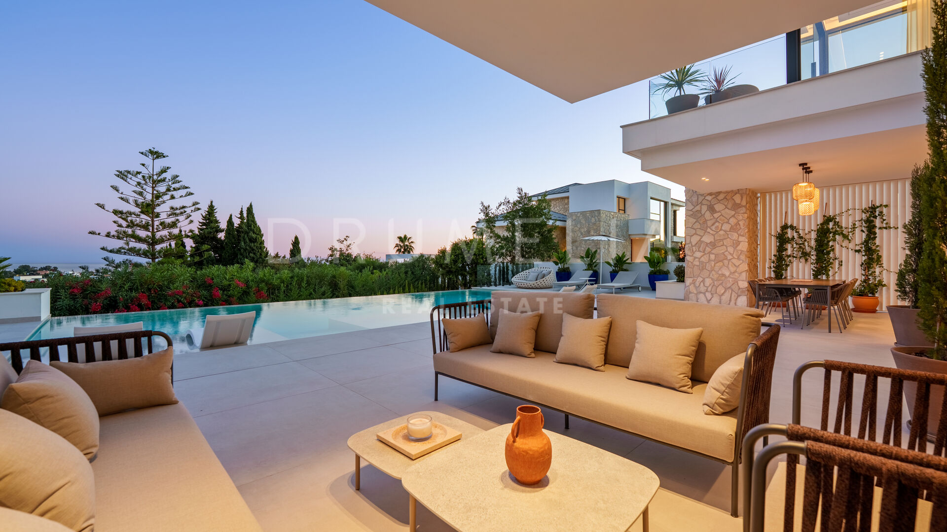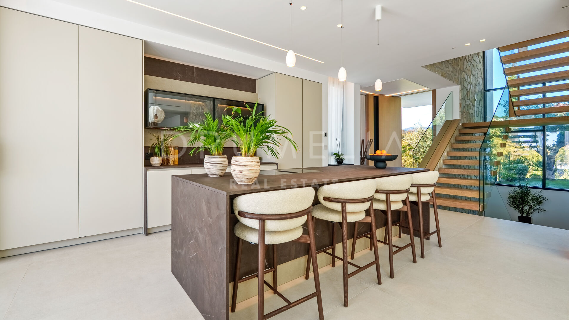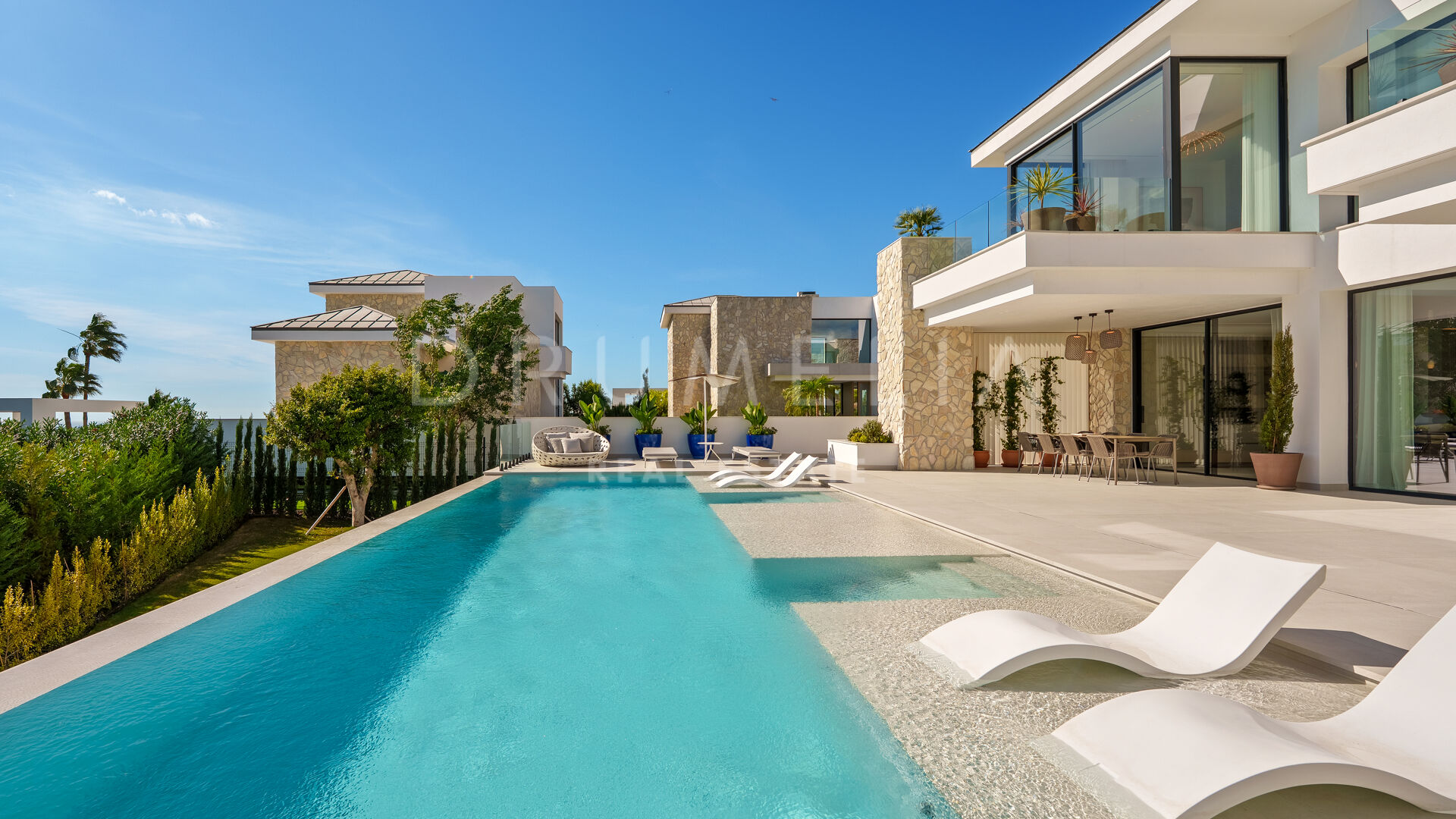 Con una superficie de 605 m² distribuidos en tres niveles, la villa ofrece cinco dormitorios y cuatro baños, todos diseñados con la máxima atención al detalle. La planta principal cuenta con espacios abiertos de salón y comedor que se integran perfectamente con amplias terrazas y una impresionante piscina infinita de 73 m², creando un estilo de vida interior–exterior ideal tanto para el entretenimiento como para el descanso. Los ventanales de suelo a techo inundan los interiores de luz natural, resaltando las líneas limpias y los acabados contemporáneos de la villa.