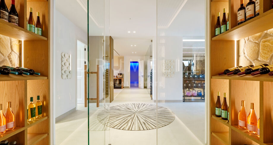 La planta superior está dedicada al descanso, con elegantes suites de dormitorios, incluyendo un amplio dormitorio principal con terraza privada, vestidor y vistas impresionantes. La planta de entretenimiento ofrece un refugio de lujo con gimnasio privado, bodega, sala de cine y garaje para varios vehículos, además de lavandería y zona de almacenamiento, todo diseñado para combinar comodidad y funcionalidad con estilo.