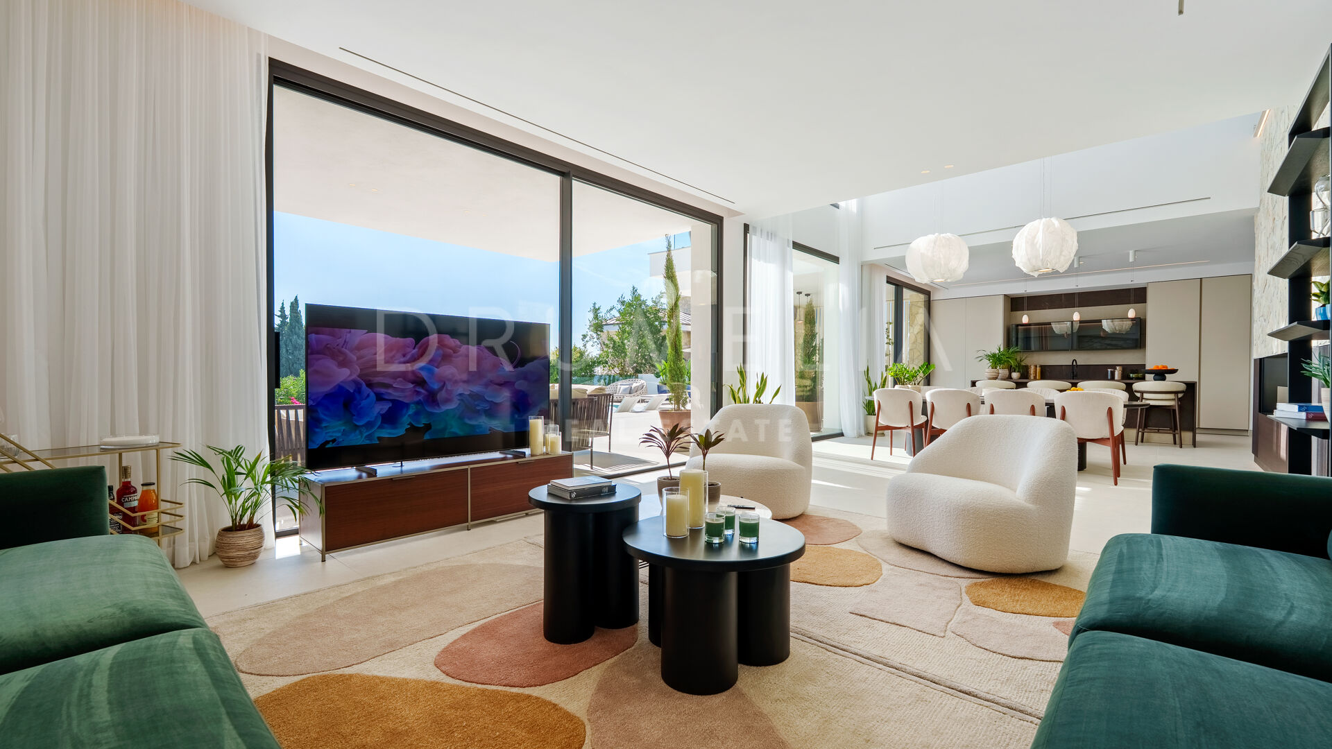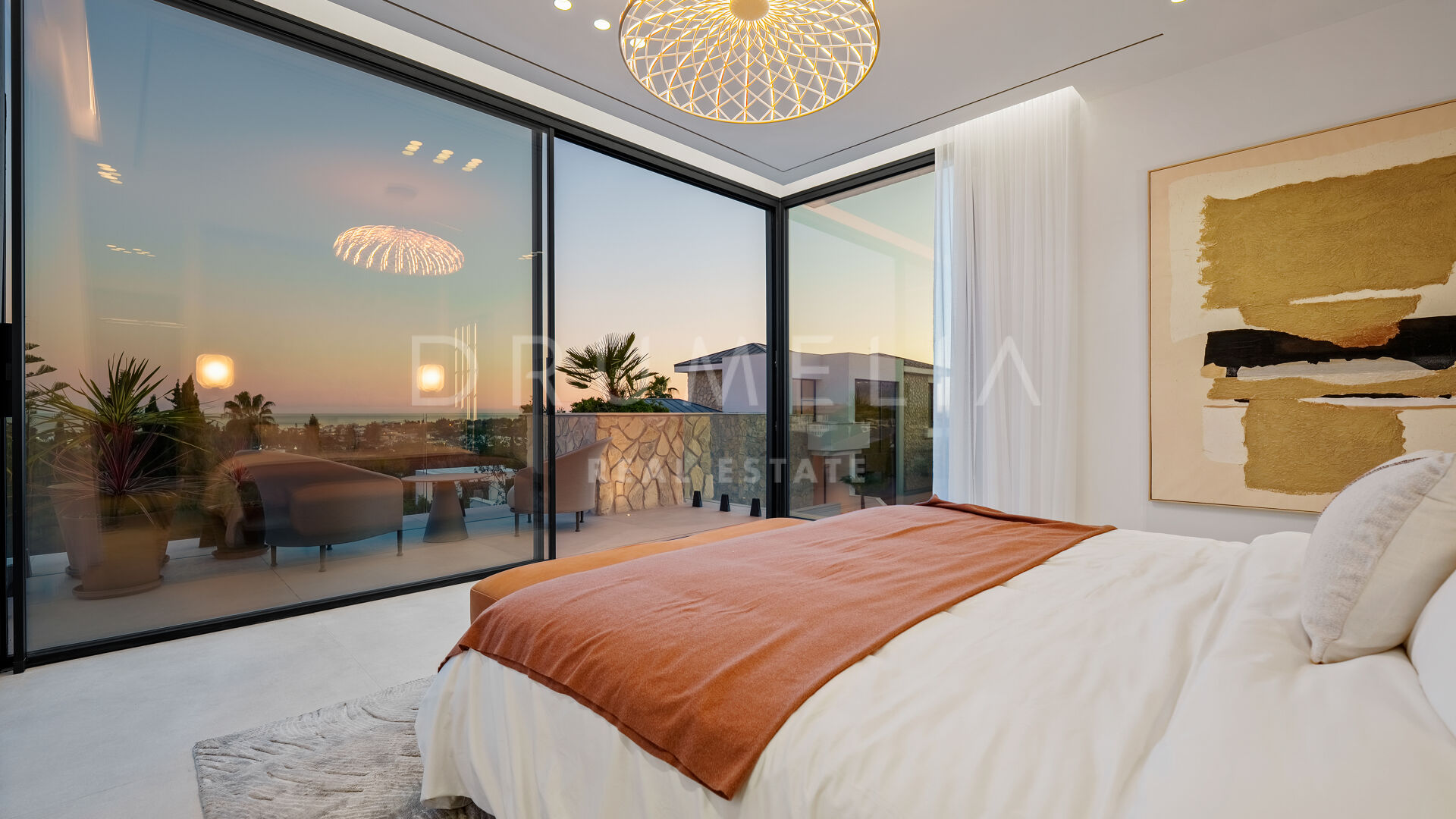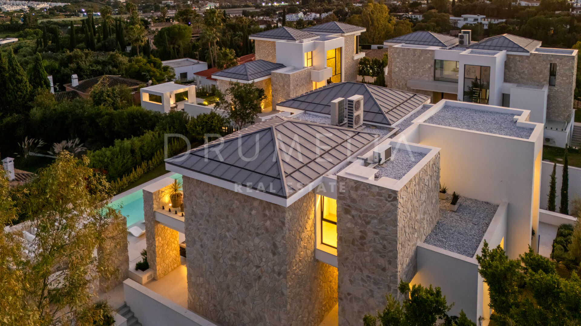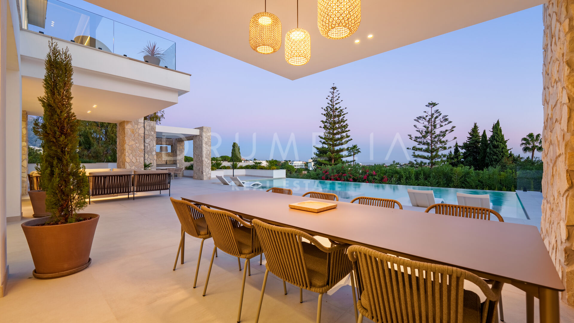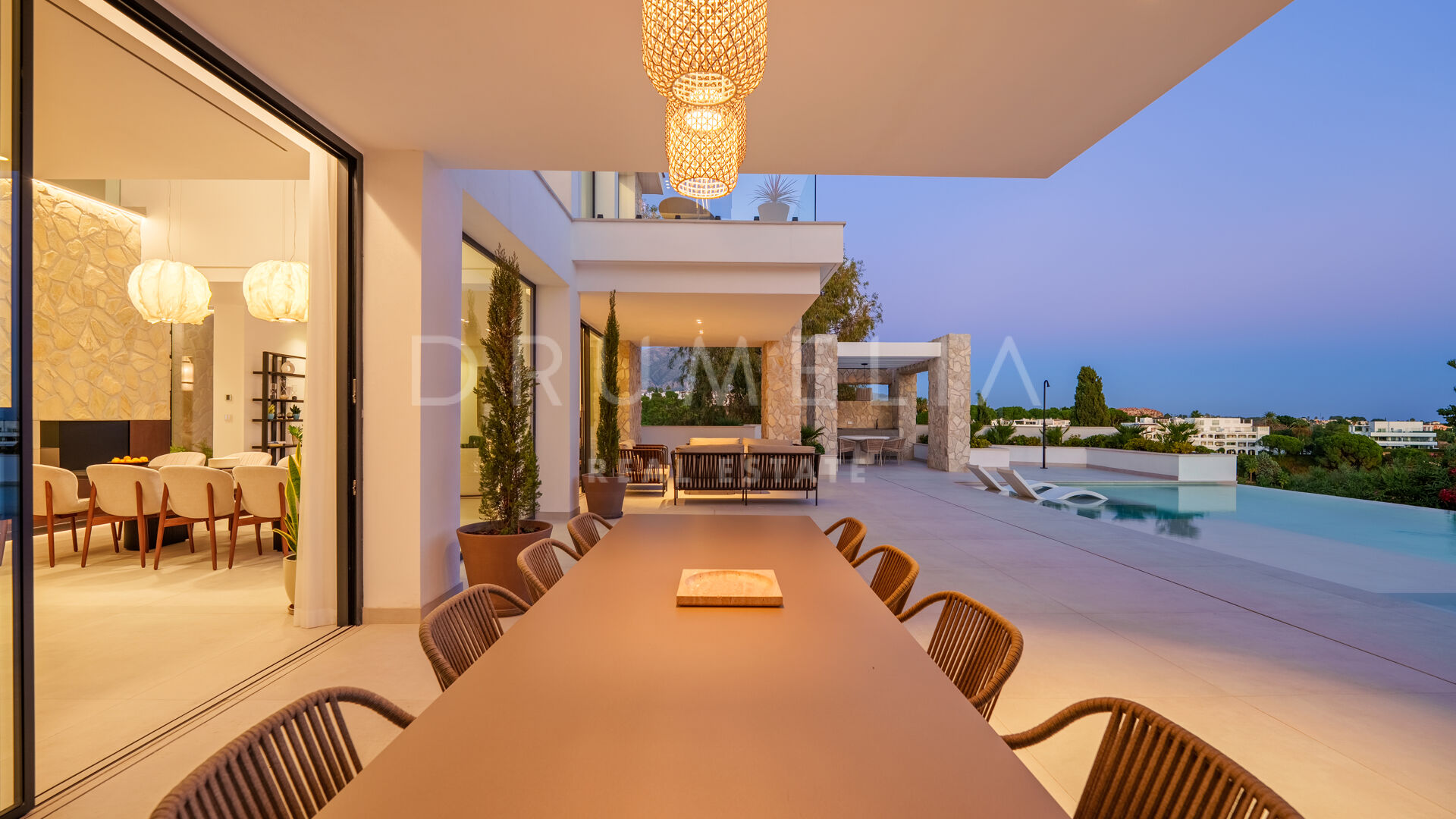 Con 605 m² distribuidos en tres niveles, la propiedad ofrece cinco dormitorios y cuatro baños. La planta principal presenta espacios abiertos de salón y comedor que se conectan con amplias terrazas y una piscina infinita de 73 m², creando un estilo de vida interior–exterior fluido y luminoso gracias a los ventanales de suelo a techo y los acabados contemporáneos.